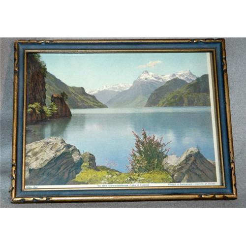 Framed Print of Lake Lucerne it was printed in Switzerland. It says "Edition Stehli" . It is behind glass. The measurment is of the outer frame 6 5/8 x 8 1/2. <p> The pie crust frame is goes with it perfectly. <p> The condition is very good. There is a couple so very small imperfections in the glass but is it is not noticiable. I cannot tell if these are small scratches or just imperfections in the glass. The print is just a hair too small for the frame and it does shift around a bit. It only requires tapping on one side to get it centered again. The print has a white border. The back is sealed with paper. <p> I am very fond of the is scenic print This is another item I have had hanging my home for years.