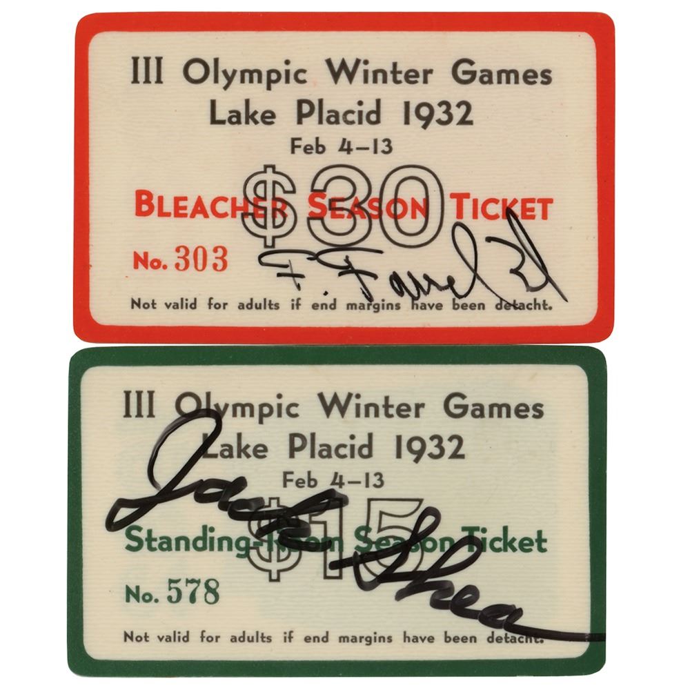 Two original 3.75 x 2.25 celluloid season ticket passes for the Lake Placid 1932 Winter Olympic Games: an orange-bordered bleacher season ticket, signed in black felt tip by Franklin Farrell III, goaltender for the silver medal-winning American ice hockey team; and a green-bordered standing room season ticket, signed in black felt tip by speedskater Jack Shea, who won gold medals in the 500m and 1500m events. In fine condition.