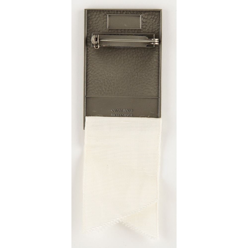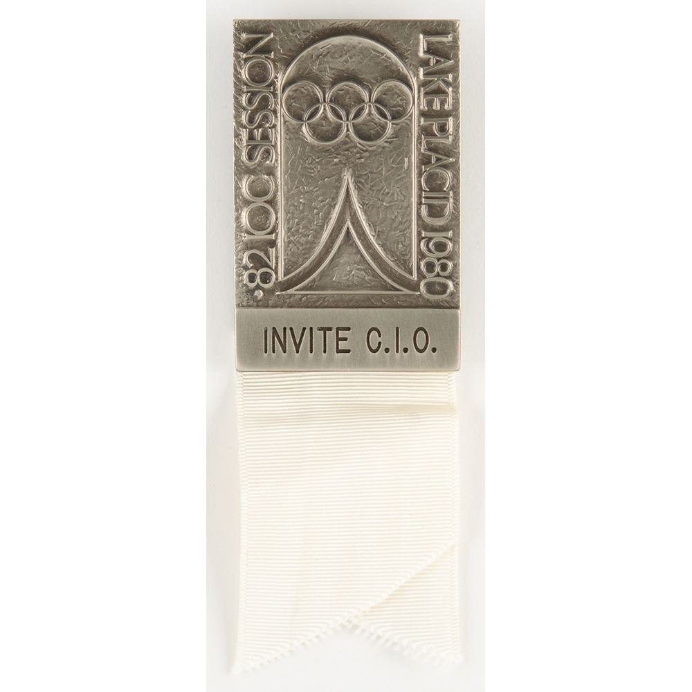 Nickel silver badge from the 82nd International Olympic Committee session held in Lake Placid, New York, in 1980, measuring 37 mm x 57 mm with white ribbon below, featuring an Olympic emblem flanked by raised text, "82 IOC Session, Lake Placid 1980," and engraved on the lower tablet, "Invite C.I.O." This session was held in Lake Placid in 1980 on the occasion of the XIII Olympic Winter Games.