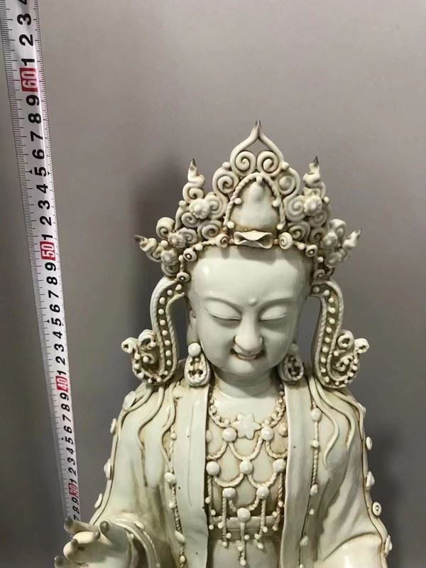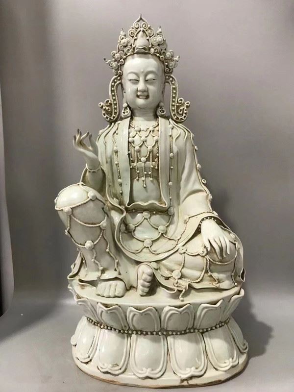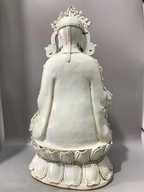 This Lake Tian Kiln Buddha statue is exquisitely carved, embodying elegance and solemnity in Buddhist art. The white glaze adds a sense of purity and tranquility, with the Buddha's serene expression reflecting deep inner peace and wisdom. The fine details and intricate decorations on the statue demonstrate superb craftsmanship, offering a profound aesthetic experience.