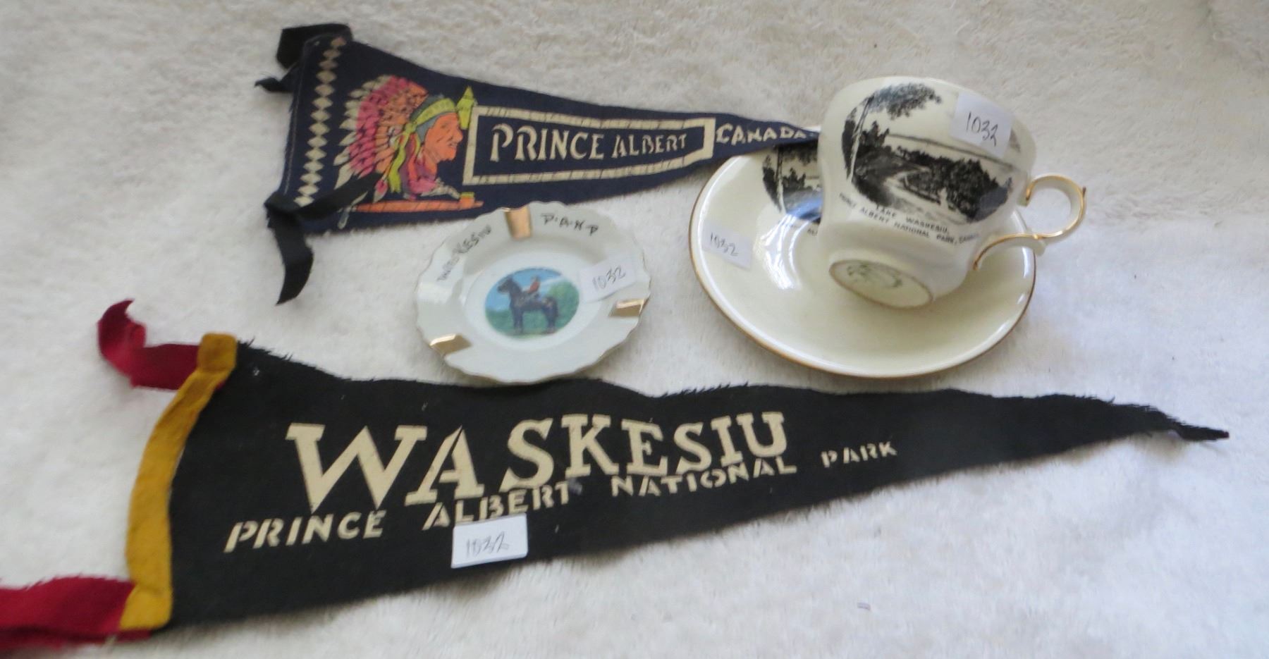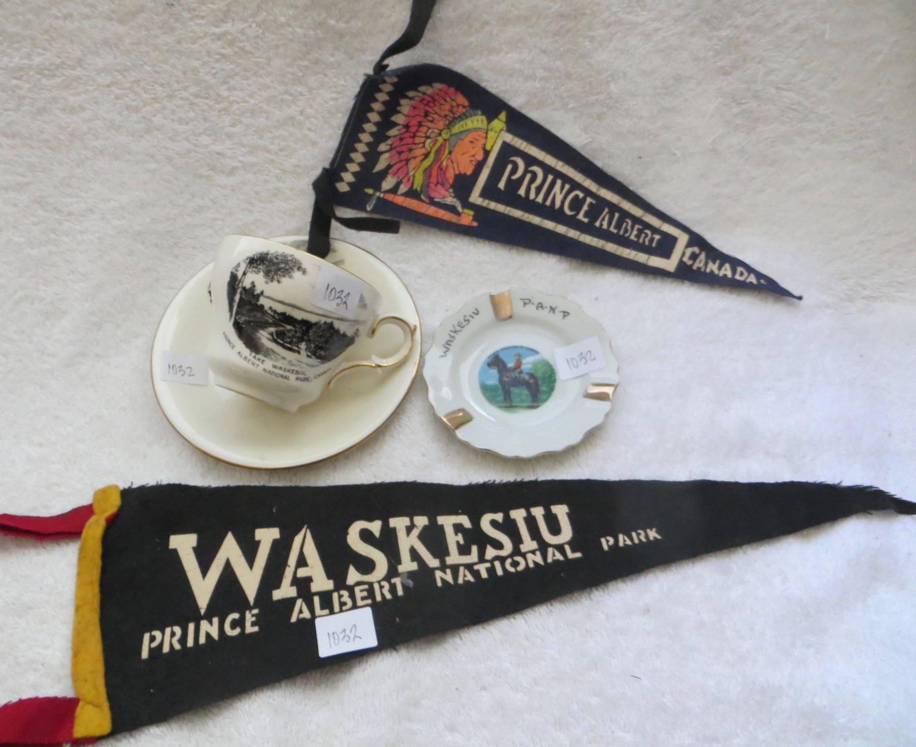 Lake Waskesiu cup n saucer, pennants and small RCMP plate