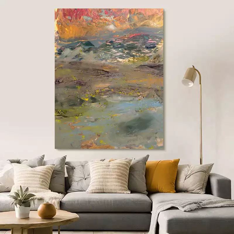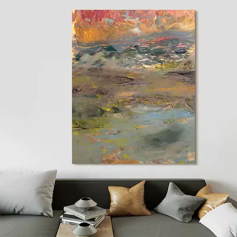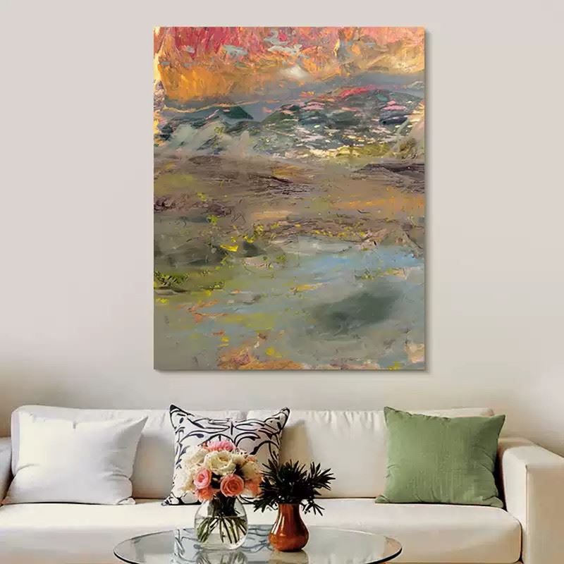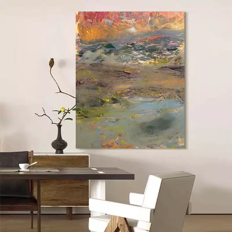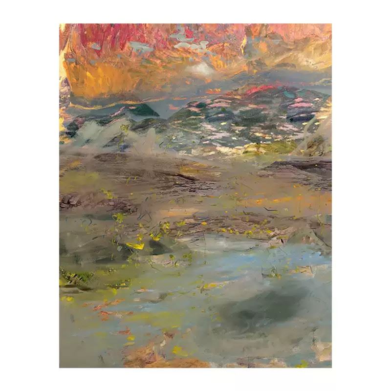 This artwork uses rich color layers and dynamic brushstrokes to depict the reflections of light on the lake’s surface. The interplay of warm gold and cool water conveys a serene and mysterious beauty, as light and water gently collide on the lake's surface. Dimensions: 24 x 31 inches.