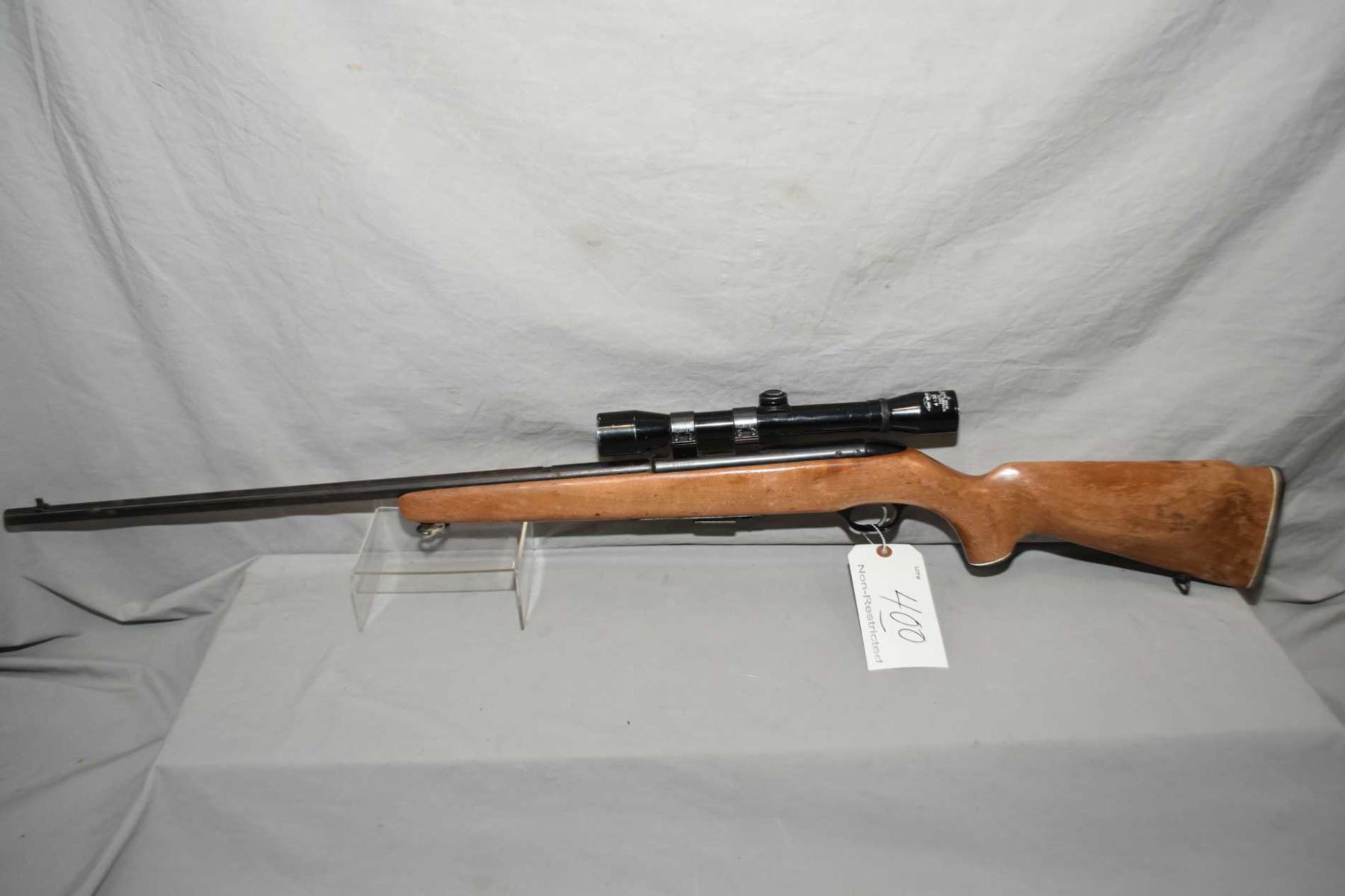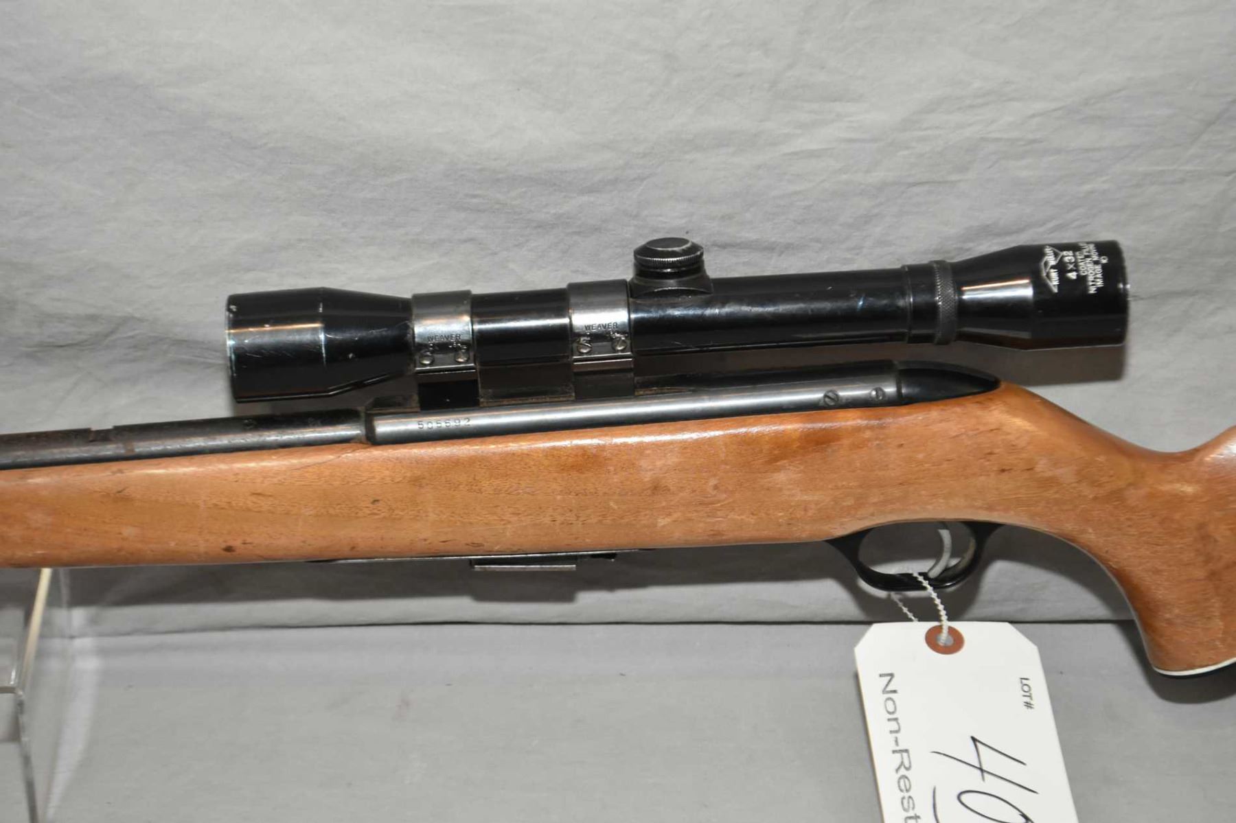 Lakefield Mossberg Model 640 KC Chuckster .22 Mag Cal Mag Fed Bolt Action Rifle w/ 24 1/2" bbl [ blued finish, starting to fade with surface rust and some marks, back sight removed, and fitted w/ Kurt Muller 4 x 32 Scope pistol grip stock with variou marks, scratches, flaking varnish, part of a sticker, sling swivels, white lined grip cap and butt plate ] Ser # 505692