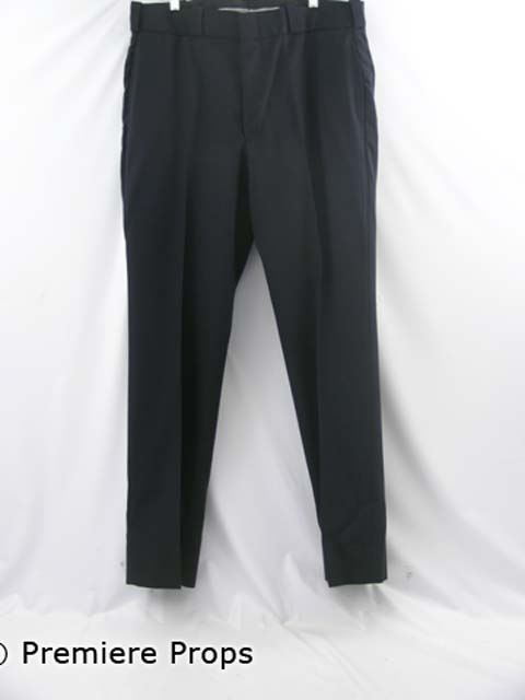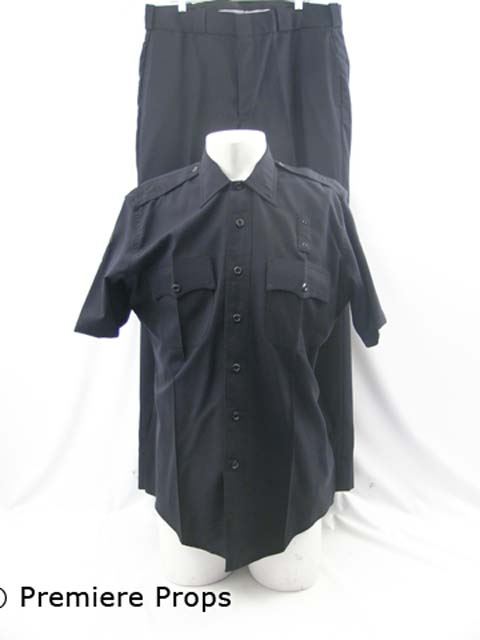 Abel's (Samuel L. Jackson) dark navy wool w/ silver/black patches on each arm "Elbeco" s/s button up uniform shirt (size 16.5), dark navy wool "Elbeco" pleated uniform pants (size 38R), white cotton "Calvin Klein" s/s crew neck t-shirt (size XL)