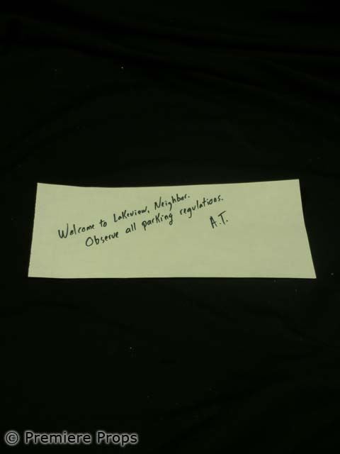 Abel's yellow Parking Violation ticket given to Mattsons w/ note "Welcome to Lakeview, Neighbor. Observe all parking regulations. A.T." written on back (approx. 9" x 4") (screen used)