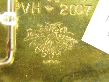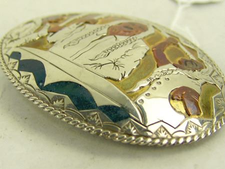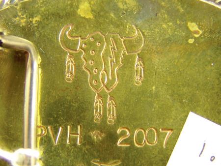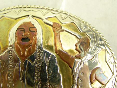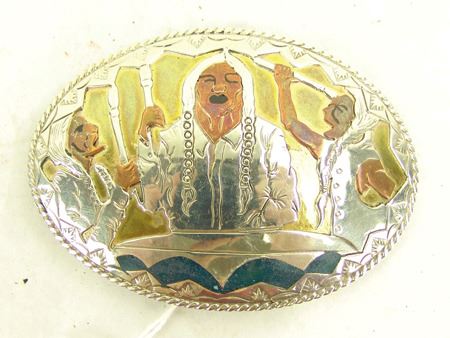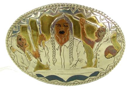 Ca. 2007, Original brass backed German silver buckle featuring singers and drummers and inlaid with copper, brass, and buffalo horn. Very good condition. Signed PVH (Pretty Voice Hawk). 2-1/2" x 3-1/2"