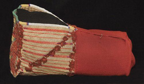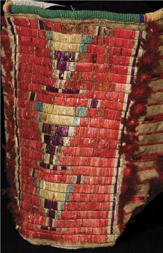 Lakota Cradle Cover. 29" x 13”. Beaded and quilled buffalo hide with Germantown yarn tassels. Red trade wool and patterned cotton lining. c. 1870s. Fine condition. (est $4,500-6,000).