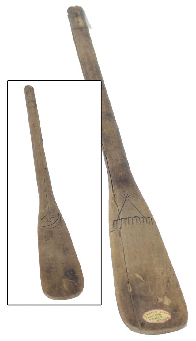 19th Century, Carved wooden cooking paddle with carvings of celestial and animal images on each side - old tag reads "Lakota Sioux #B636". 21-1/2"