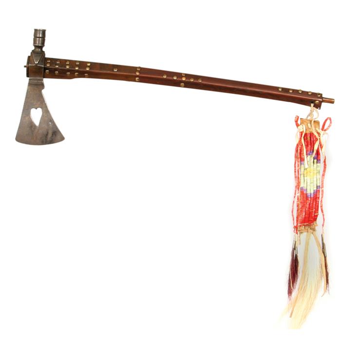 Lakota Pipe Tomahawk. 23" long. Iron trade head is 8 1/2". File burned and tacked haft. 19" quilled drop. C. 1880-1890. (est $2,500-3,500)