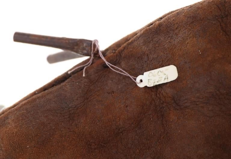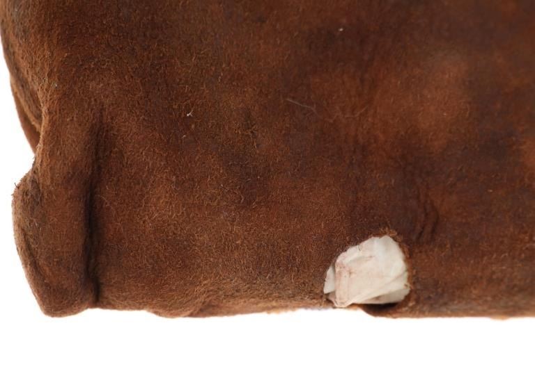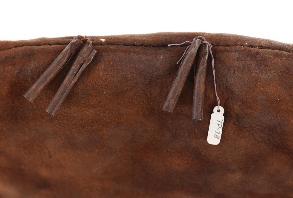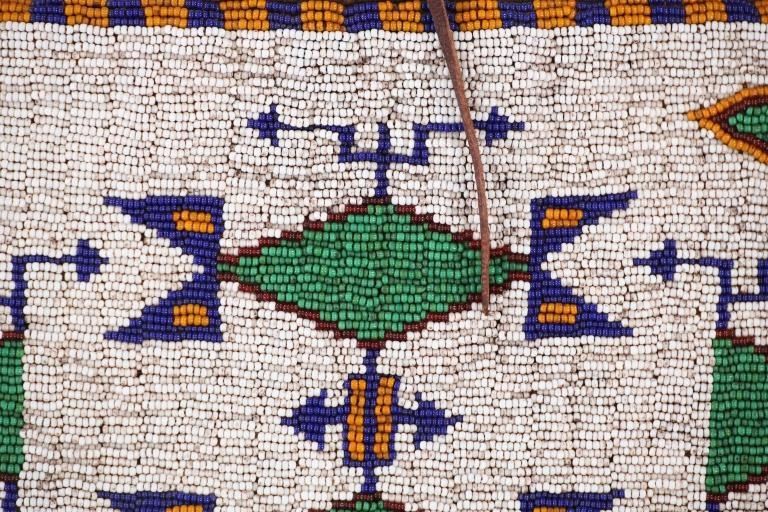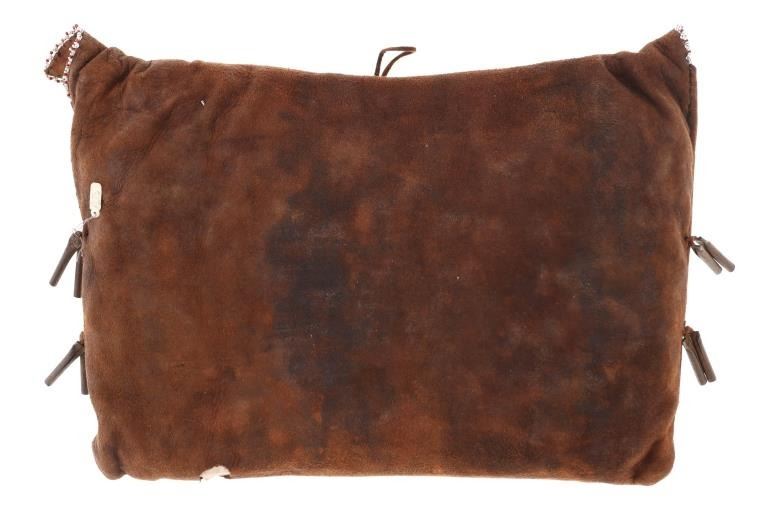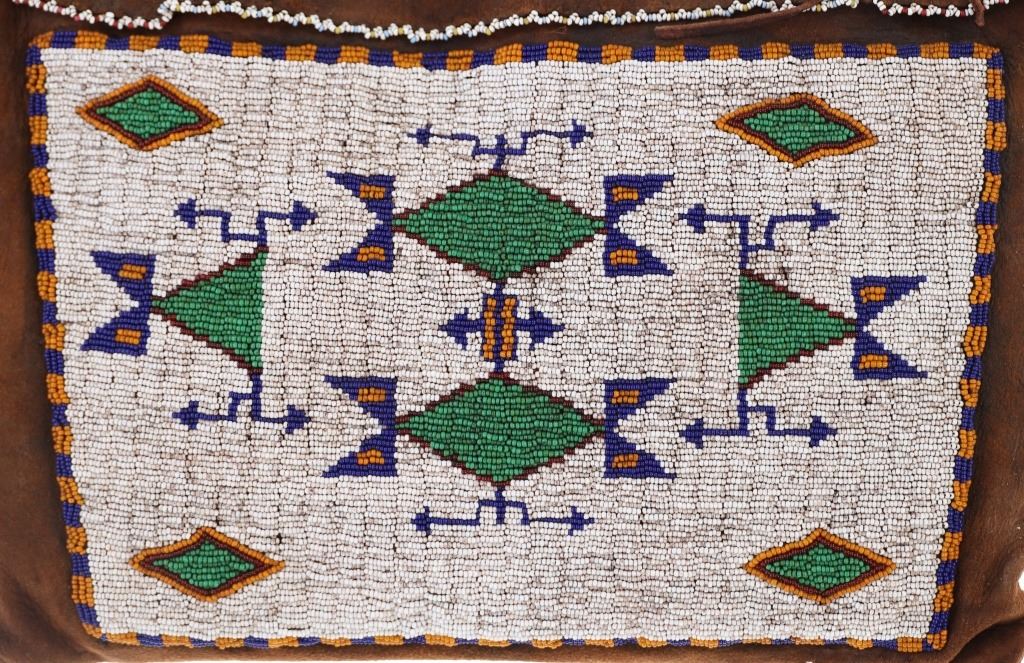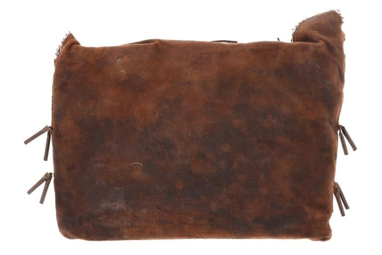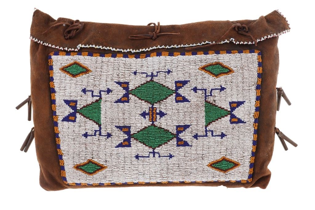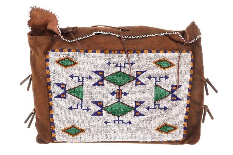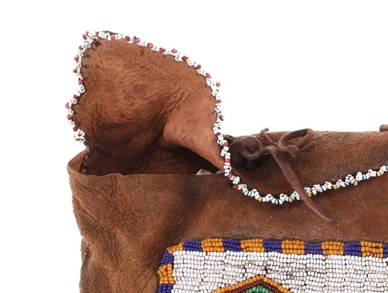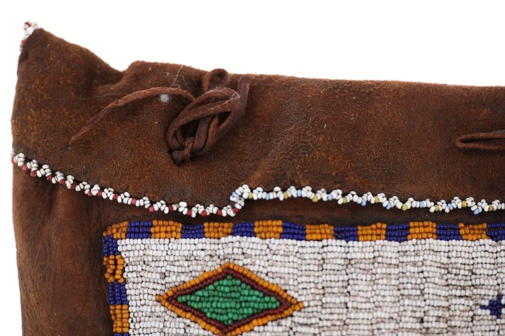 The lot features a classic set of beaded hide possible tipi bags from the Lakota Sioux with a nice older vintage 20th-century age. The set shows a typical sized possible or tipi / tepee bag comprised of tanned hide with a dark finish color possibly indicating a moose or elk hide that was further painted showing large sections of classic geometric beadwork at the fronts of each. The beadwork shows classic Lakota geometric patterns and symbols done in glass trade seed beads showing a chalk white background with symbols and border in colors of butterscotch yellow, cobalt, green, and semi-transparent red. The bags top flaps have a fancy beaded edge in glass trade seed bead colors of chalk white, greasy yellow, red white heart, and greasy light blue. The hide has a unique dark red to brown painted dyed color and supple soft finish. The outside edges have metal rolled jingle dangle cone fringes. The tanneed hide bags have some loss to the finish o the back and one small hole on the bottom of one bag but overall display wonderfully. Each bag measures 15-inches wide by 10-inches high by about 3-4 inches deep.