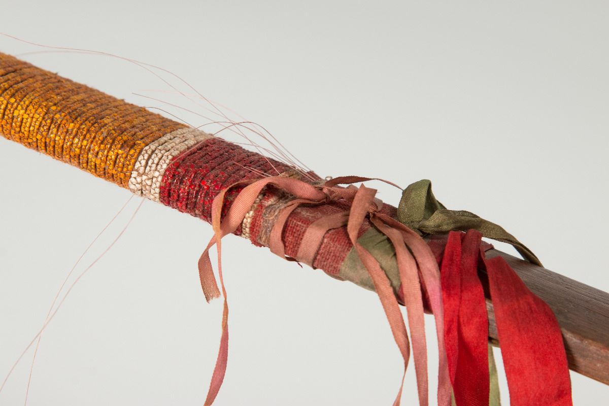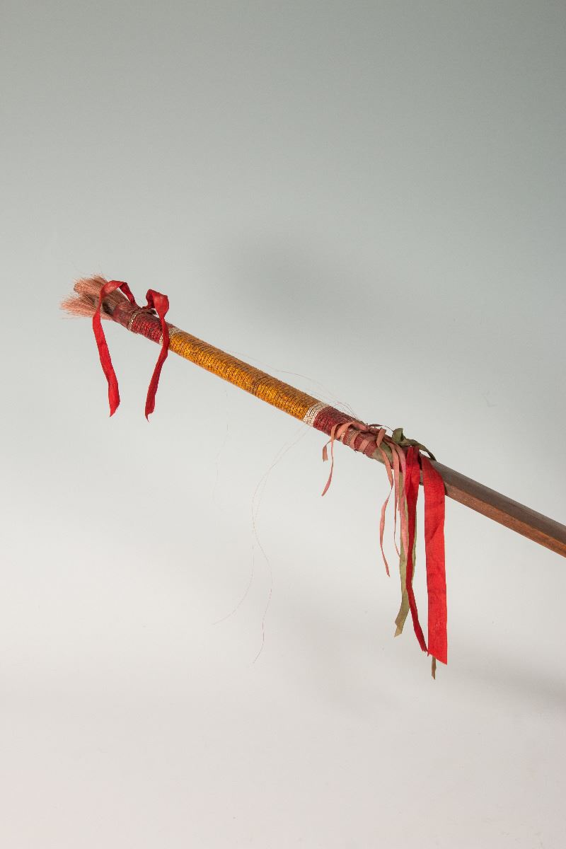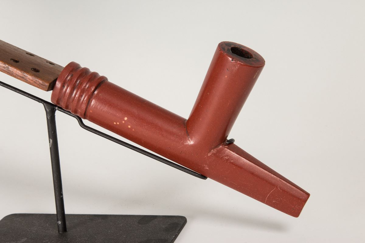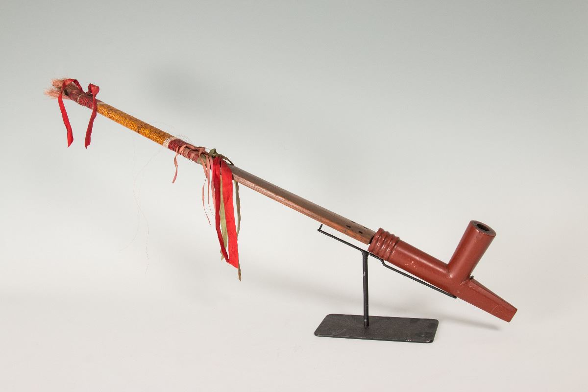 Lakota Sioux Catlinite Pipe and Quilled Pipestem. Pipe bowl is 7 ¾" long. Shows nice, high-relief carved rings at the insert tip. Circa 1880. Pipestem is 22 ¾" long and accented with red, white and yellow quillwork, horsehair and trade cloth. Late 19th century.