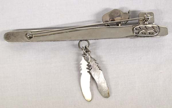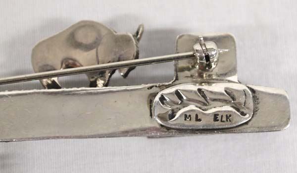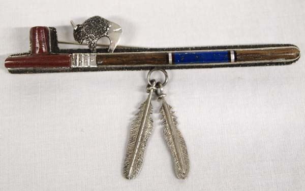 Native American Lakota Sioux Sterling Multi-Stone Peace Pipe Pin, signed ML Elk, measures 4''L x 2'', 20.07g, Artist Bio: ''Michael Little Elk was raised in South Dakota on the Rosebud Reservation where he was fortunate enough to learn the traditions of his Native Lakota-Sioux culture.'' ''Raised on the reservation by his grandmother, this creative jeweler lived in the southwest, with his Navajo wife. However, his beautifully detailed, hand-wrought pieces reflect his Plains heritage in subject matter. He liked to accent his silver work with gold details, and create variety with polish, texture, darkened silver, etc. Horses and horsemen were favorite subjects, as were el warriors, and narratibe pieces depicting Lakota lore.'' His jewelry and sculptures have been included in the collections of the Smithsonian's National Museum of the American Indian and numerous galleries around the United States