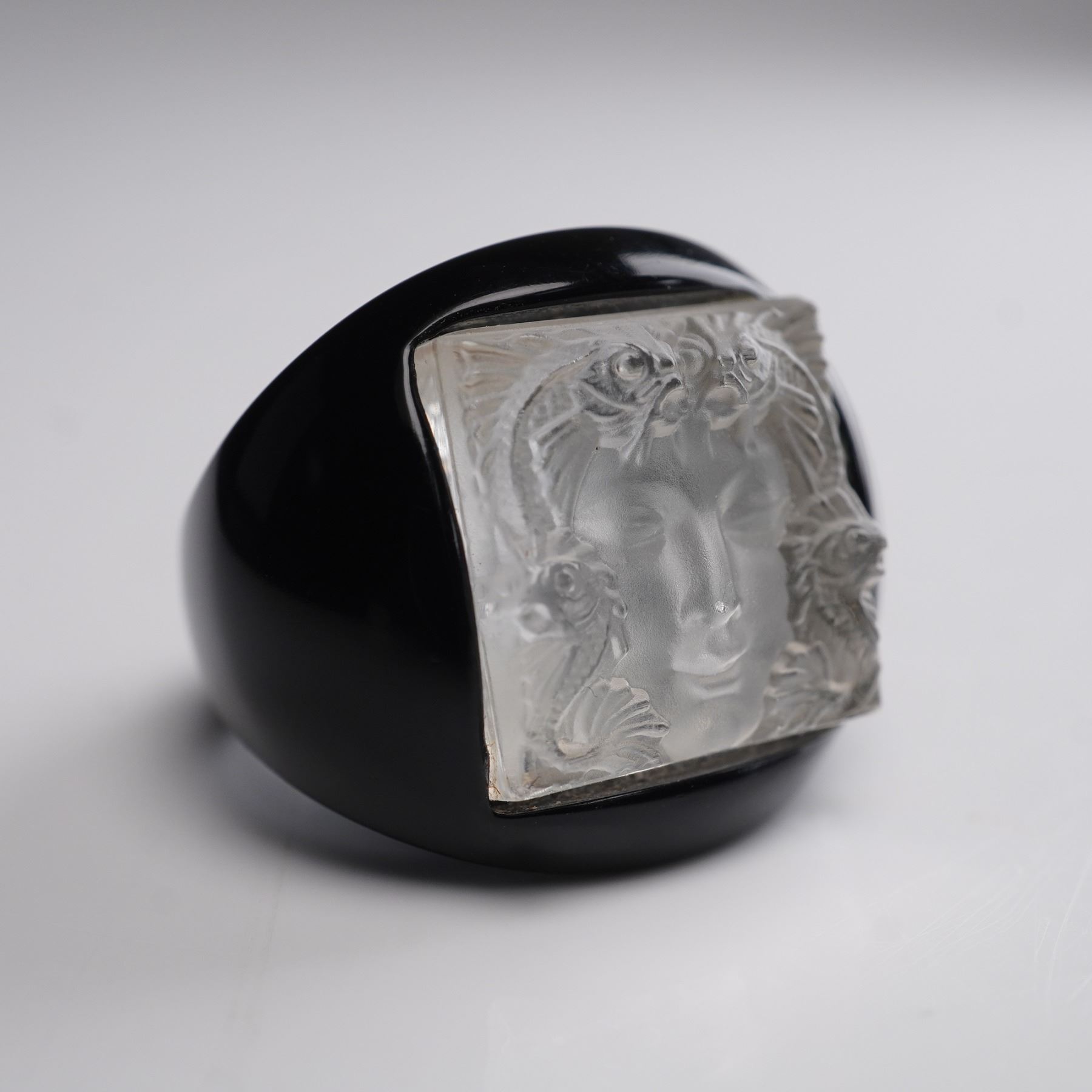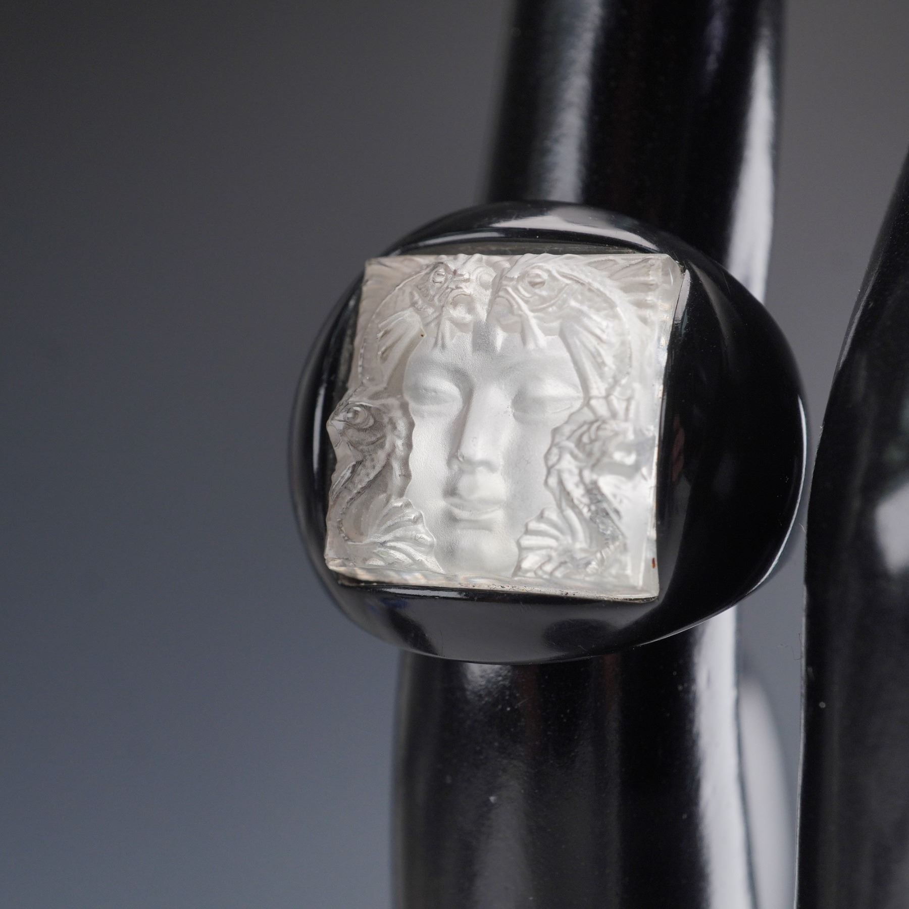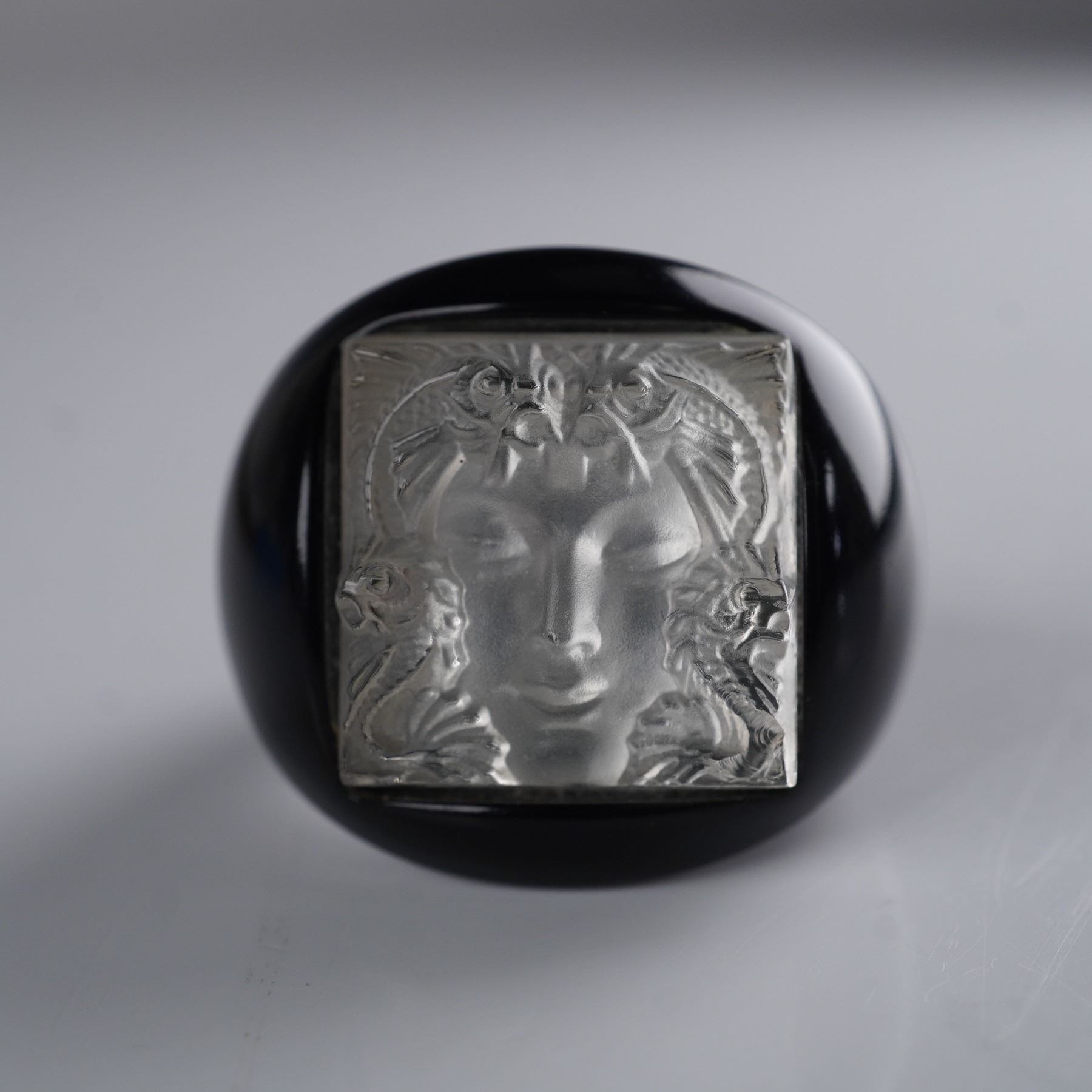 Striking black resin ring by Lalique featuring the brand's iconic Masque de Femme motif, depicting a serene female face surrounded by aquatic creatures in frosted crystal relief. The square crystal plaque is mounted on a smooth, domed black resin band, creating a bold contrast that enhances the fine detailing of the design. The interior is stamped LALIQUE, confirming authenticity. The Masque de Femme design, originally created by Rene Lalique in the 1930s, is celebrated for its blend of feminine beauty and aquatic symbolism, often representing the nymph Arethusa from Greek mythology. This motif remains one of Lalique's most enduring and collectible designs, prized for its sculptural elegance and Art Deco heritage. Size 5.