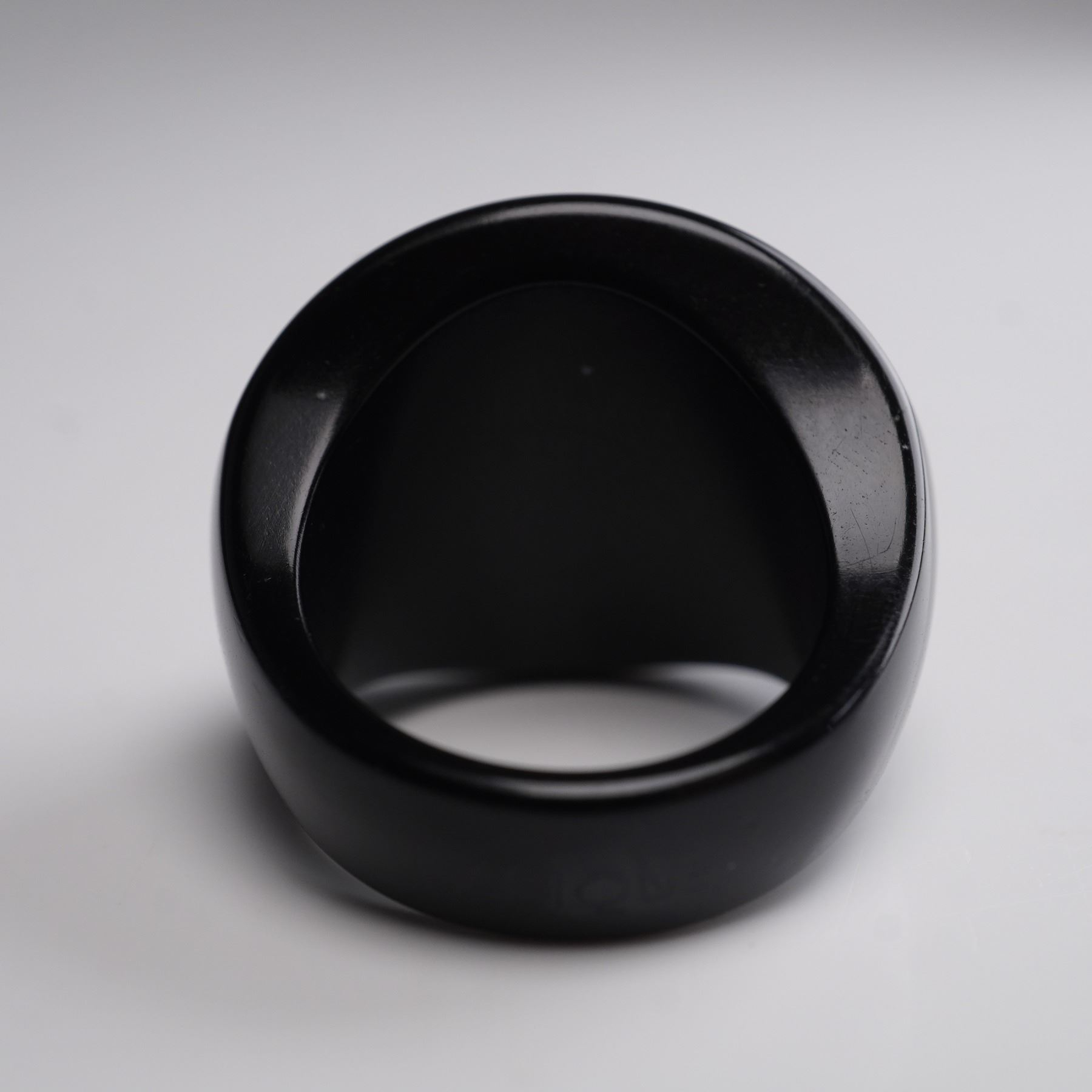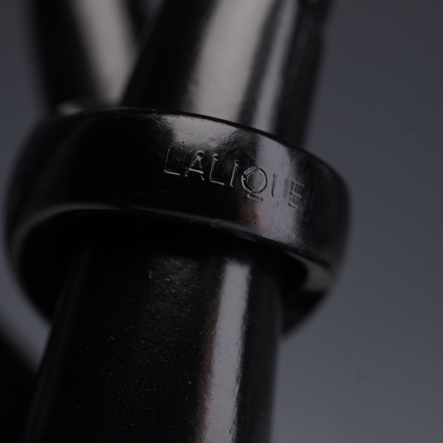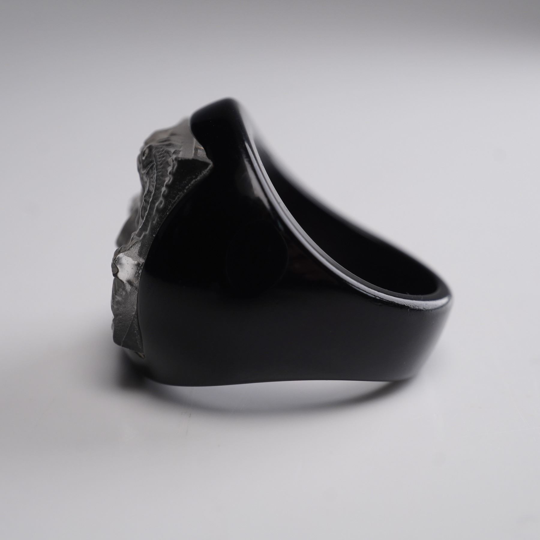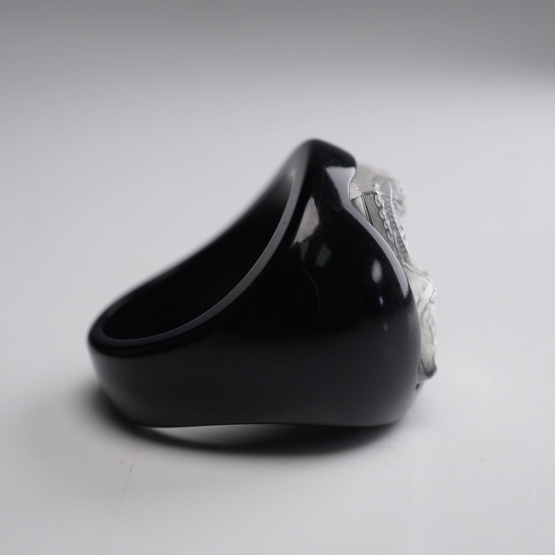 Striking black resin ring by Lalique featuring the brand's iconic Masque de Femme motif, depicting a serene female face surrounded by aquatic creatures in frosted crystal relief. The square crystal plaque is mounted on a smooth, domed black resin band, creating a bold contrast that enhances the fine detailing of the design. The interior is stamped LALIQUE, confirming authenticity. The Masque de Femme design, originally created by Rene Lalique in the 1930s, is celebrated for its blend of feminine beauty and aquatic symbolism, often representing the nymph Arethusa from Greek mythology. This motif remains one of Lalique's most enduring and collectible designs, prized for its sculptural elegance and Art Deco heritage. Size 5.