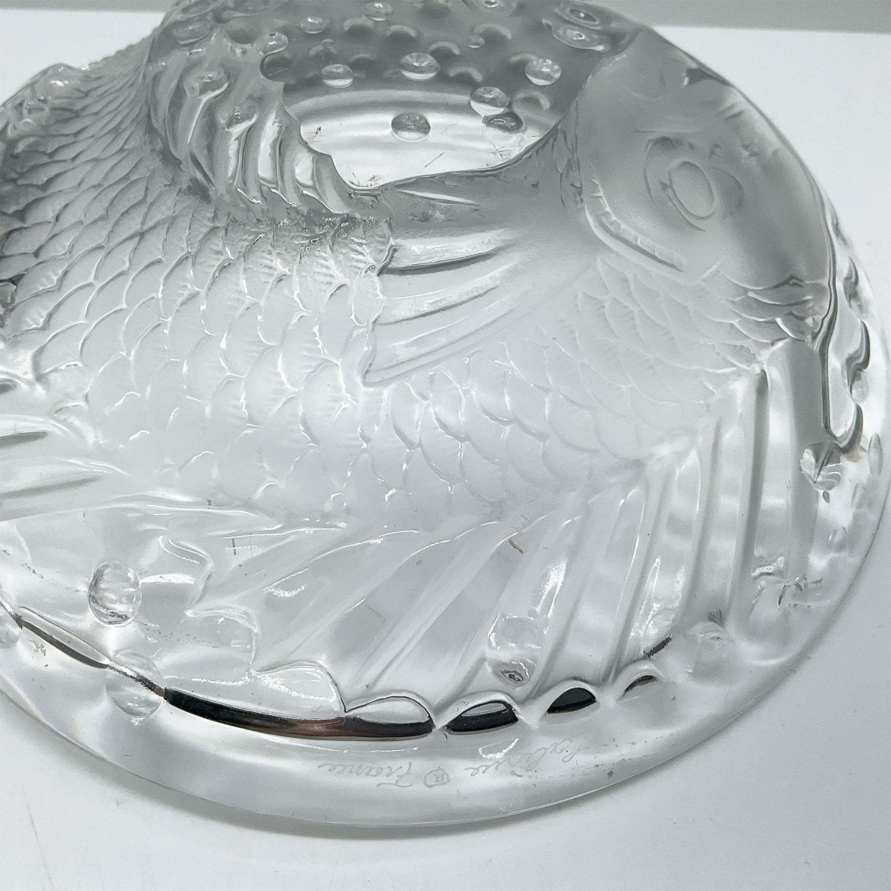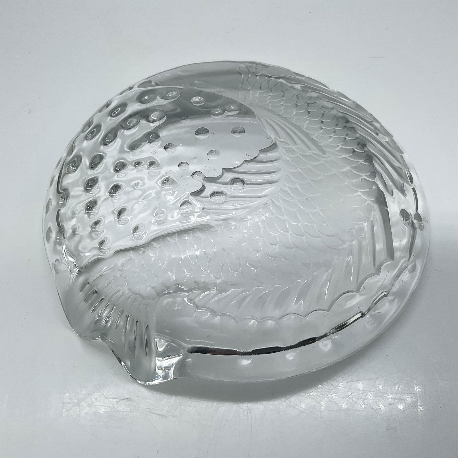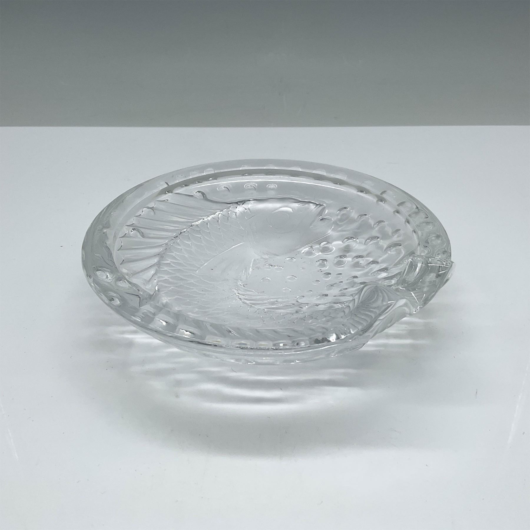 This Lalique crystal ashtray features a beautifully detailed fish motif, expertly rendered in a combination of frosted and clear glass. Designed with intricate scales and delicate detailing, this piece exemplifies the high-quality craftsmanship synonymous with the Lalique name. Signed "Lalique France" along the base, this elegant design captures the essence of Lalique's mastery in creating functional yet artistic glassware.