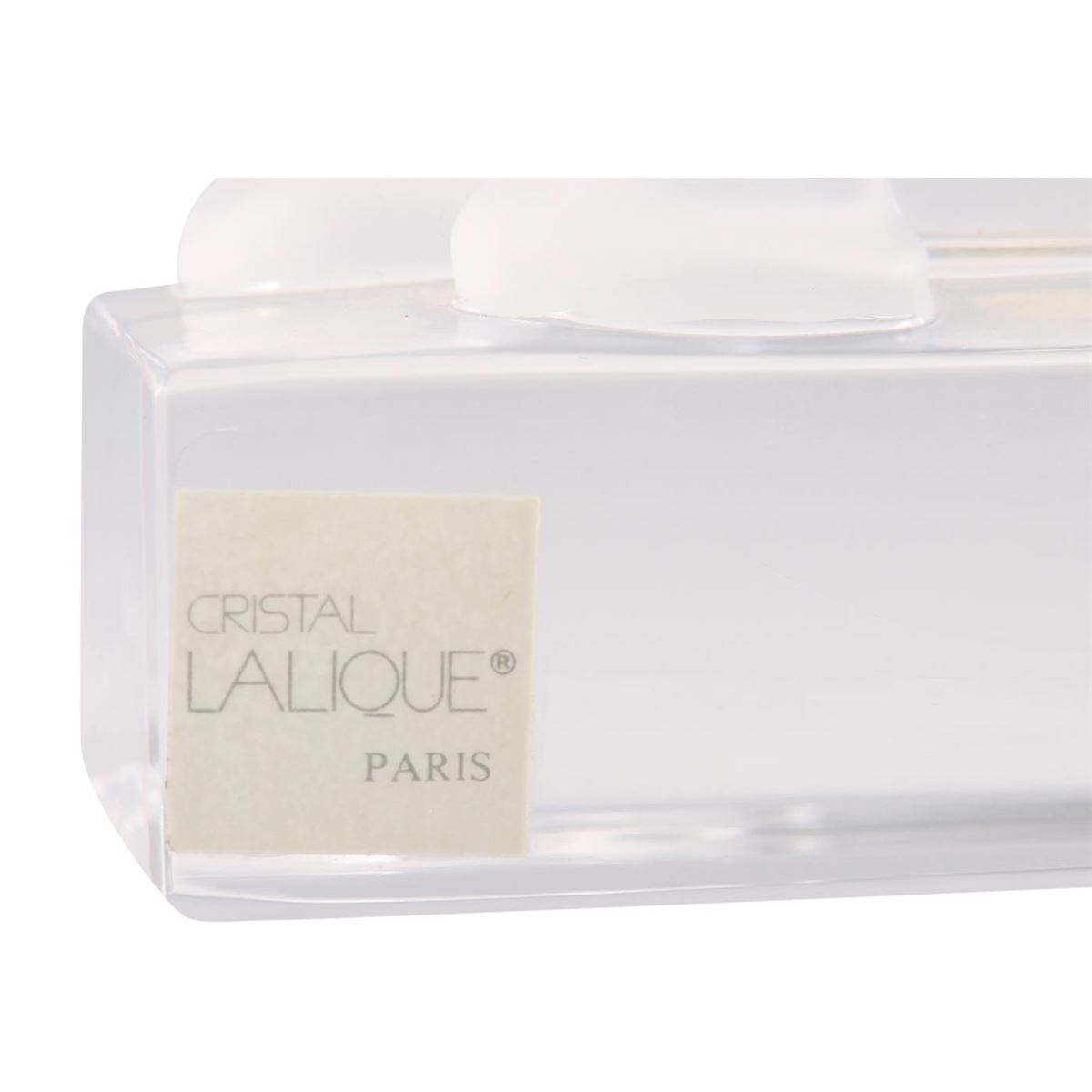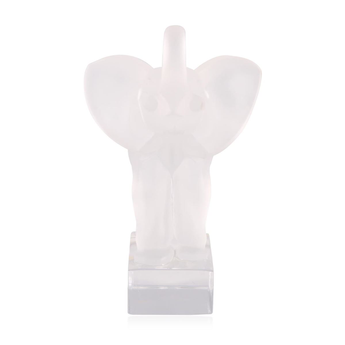 This is a beautiful vintage Lalique Crystal trunk up "Elephant" figural paperweight. The Elephant sculpture is in excellent condition with no chips. This frosted crystal elephant stands on a clear crystal base with bevel cut edges. Original label on front and etched signed "Lalique France" in script on base, c. 1950-1970's. It measures 6" high, 6" long, and 3 3/4" wide. Weighs 2.4 pounds.