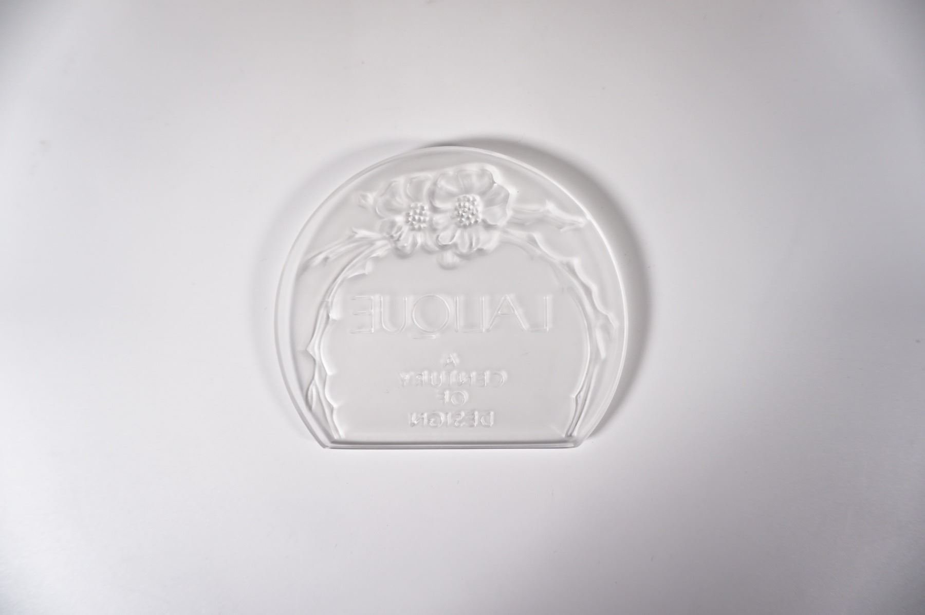 Lalique France crystal plaque commemorating a century of design. Features an elegant floral motif with raised lettering that reads 'Lalique A Century of Design'. Exquisitely crafted with frosted and clear glass details. Signed 'Lalique France' on the bottom edge, reflecting the brand's legacy in luxury glassmaking.