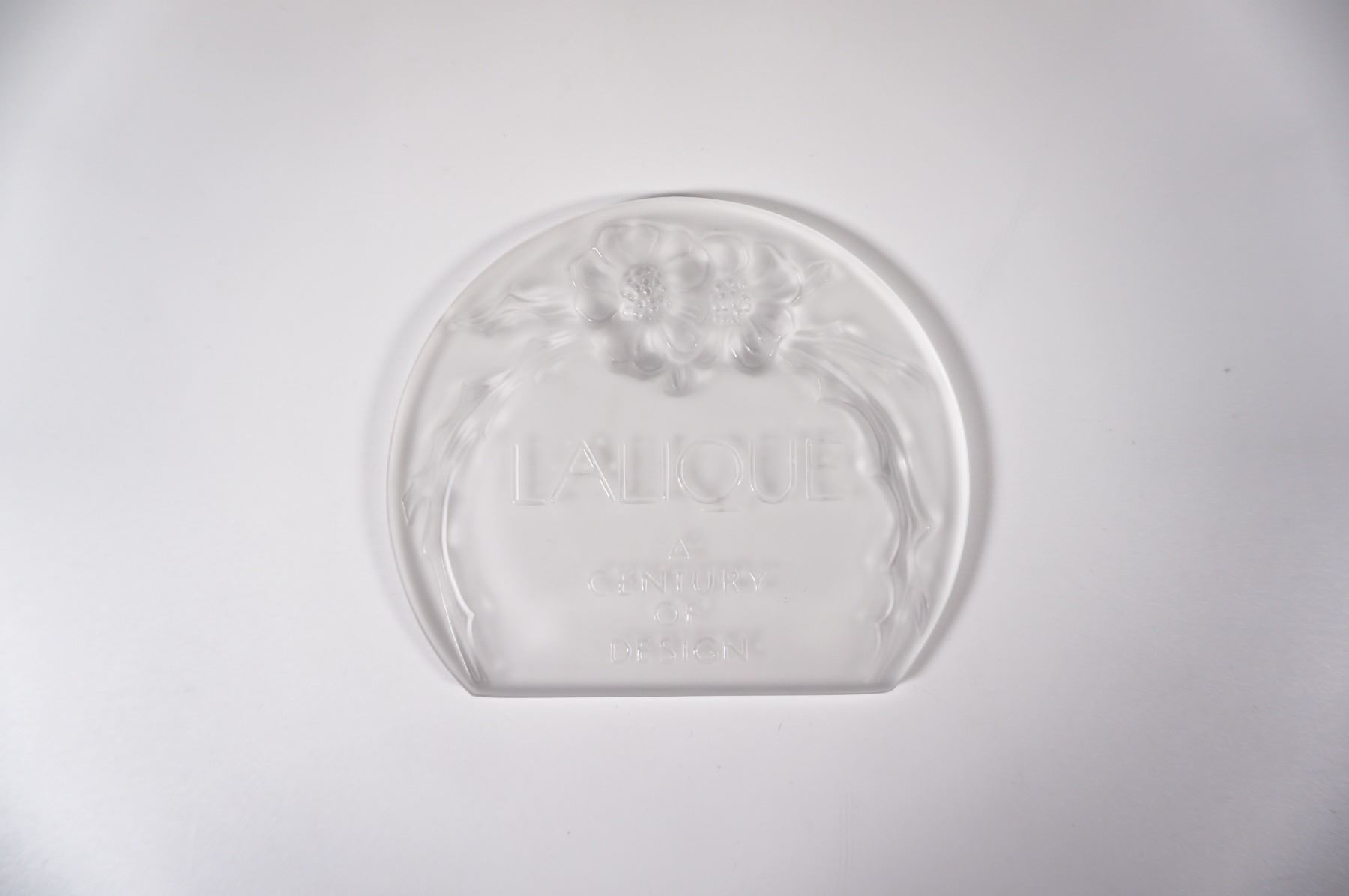 Lalique France crystal plaque commemorating a century of design. Features an elegant floral motif with raised lettering that reads 'Lalique A Century of Design'. Exquisitely crafted with frosted and clear glass details. Signed 'Lalique France' on the bottom edge, reflecting the brand's legacy in luxury glassmaking.