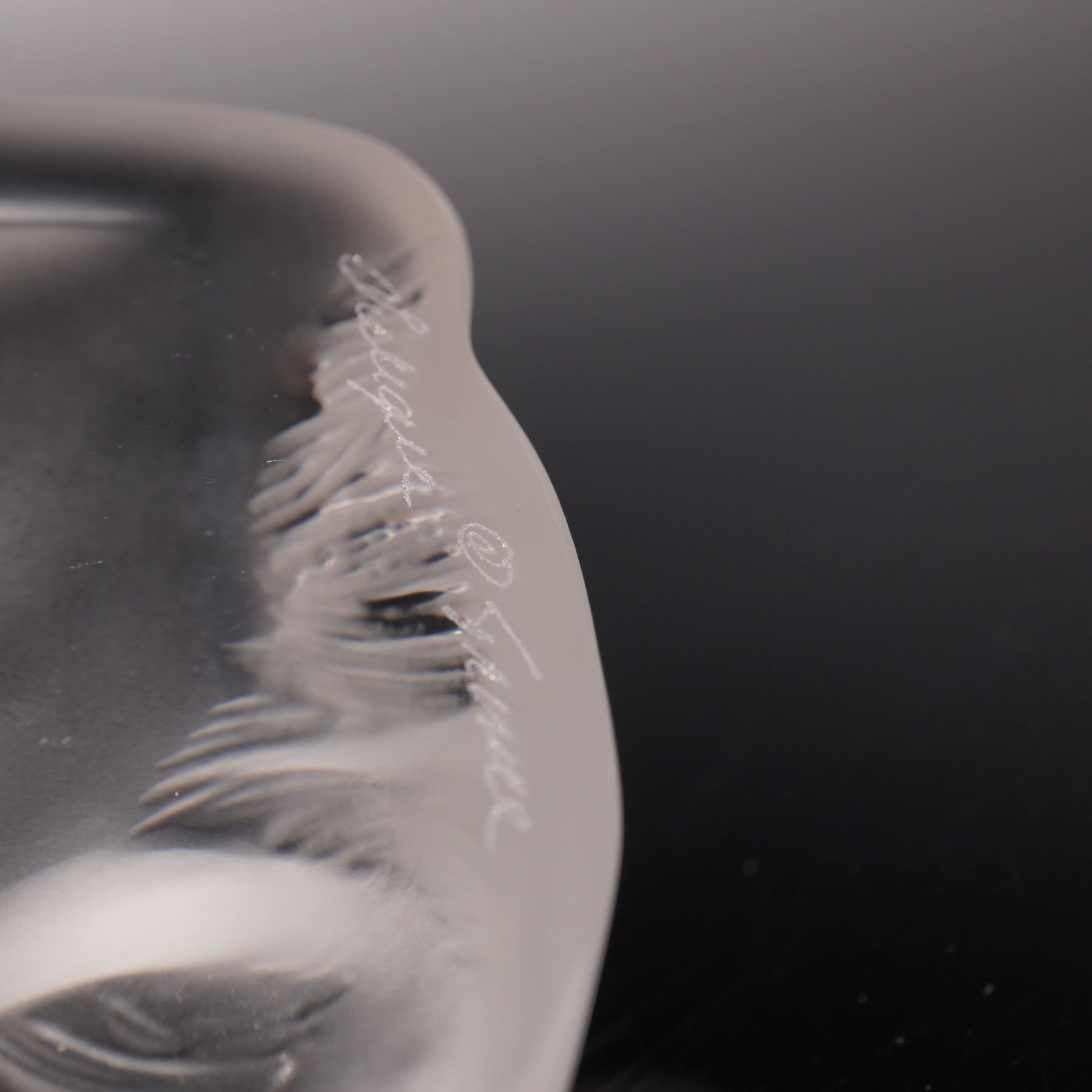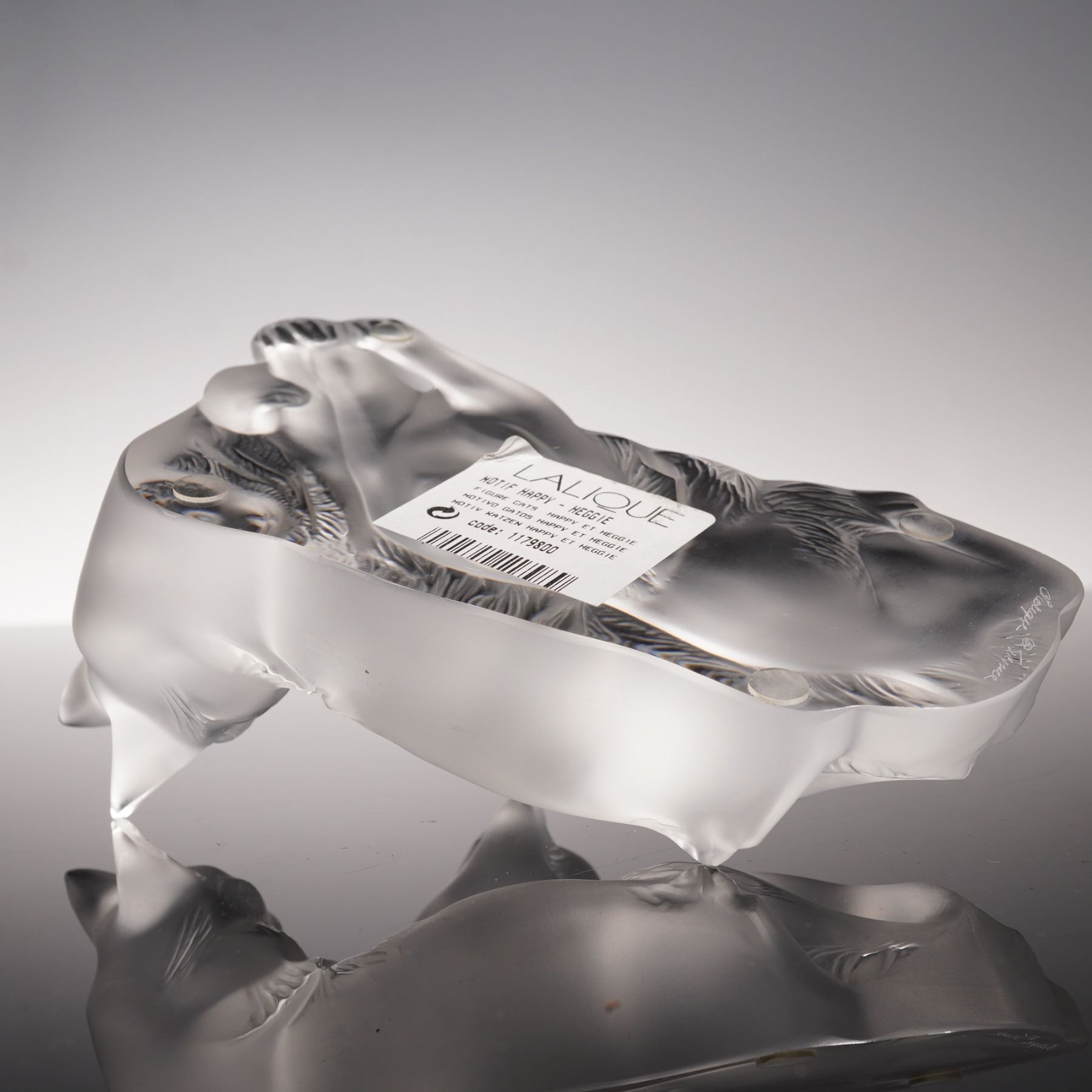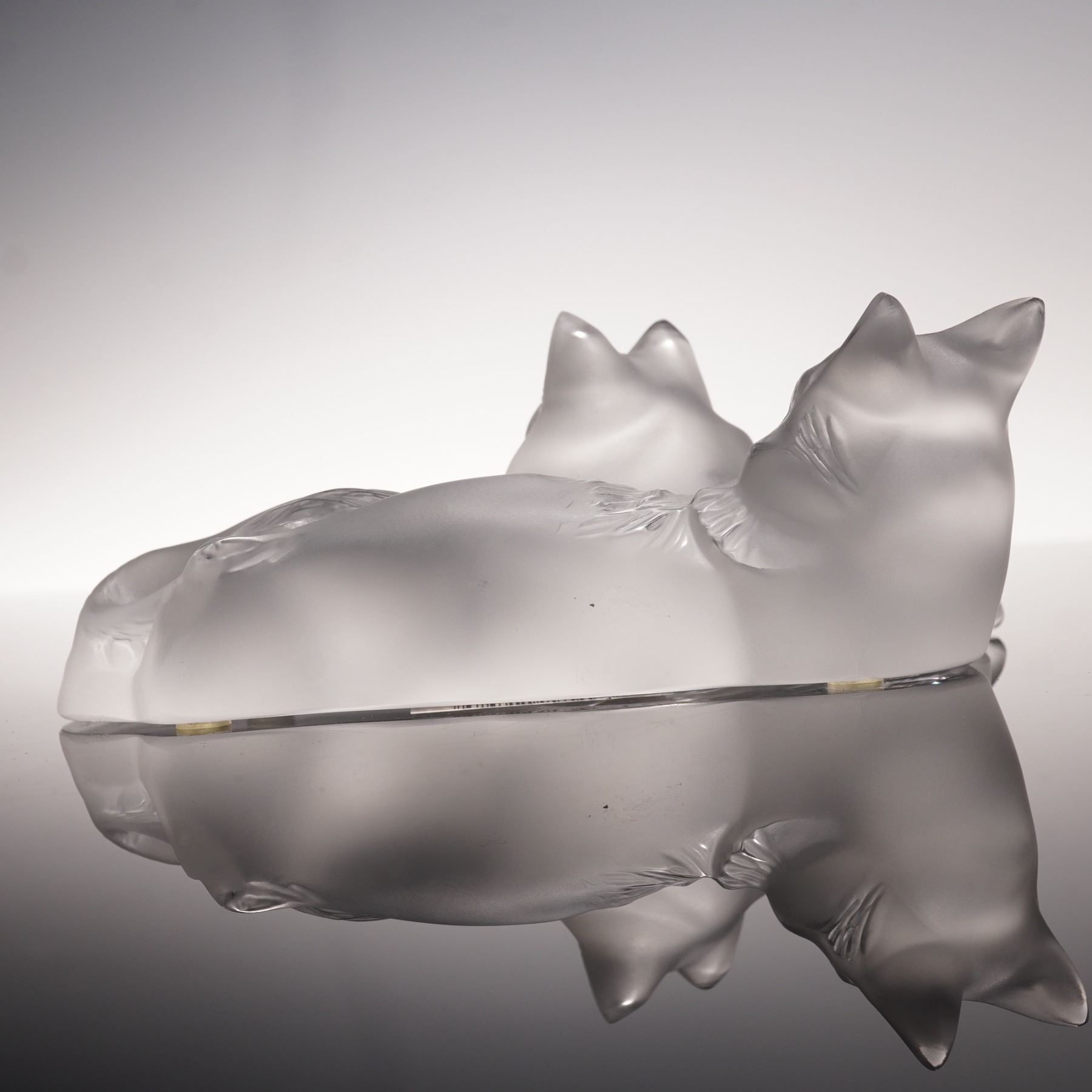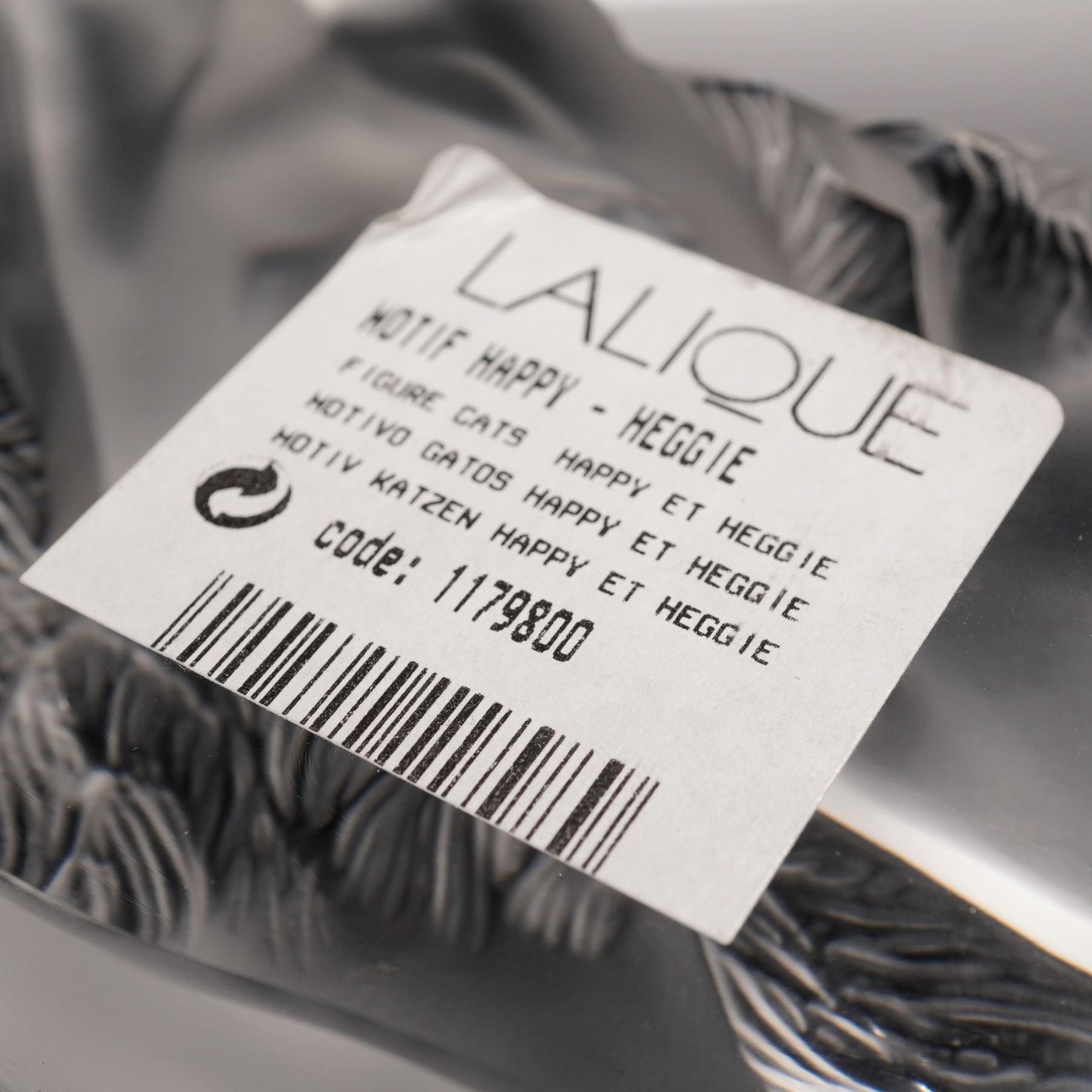A Lalique crystal figurine depicting two reclining cats, Happy and Heggie, crafted in finely detailed frosted and clear crystal. Signed Lalique France to the base, with original label. A beautifully sculpted piece showcasing the brand's renowned artistry and elegance in glassmaking.