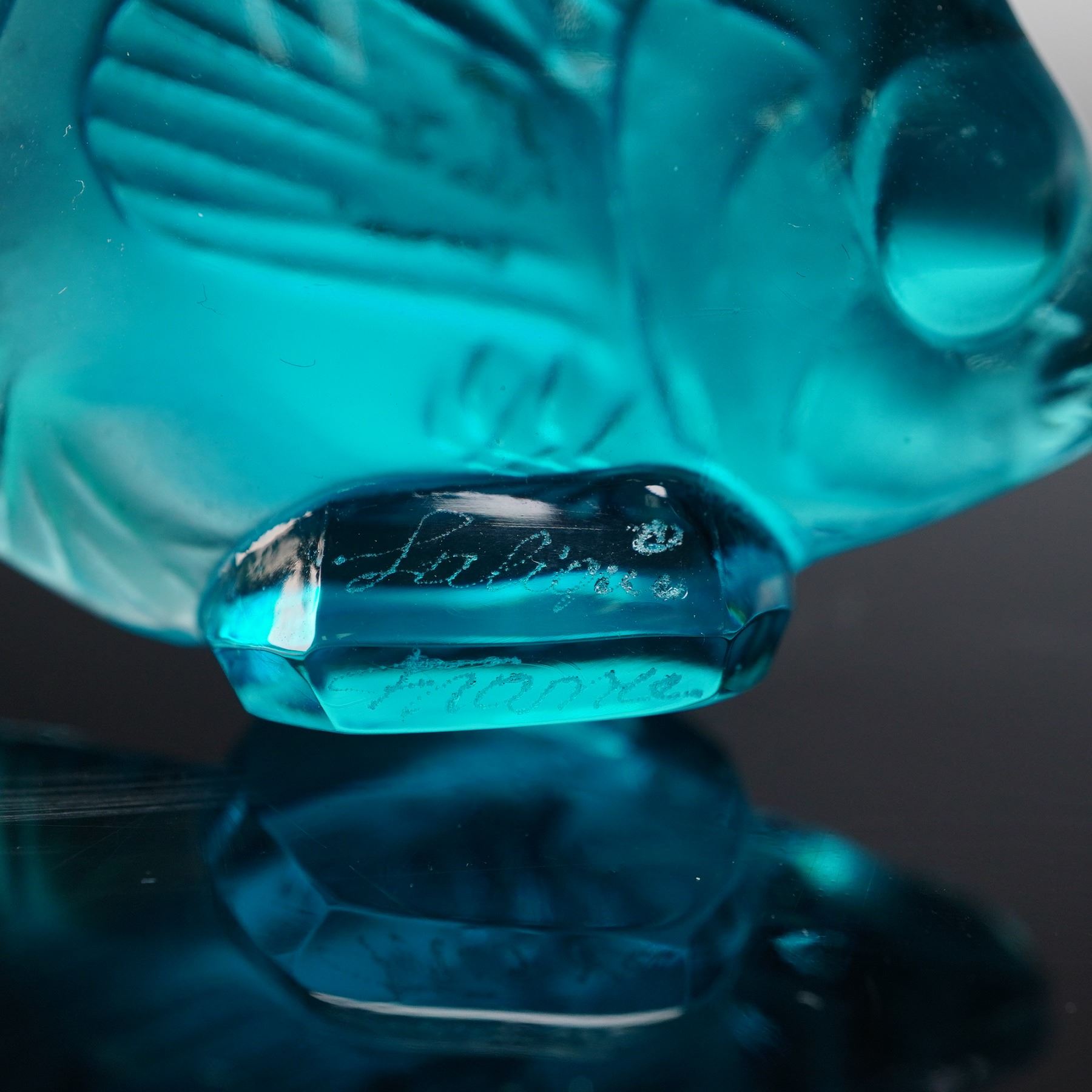 Fish sculpture colored in soft turquoise with signature frosted glass texture on the front and smooth crystal side. Etched Lalique France on the bottom of the back.