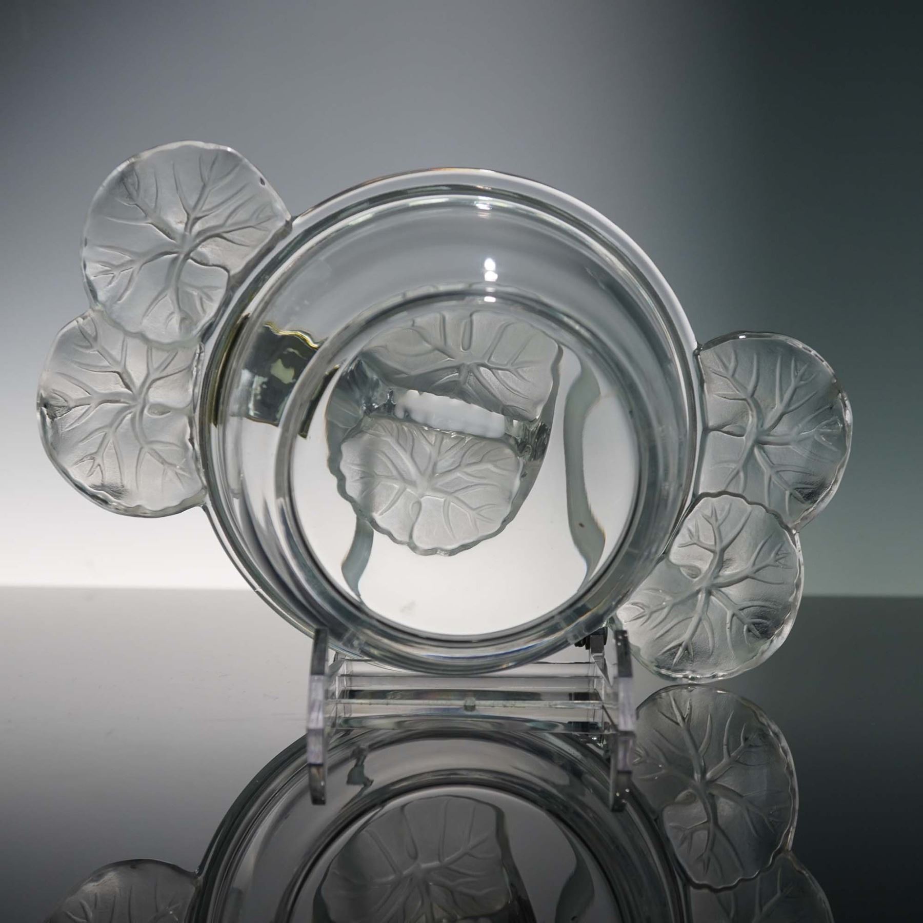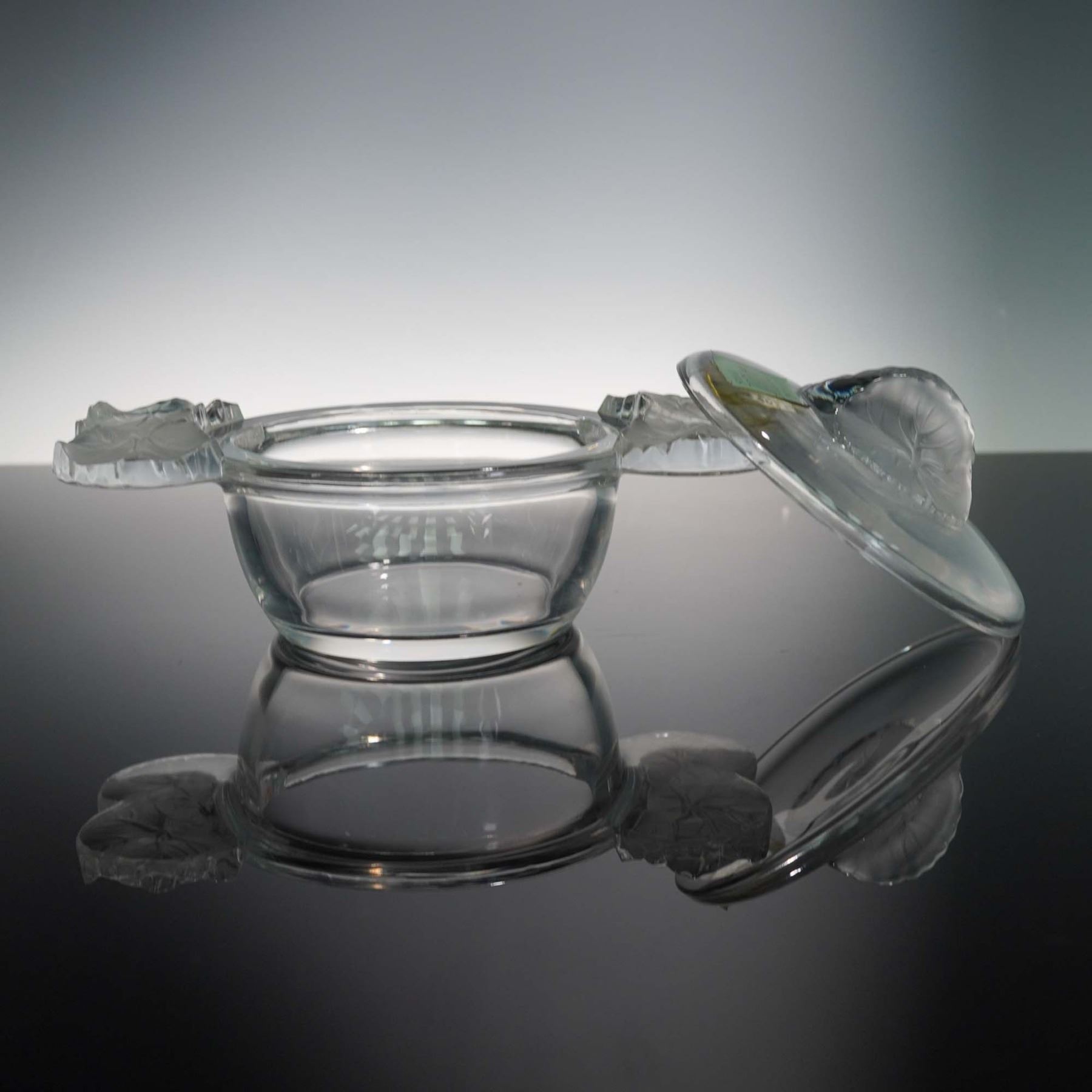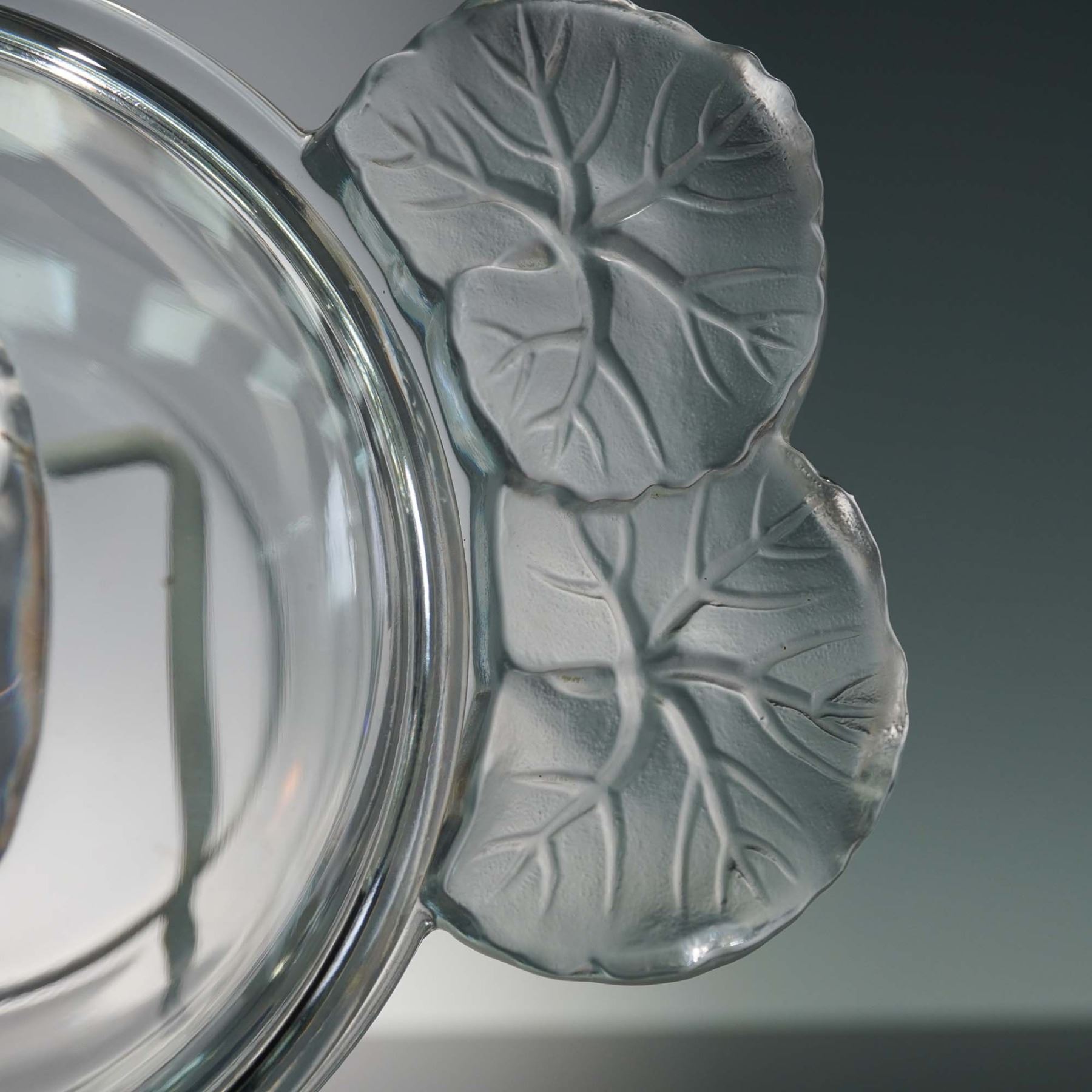 This Lalique crystal lidded dish is beautifully designed with delicately molded lilypad motifs in frosted crystal extending from both sides of the base and rising atop the domed lid. Crafted in clear and frosted French crystal, the dish highlights the natural elegance of water flora with realistic veining and textured surfaces on each pad. The original green Cristal Lalique Paris label remains affixed, and the piece is etched Lalique France along the rim. A graceful blend of function and artistry, this decorative covered dish reflects Lalique's timeless botanical themes and mastery of glassmaking.