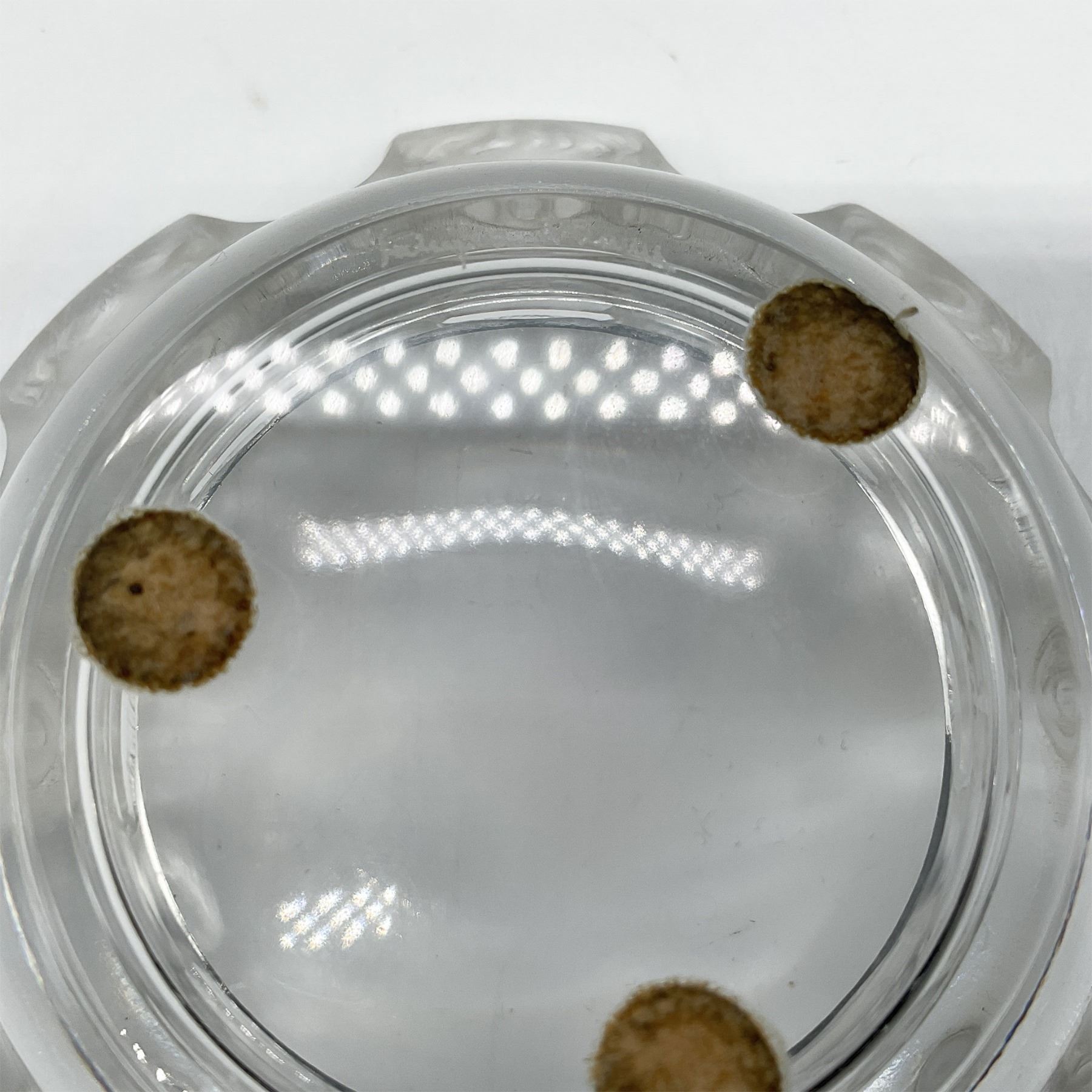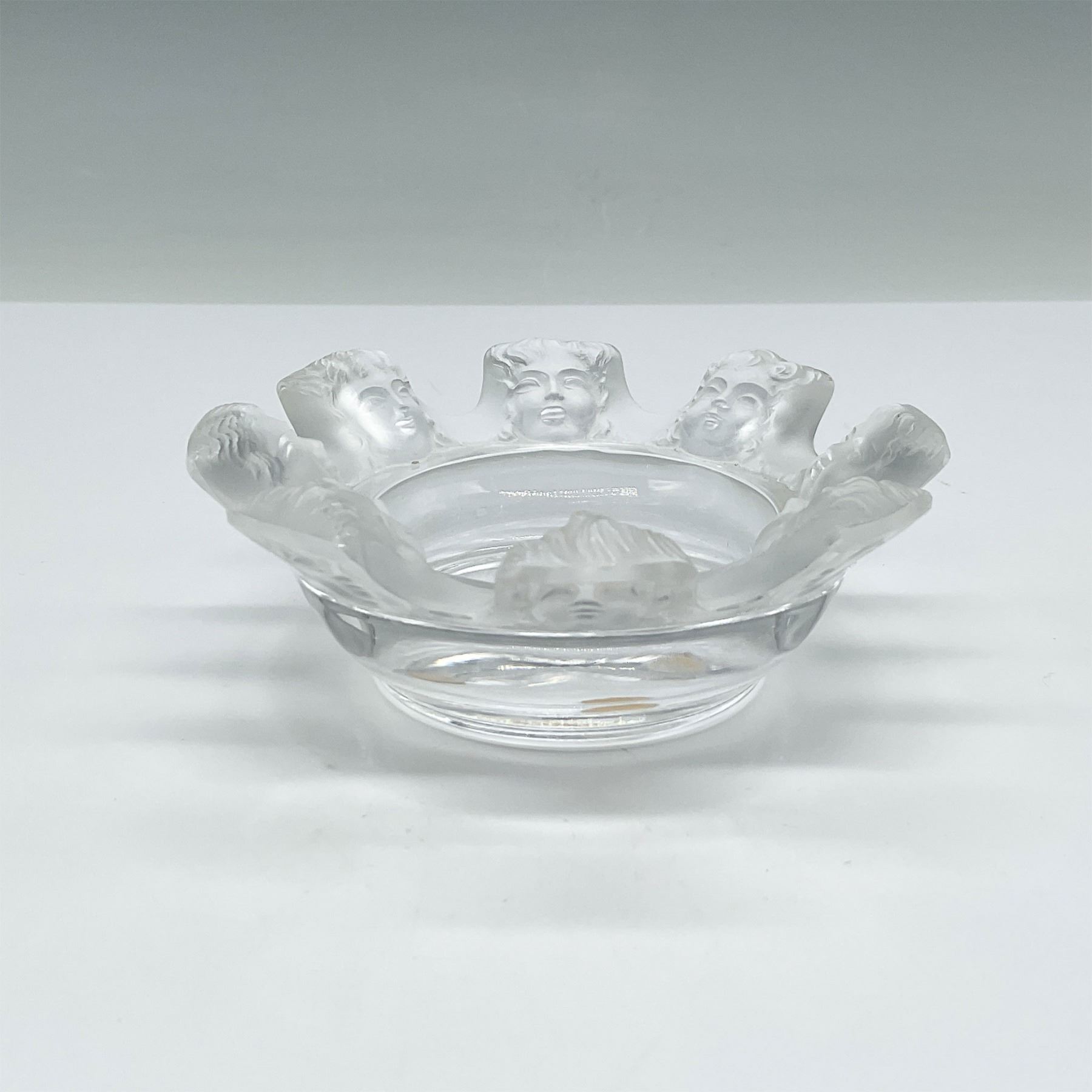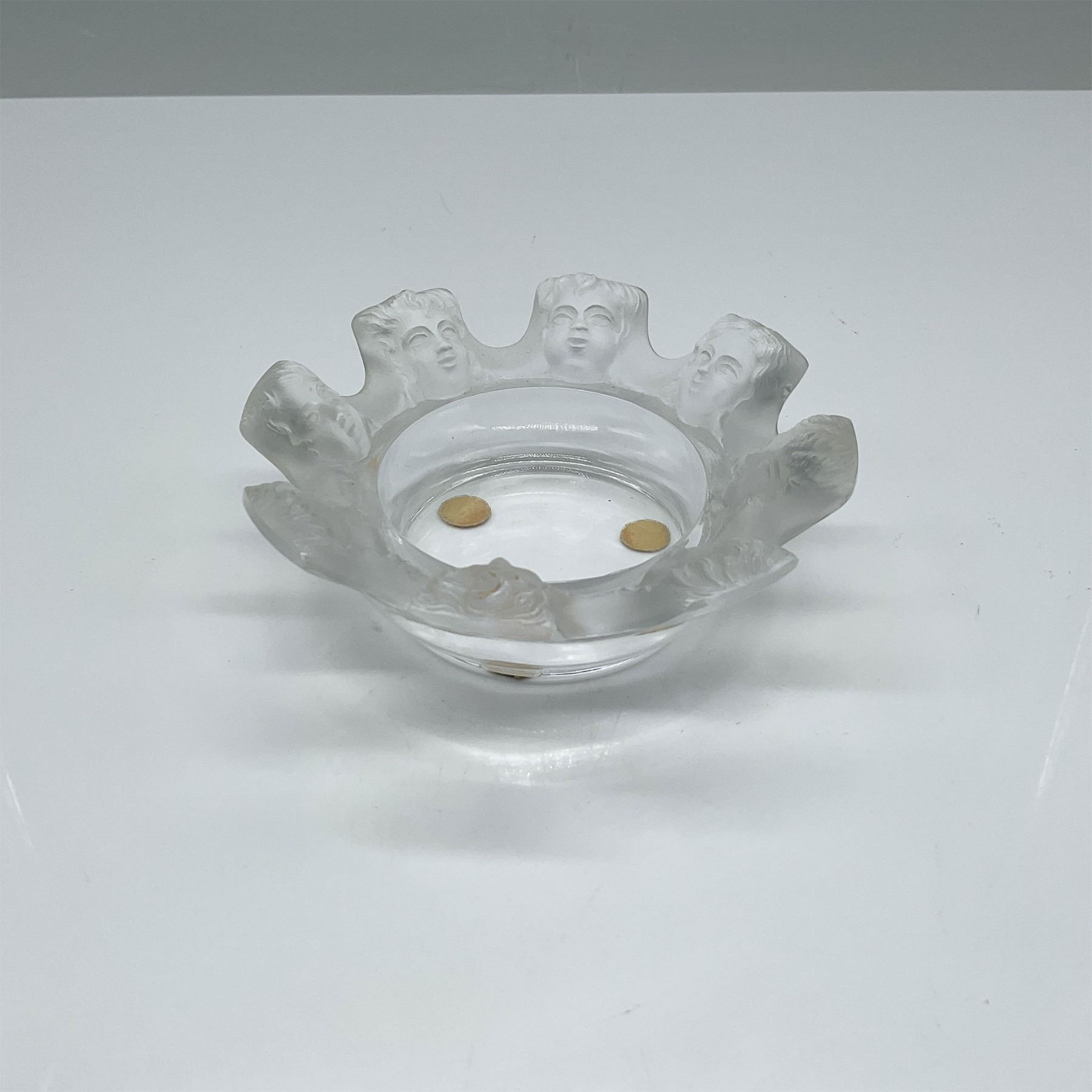 This exquisite Lalique crystal trinket dish, known as the St. Nicholas design, features a ring of eight frosted cherub faces encircling the rim, beautifully contrasting with the clear crystal base. Handcrafted in France, it exemplifies Lalique's renowned artistry and attention to detail. The piece is signed Lalique France on the bottom, authenticating its origin. The St. Nicholas design is versatile, serving as a trinket dish, ashtray, or decorative accent, making it a cherished addition for collectors of fine crystal and art glass.