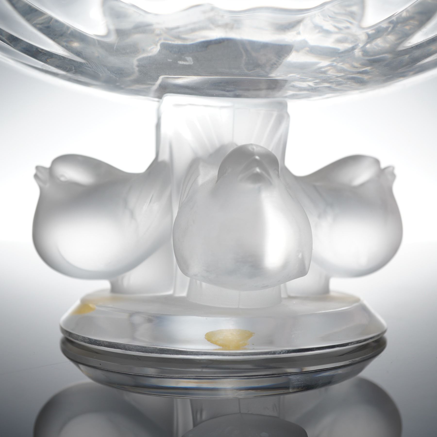 Elegant Lalique France crystal bon bon dish, featuring a circular bowl raised on a frosted stem modeled with three sculpted doves in relief. The clear and satin-finished crystal contrast beautifully, exemplifying Lalique's timeless mastery of form and texture. The dish is etched Lalique France to the base. A fine example of mid-20th century Lalique design, celebrated for its naturalistic motifs and refined translucency.