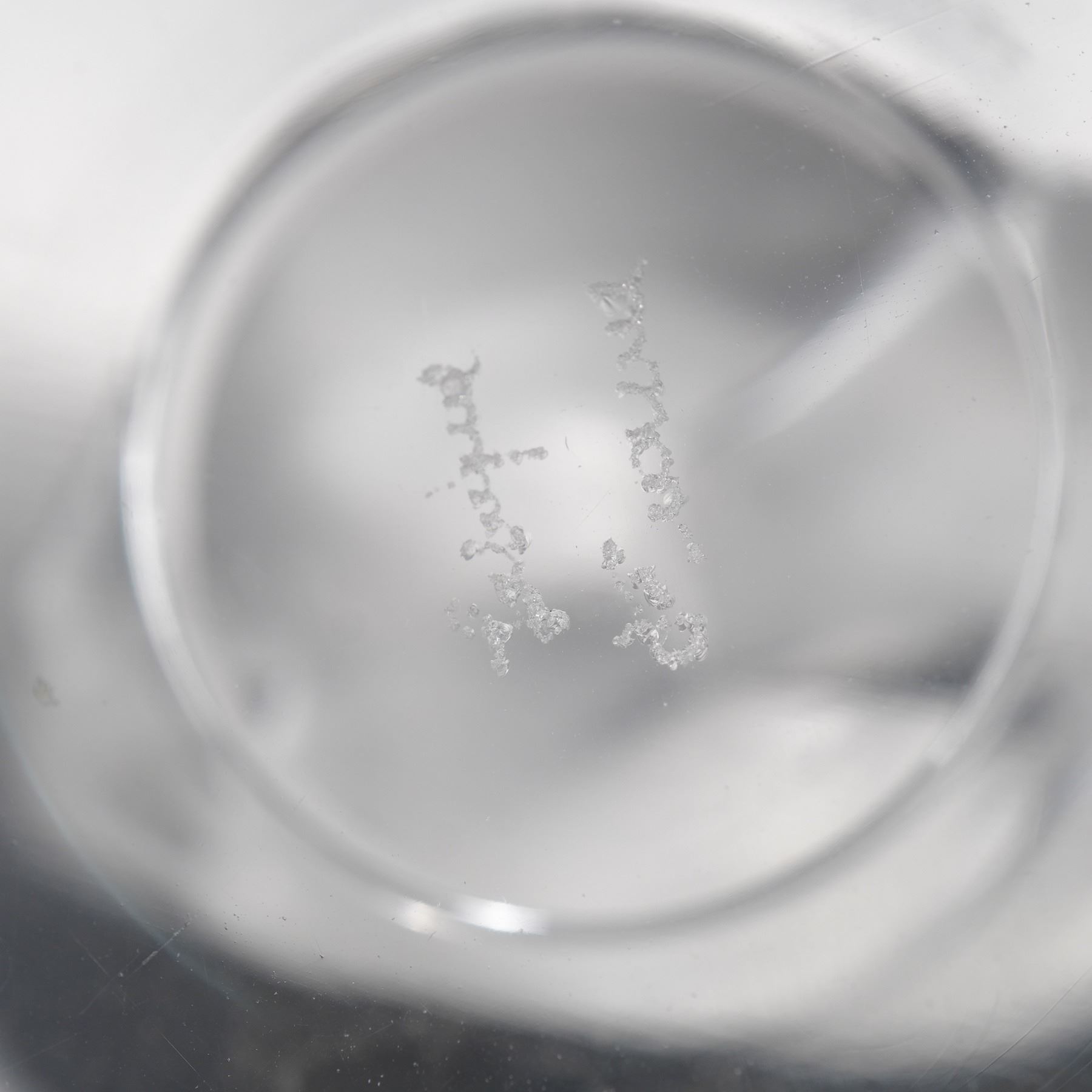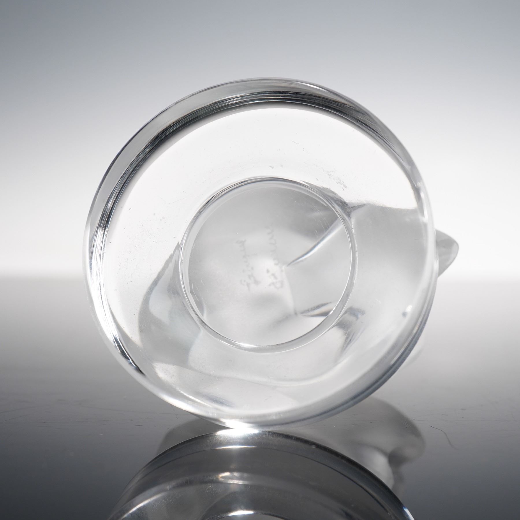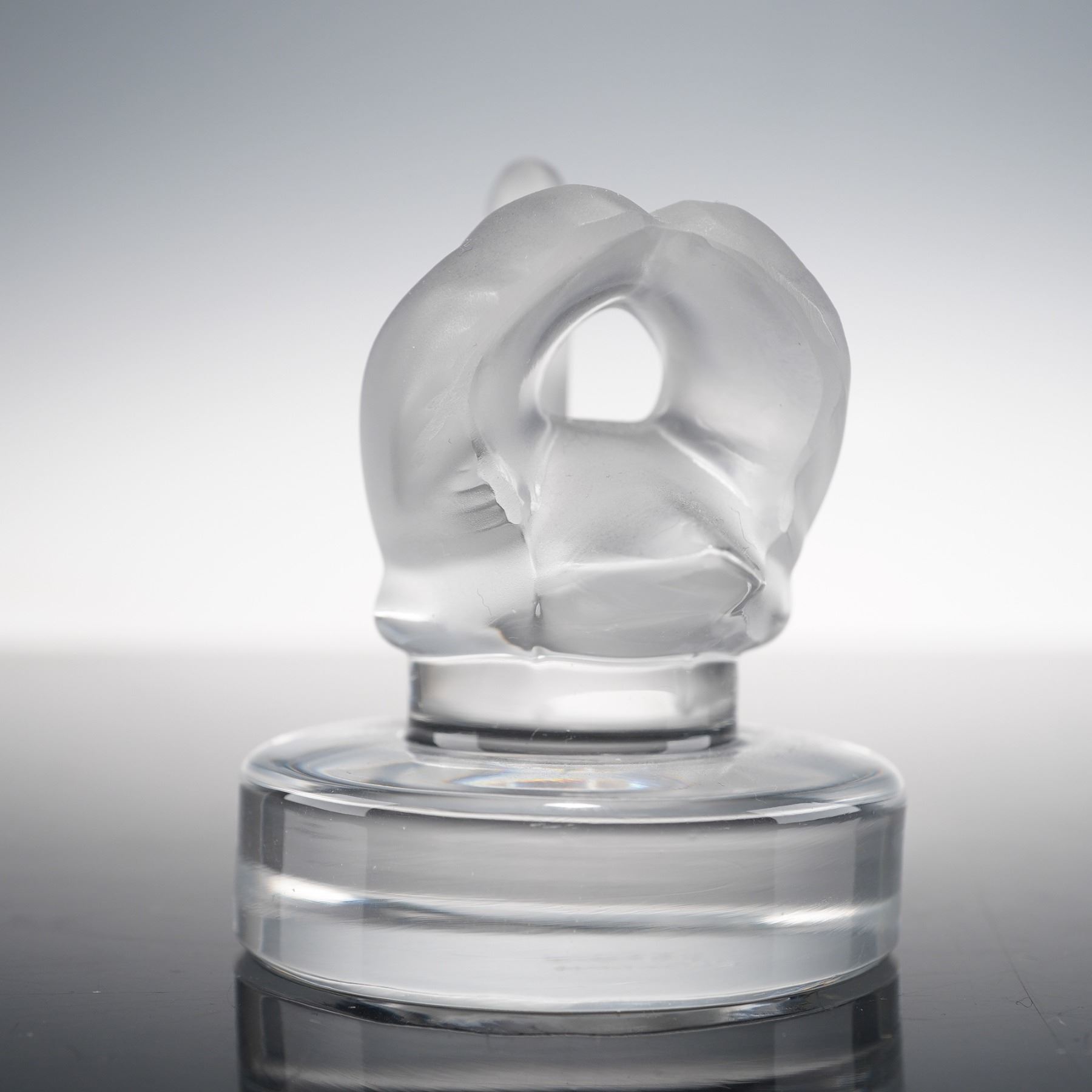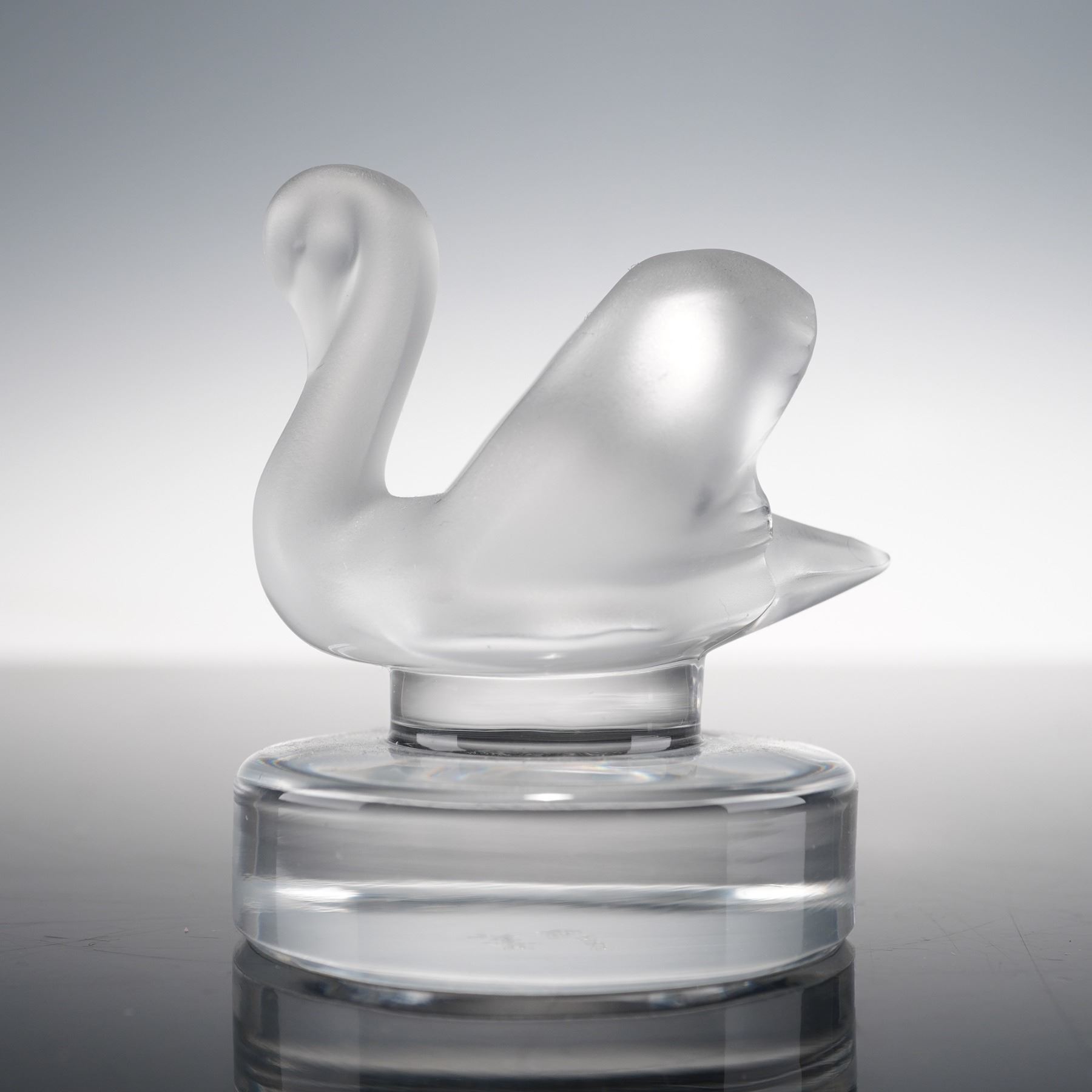 This Lalique frosted crystal swan paperweight features a beautifully sculpted swan in an elegant pose. The soft frosted finish contrasts with the clear crystal base, highlighting the exquisite craftsmanship. Lalique backstamp on base.