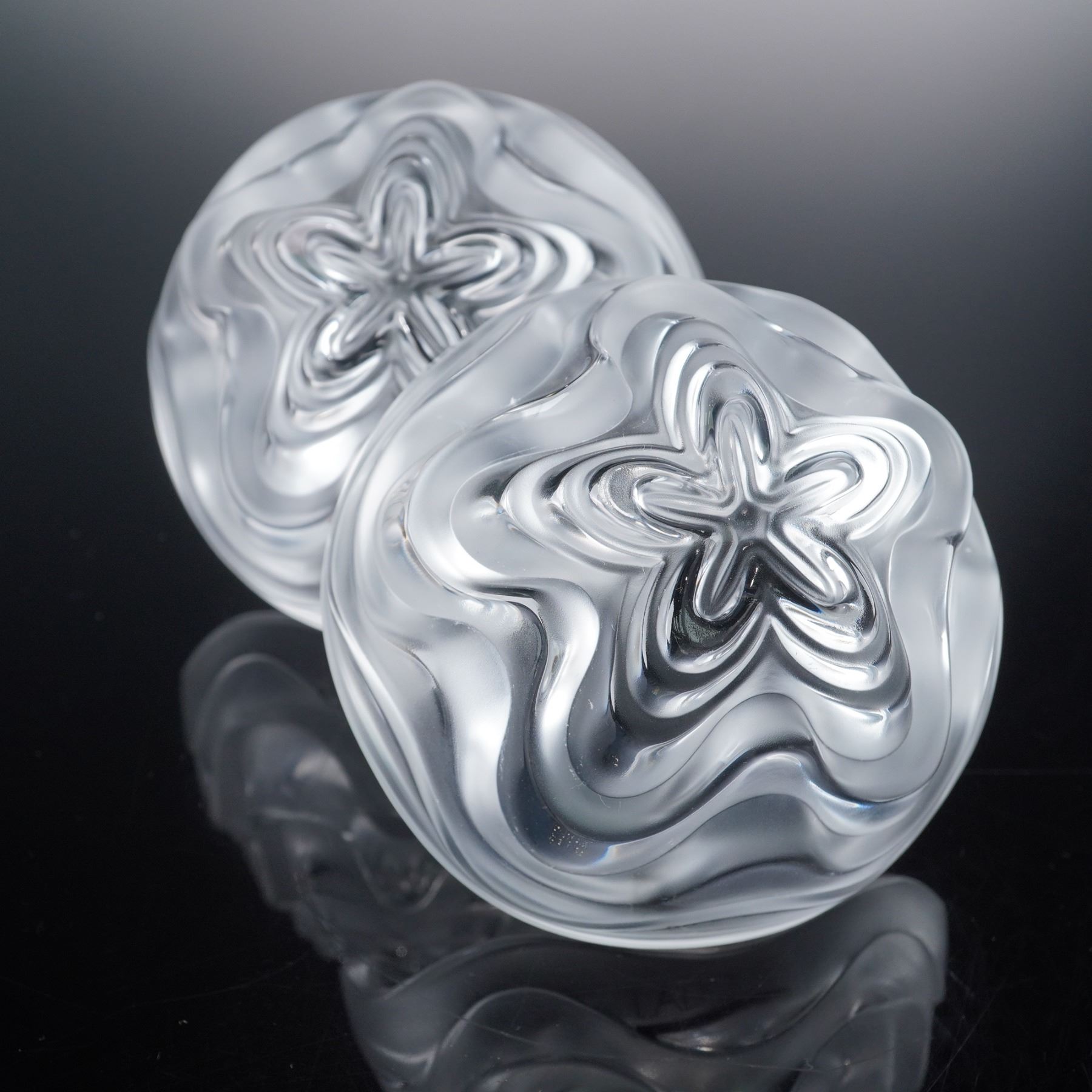 A pair of Lalique Crystal Vibrations bowls, featuring an undulating wave-like form in satin-finished and clear crystal. This elegant design reflects Lalique's mastery of contrasting textures and light play. Both bowls retain their original Lalique Paris presentation box.