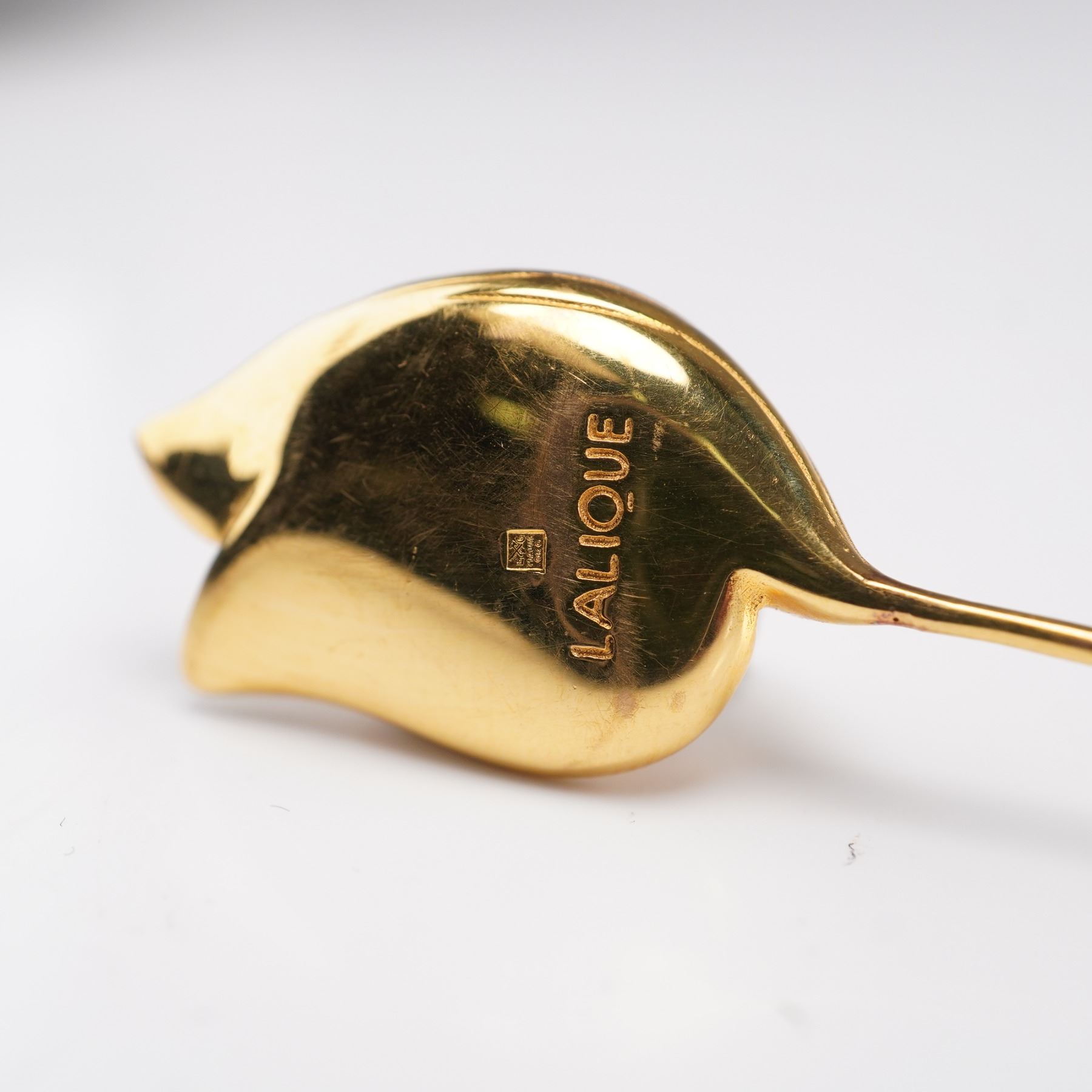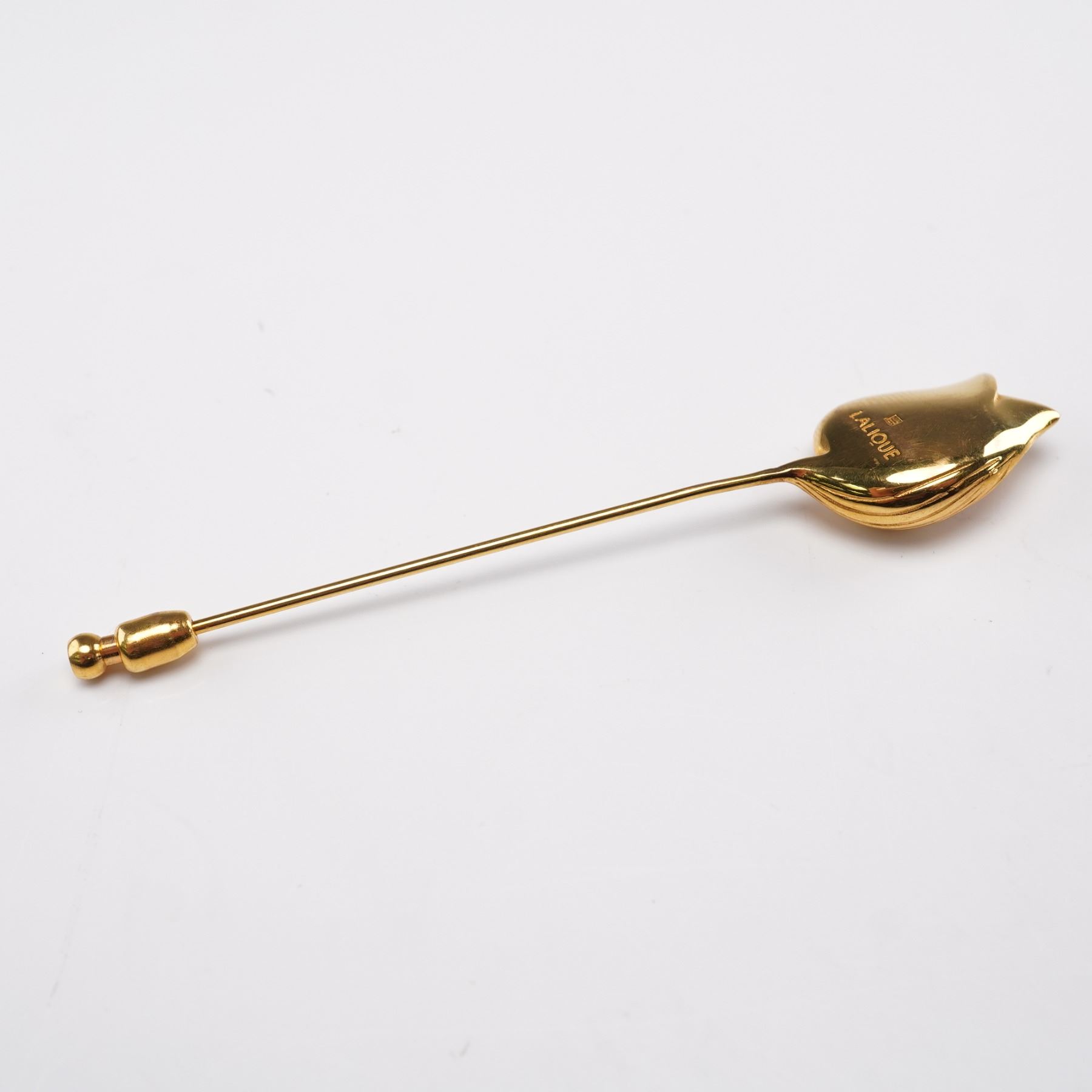 Elegant Lalique crystal and gilt metal stick pin featuring a frosted crystal tulip bud embraced by textured gilt petals and leaves. The floral head is mounted on a slender gold-tone pin with a protective end cap. The back is stamped Lalique with maker's mark.