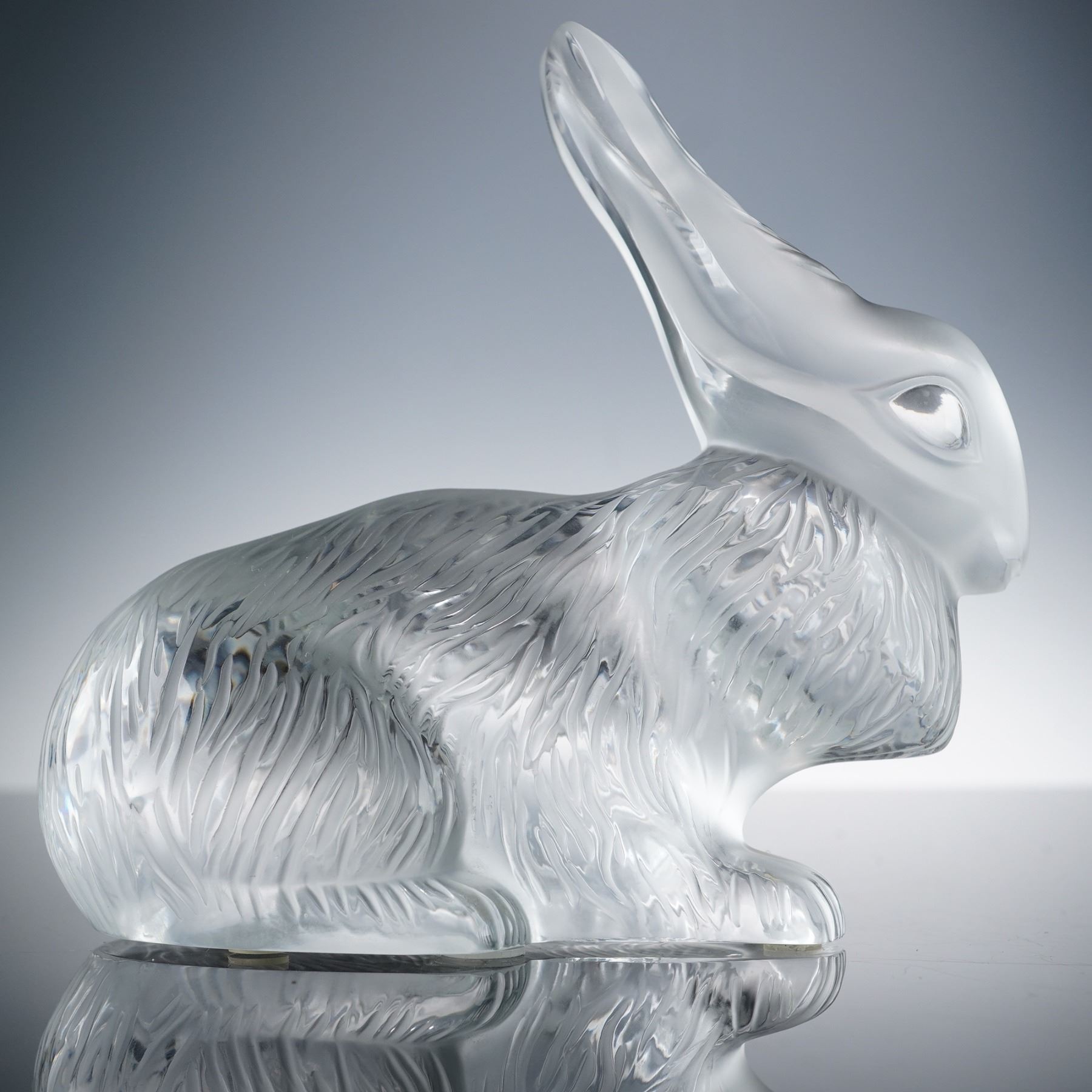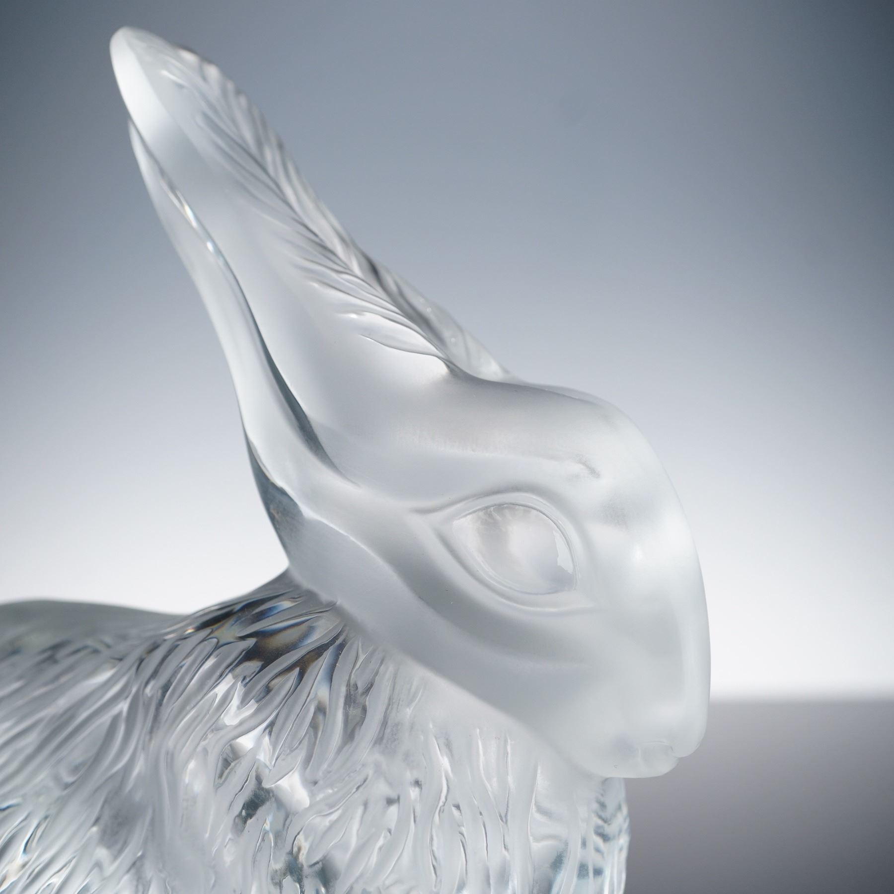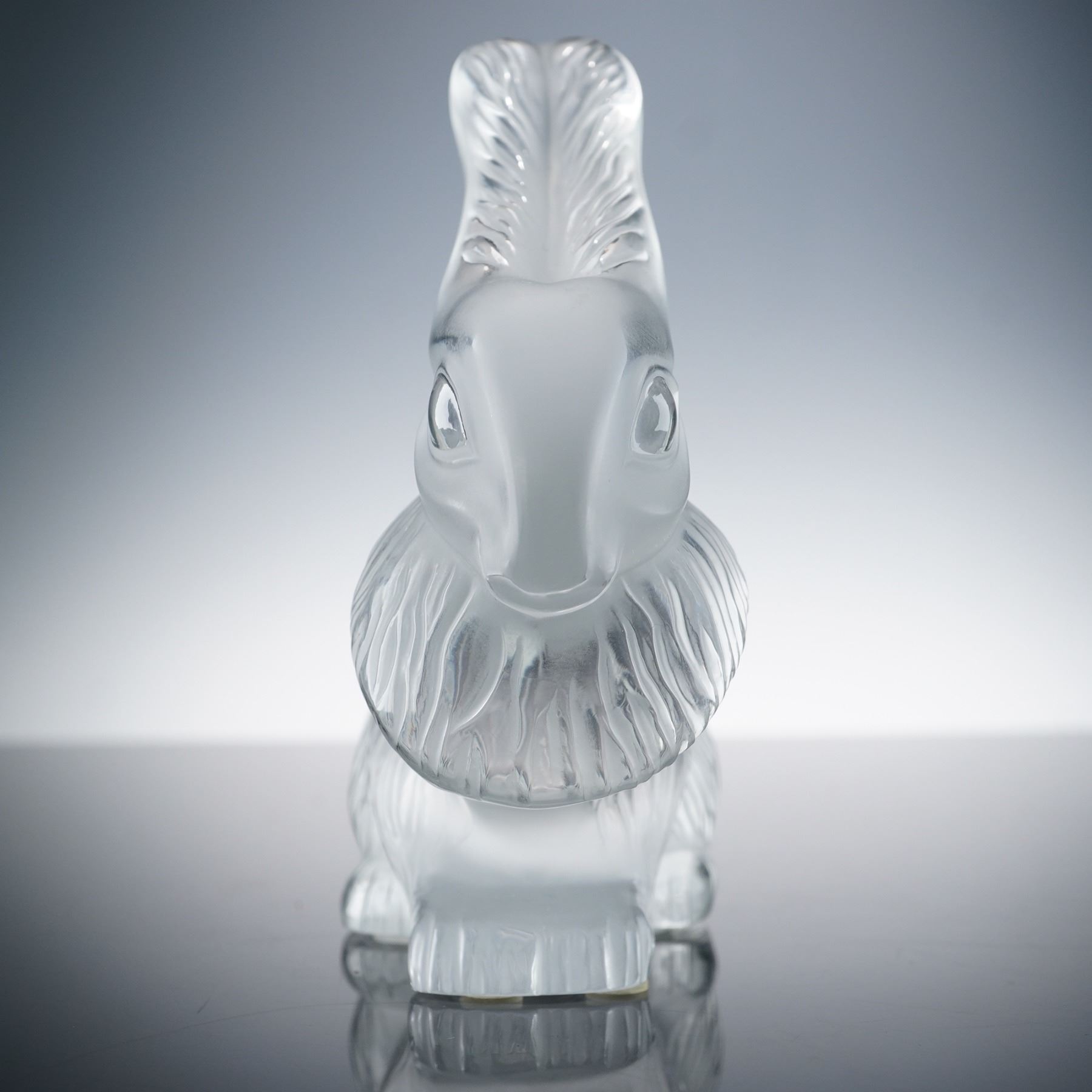 A finely crafted Lalique crystal figurine depicting a seated rabbit, titled Cesar. This charming piece showcases Lalique's signature frosted and clear crystal contrast, with beautifully detailed fur and a smooth, sculpted head and ears. The figurine bears the original Lalique Paris label and is signed to the base Lalique France. Presented in its original Lalique box, it exemplifies the timeless artistry and craftsmanship of the renowned French glassmaker. The box measures 7.75"L x 7.75"W x 2.5"H.