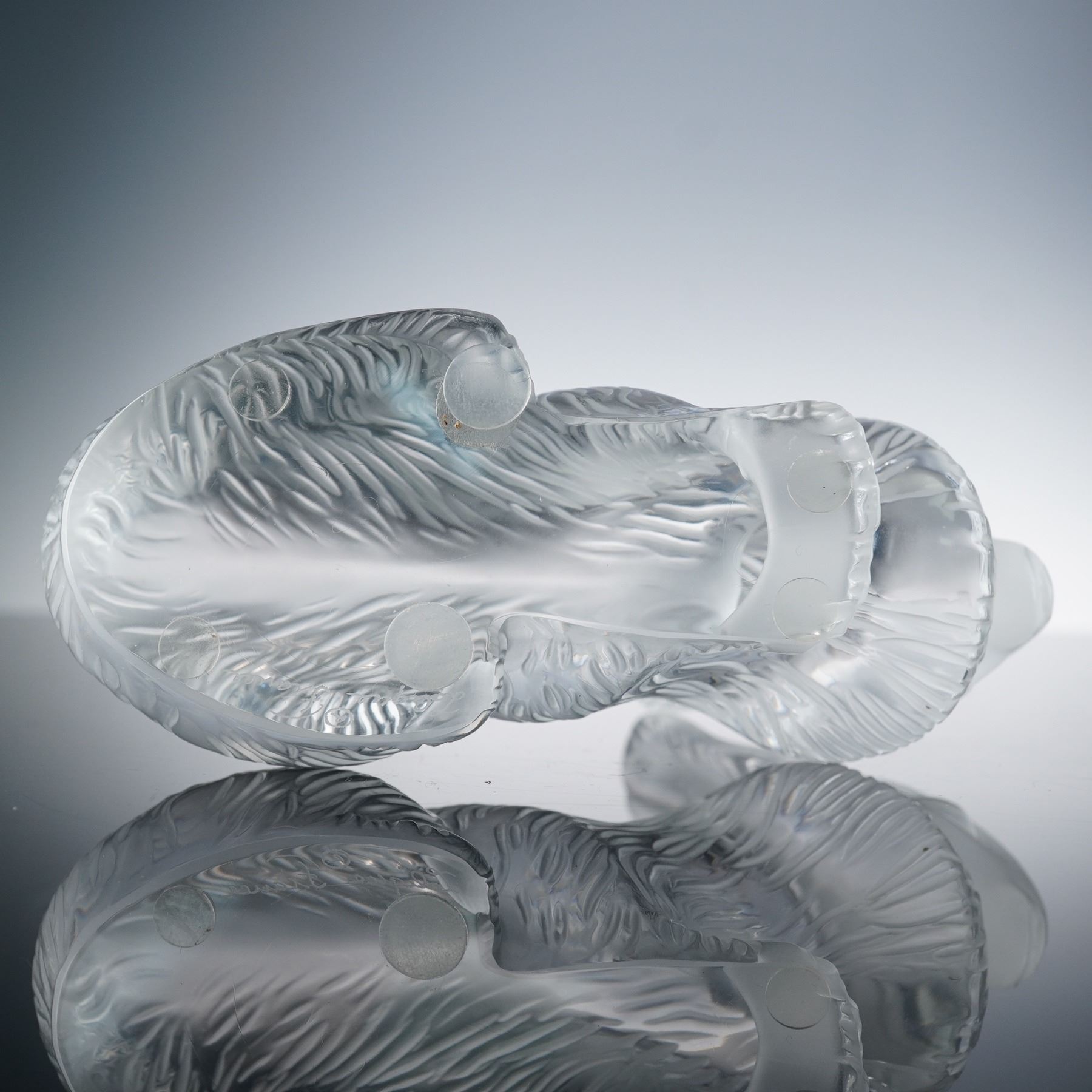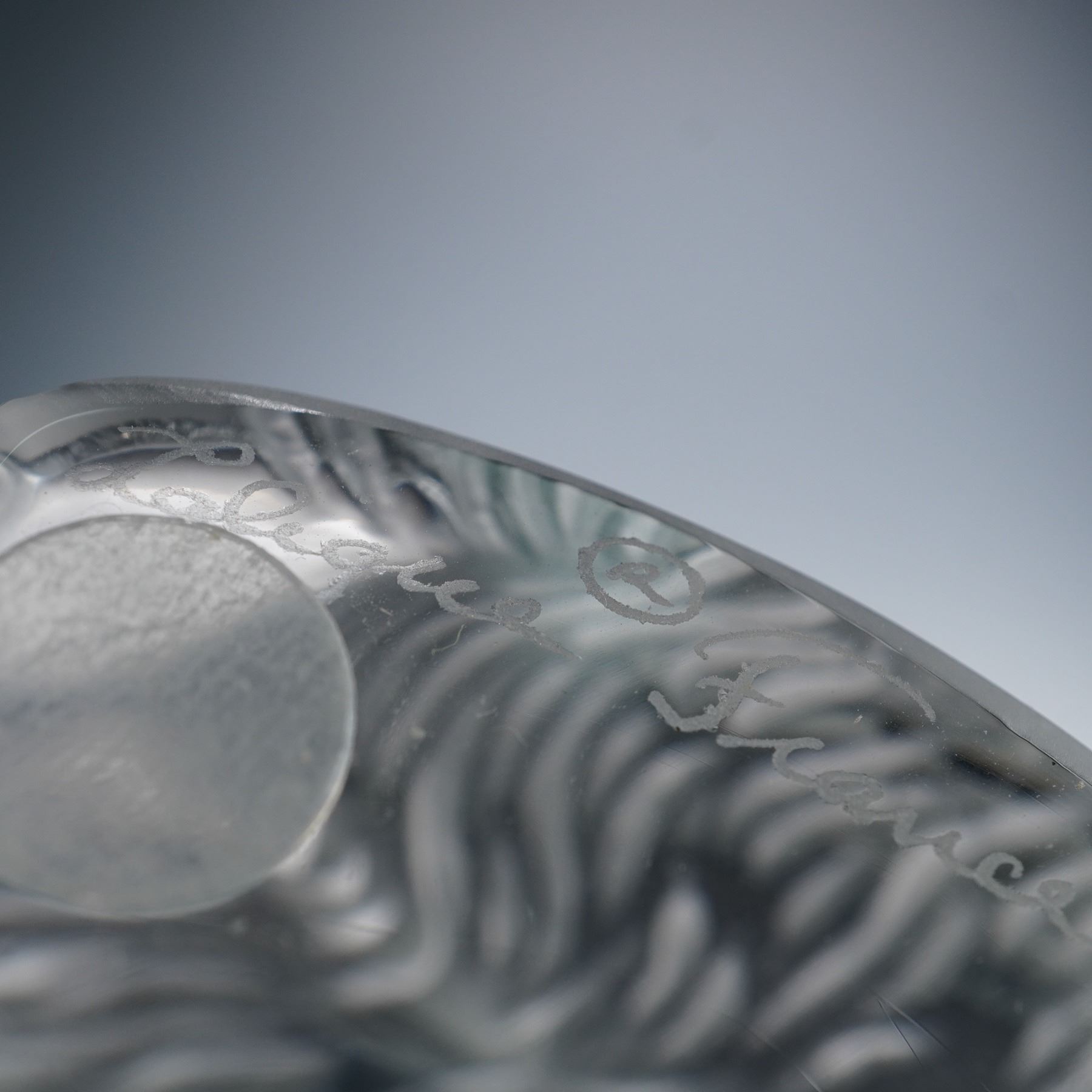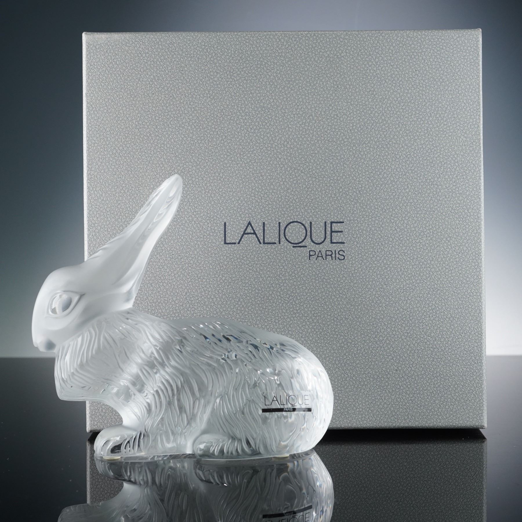 A finely crafted Lalique crystal figurine depicting a seated rabbit, titled Cesar. This charming piece showcases Lalique's signature frosted and clear crystal contrast, with beautifully detailed fur and a smooth, sculpted head and ears. The figurine bears the original Lalique Paris label and is signed to the base Lalique France. Presented in its original Lalique box, it exemplifies the timeless artistry and craftsmanship of the renowned French glassmaker. The box measures 7.75"L x 7.75"W x 2.5"H.