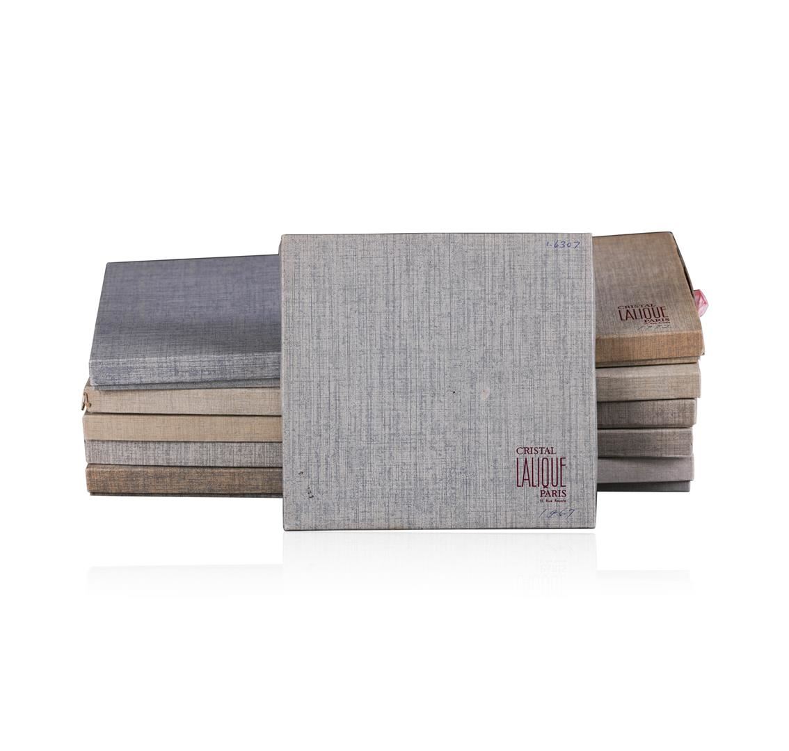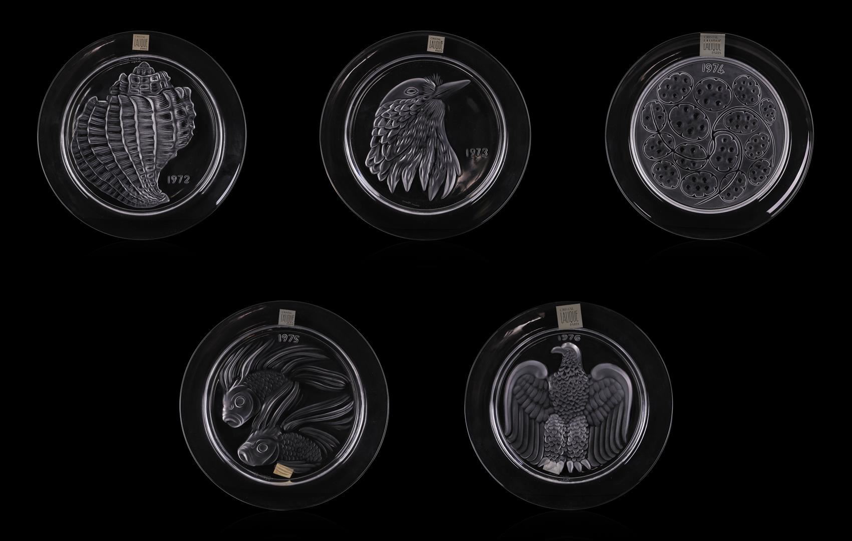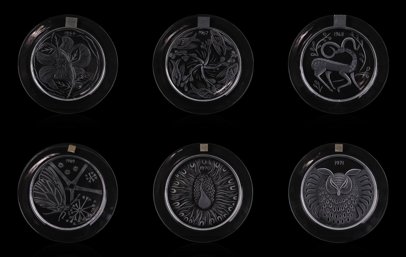 Up for sale is a beautiful set of vintage Lalique annual collector plates. This set contains eleven plates, from 1966 through 1976. The plates measure approximately 8.25" x 8.5" in their original boxes, and all plates are in great condition with no chips.