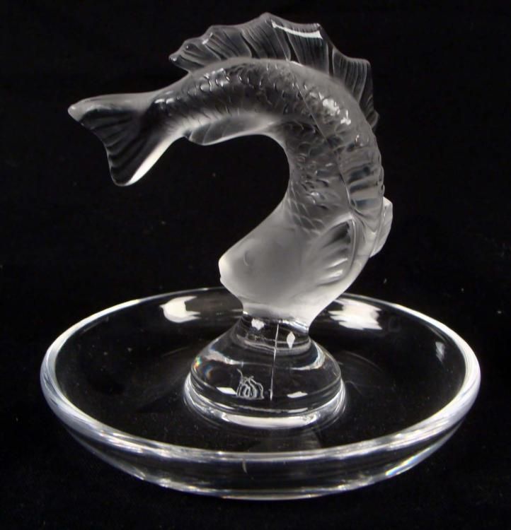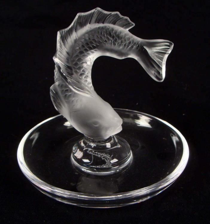 This is a Lalique crystal ring or pin dish with a leaping Goujon fish. The fish is frosted and the tray is clear. It measures approximately 3 1/2inches tall and 3 1/2 inches in diameter. Its condition is excellent. * This beautiful dish will add a touch of elegance to any small trinkets.
