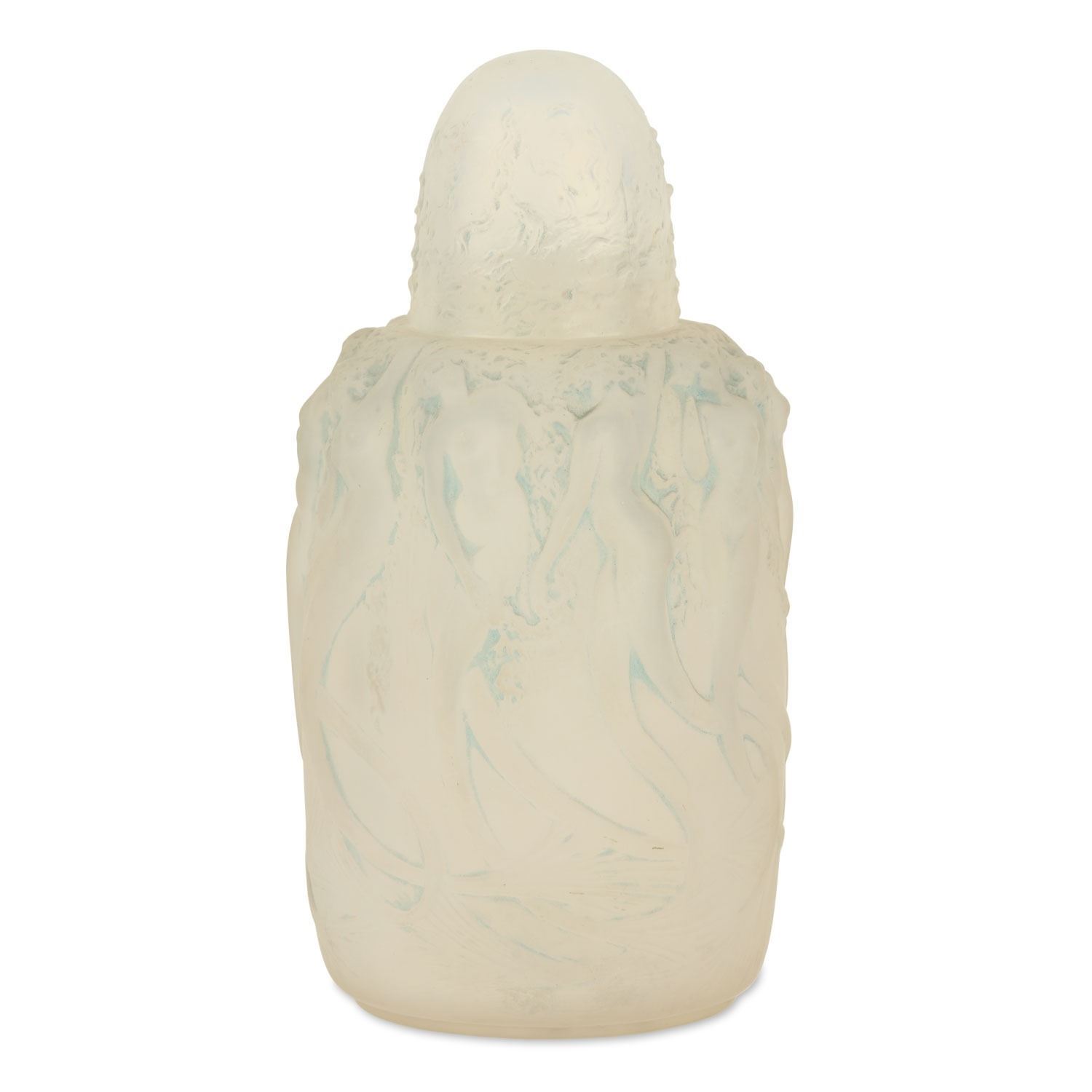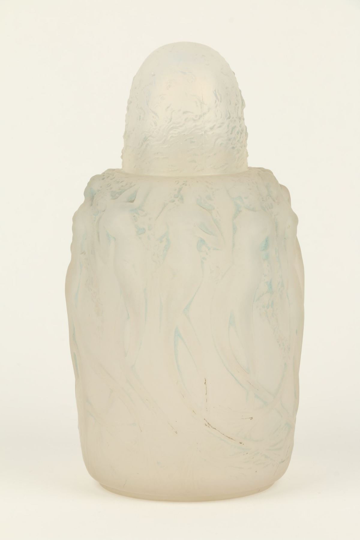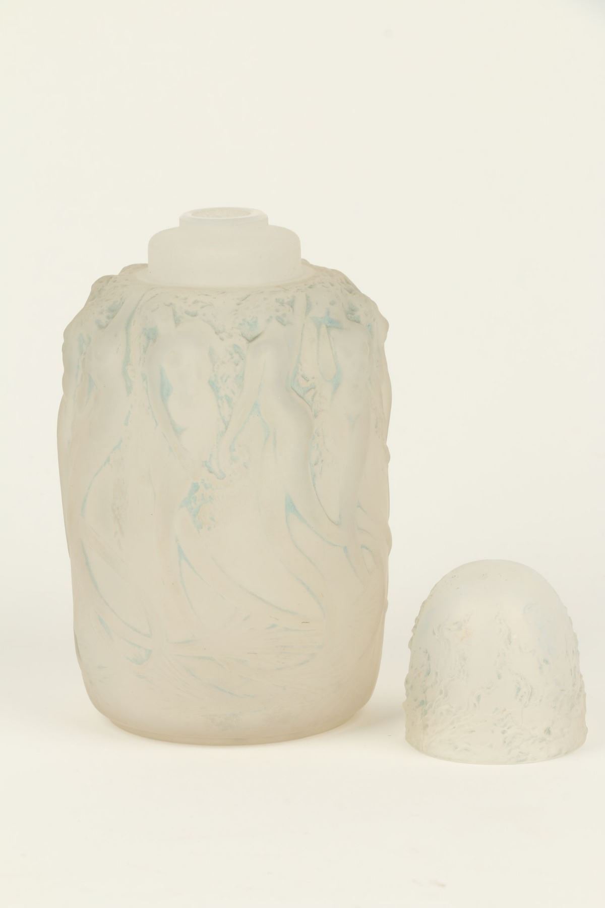 Lot 310 - Circa 1920. French. Rare. Frosted opalescent glass with blue highlights. Includes correct embossed cap. Embossed script signature, "R. Lalique France". Base. 6.75" x 3" x 3". $1200-1500.
