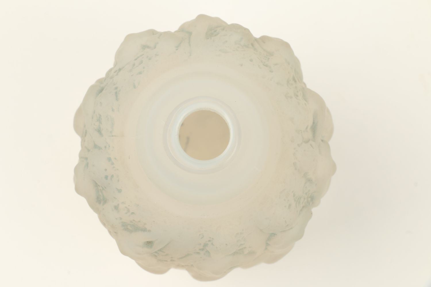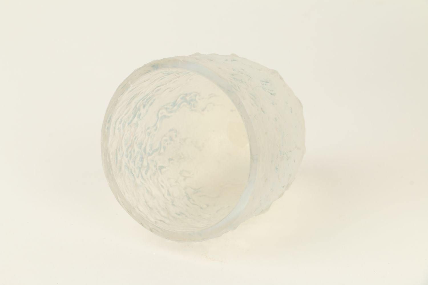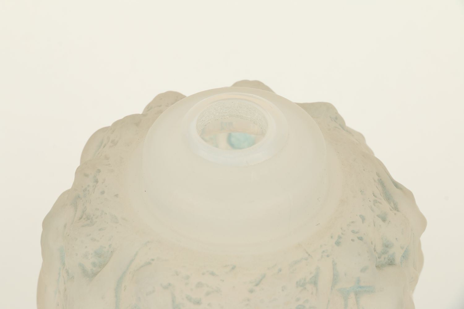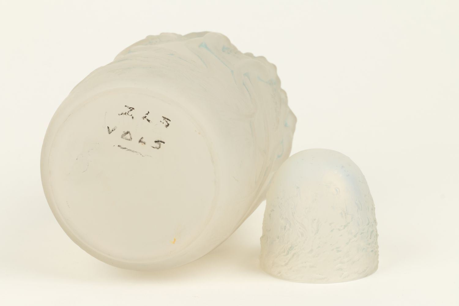 Lot 310 - Circa 1920. French. Rare. Frosted opalescent glass with blue highlights. Includes correct embossed cap. Embossed script signature, "R. Lalique France". Base. 6.75" x 3" x 3". $1200-1500.