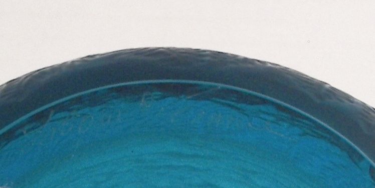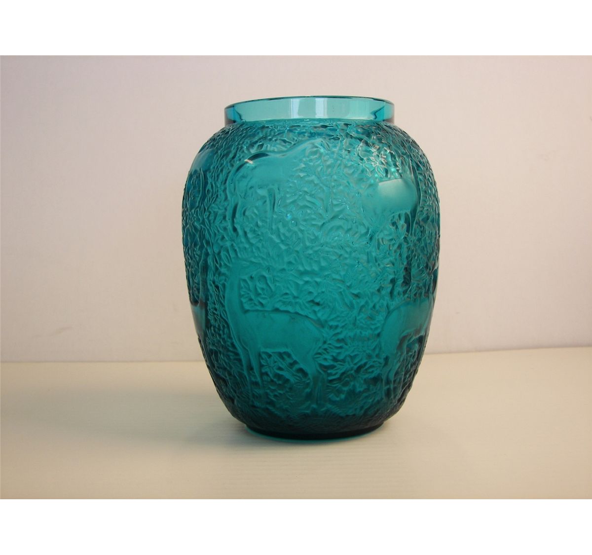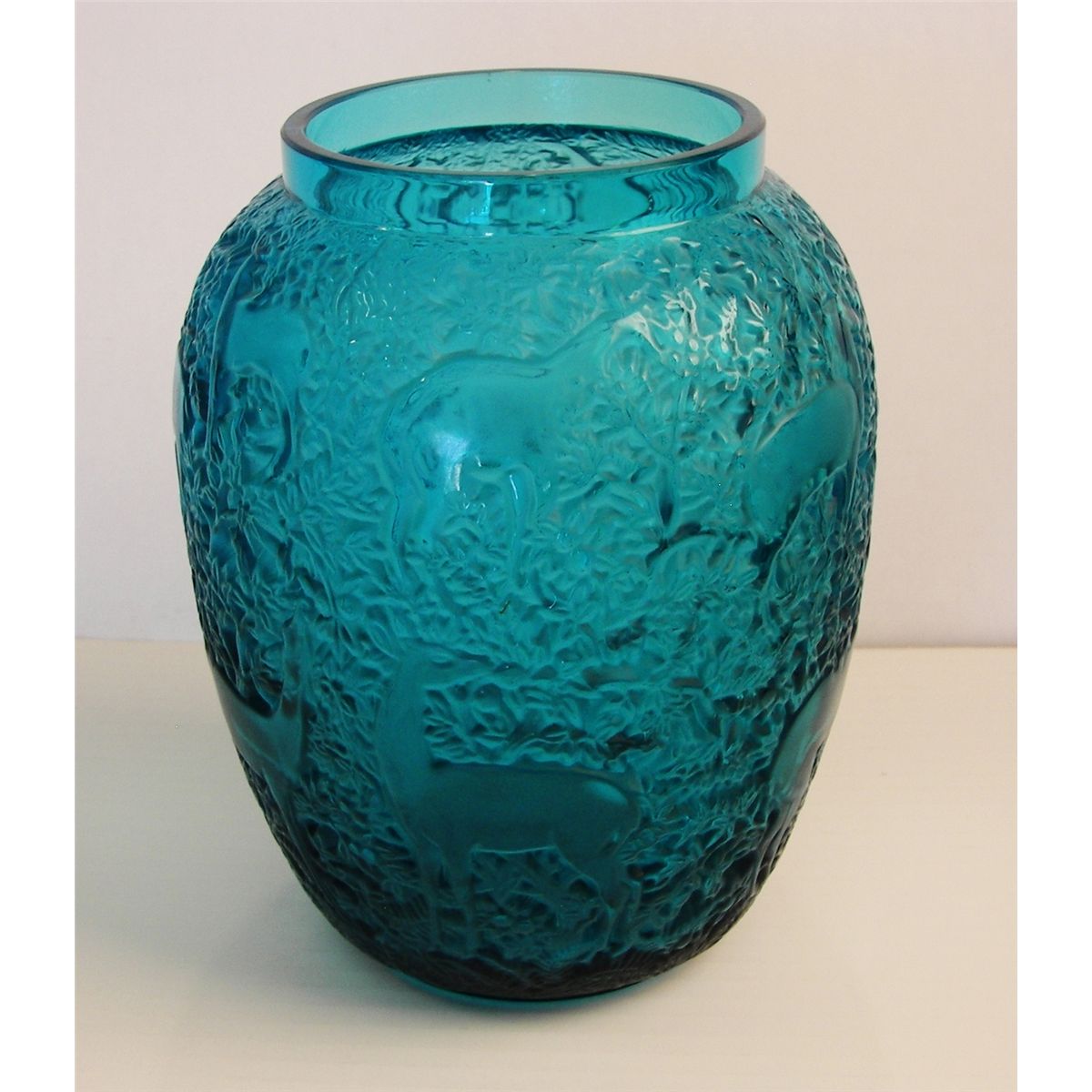Lalique vase, Lalique vase has allover intricate design of of deer standing against dense foliage., Signed R. Lalique France, 7”, Vase is done in rich turquoise blue glass,