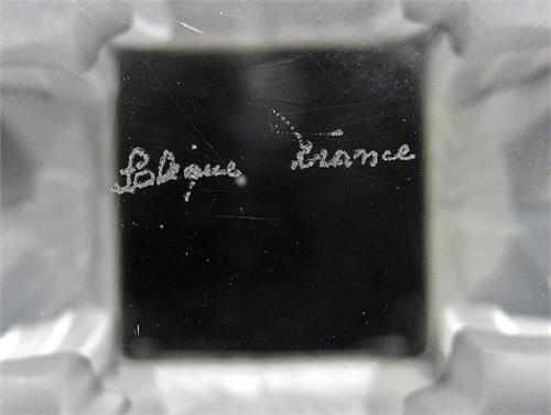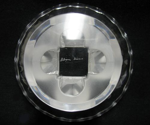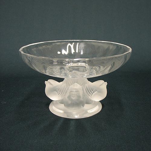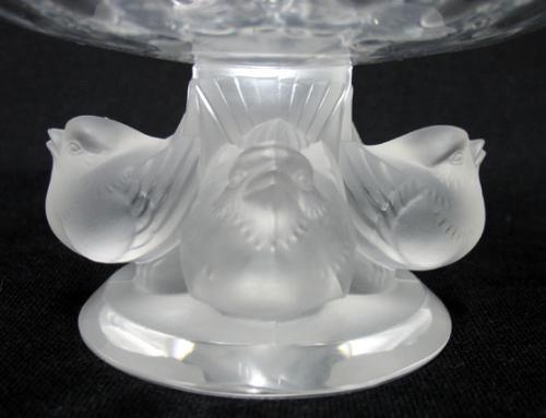 Lalique crystal compote; frosted standard with four birds facing outwards on round base; diamond point etched Lalique France on bottom; after 1945; 3 1/4" high x 5 1/2" diameter (very small chips on rim)