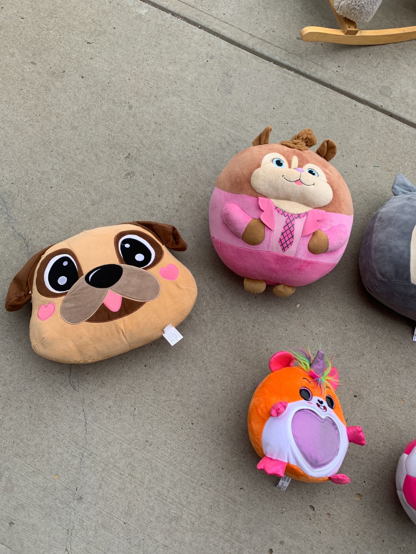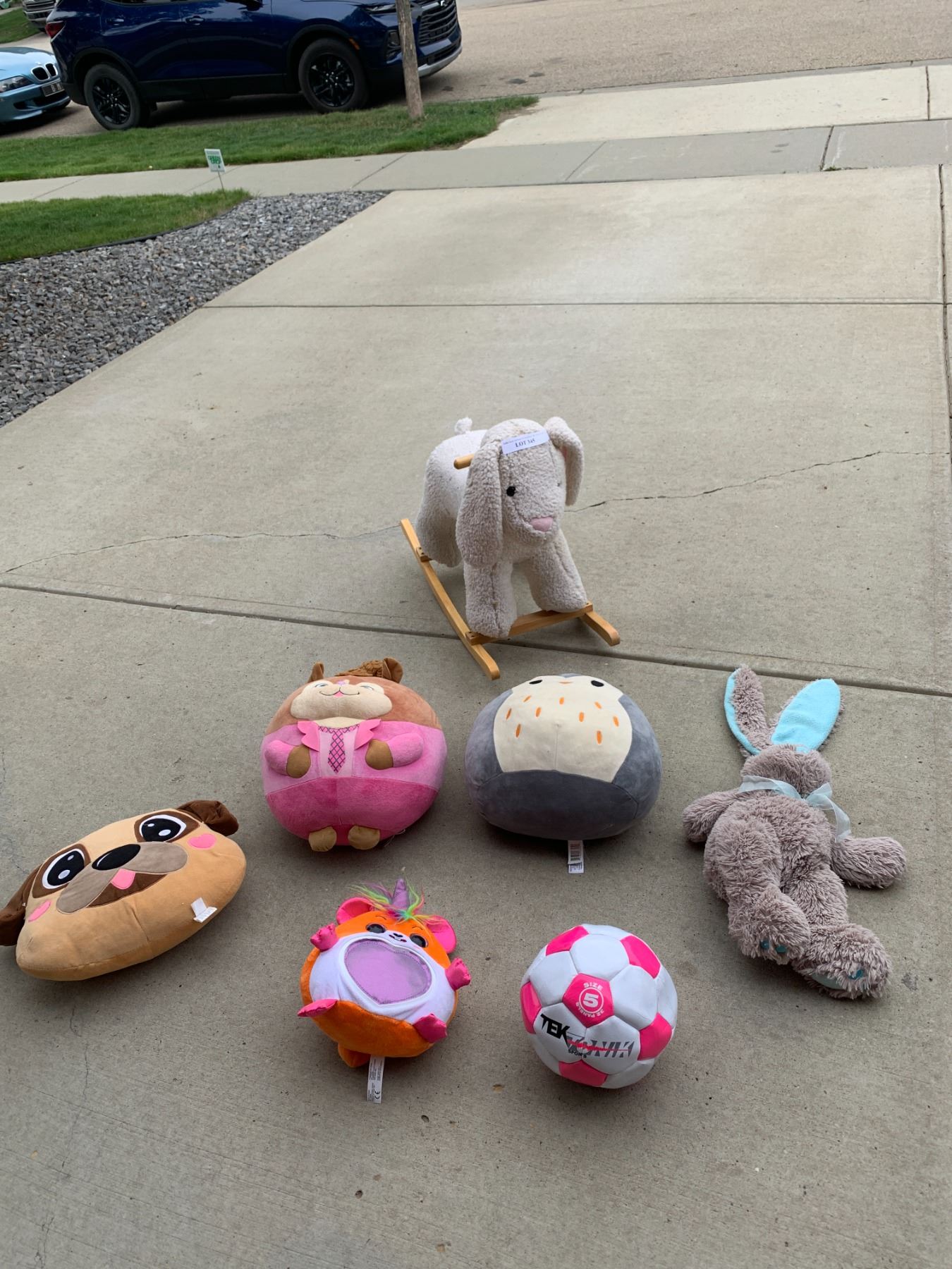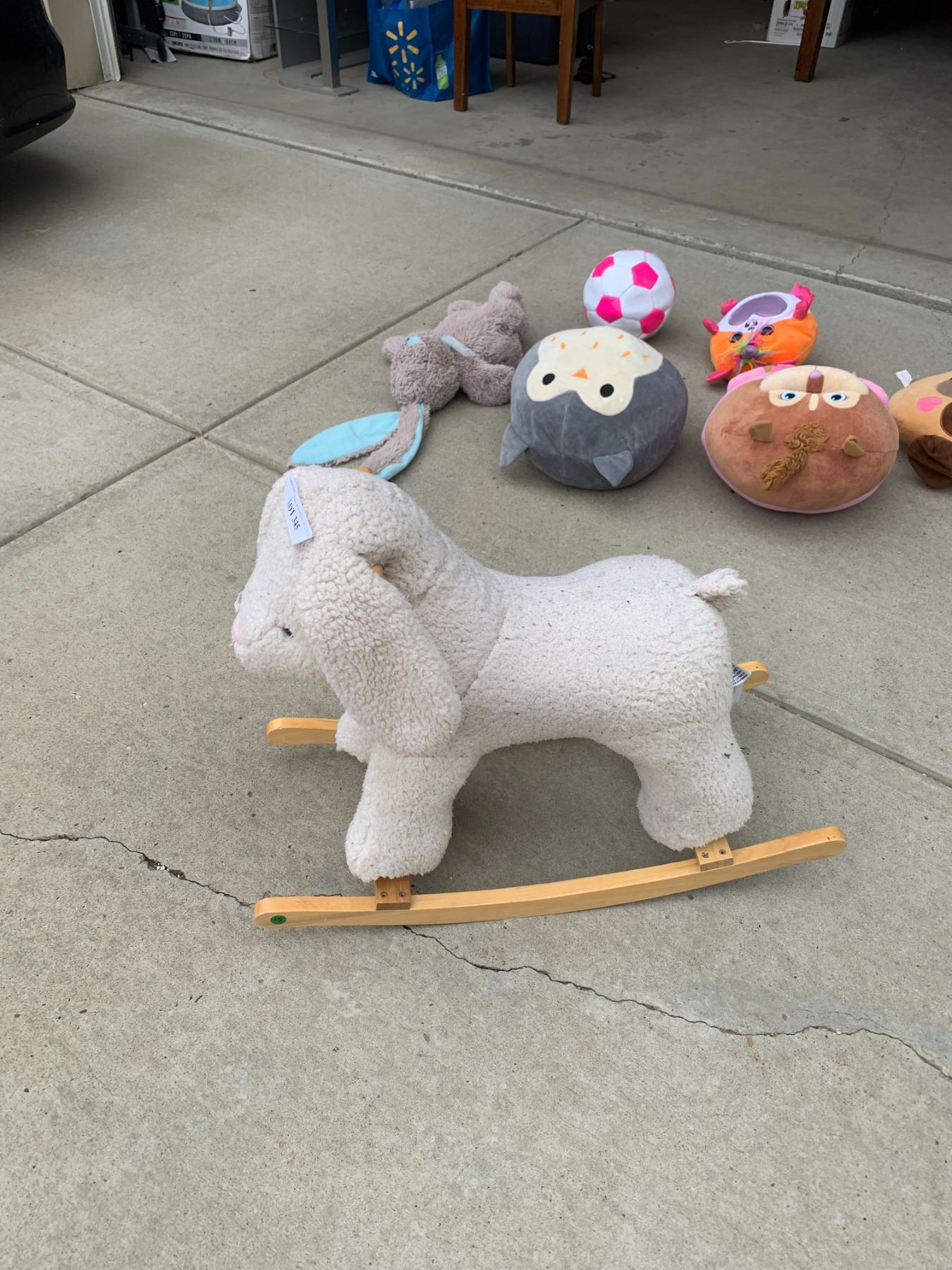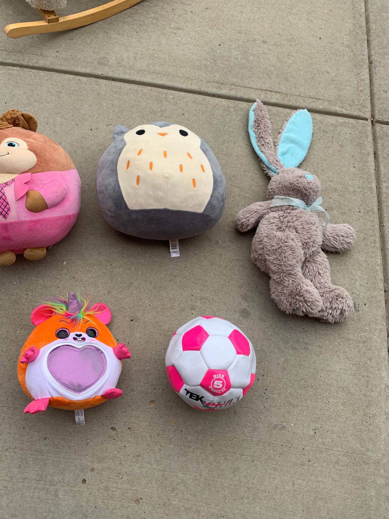 Lamb Rocker, Pink Soccer Ball & Asst Stuffed Animals