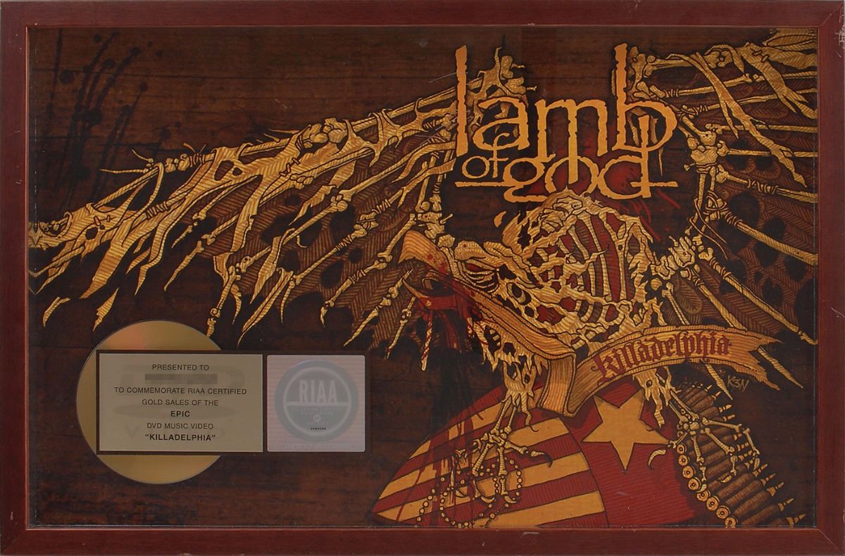 Official serial number hologram-style RIAA gold sales award presented “to commemorate RIAA certified gold sales of the Epic DVD music video ‘Killadelphia.’” Attractively framed with its CD and plate against a background featuring the impressive DVD cover art to an overall size of 23.75 x 15.75. Award retains its original backing with a Jewel Box Platinum label. In fine condition.