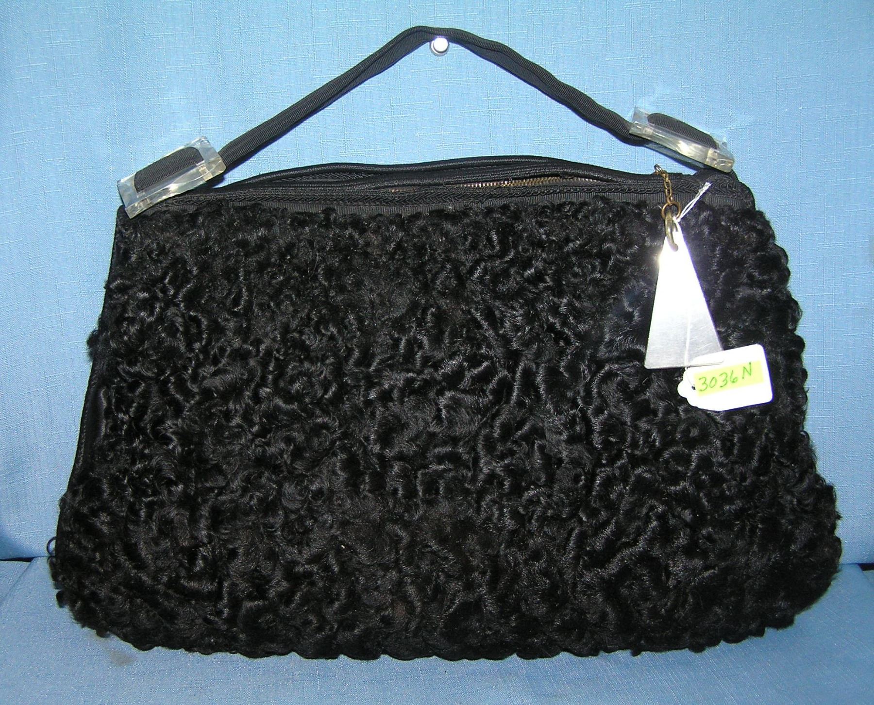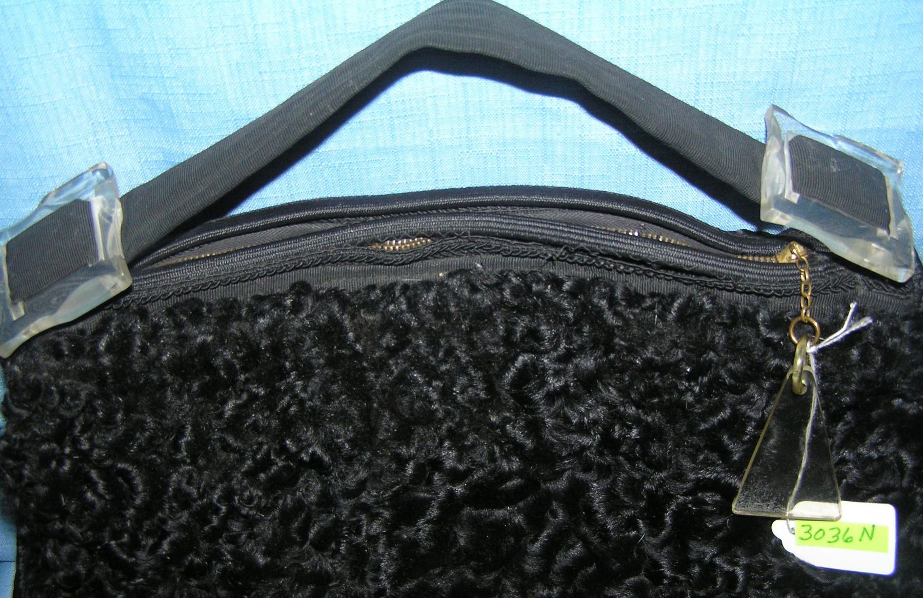 Antique lamb's wool pocket book with clear lucite strap buckles and trim circa 1930's est. value $125.00-$150.00