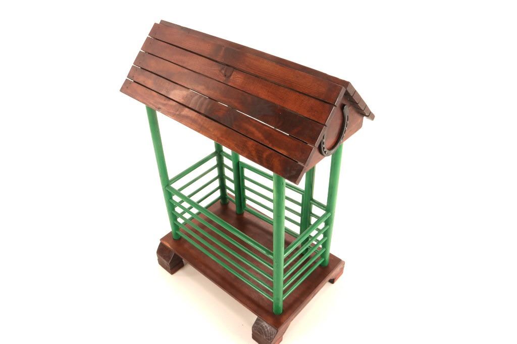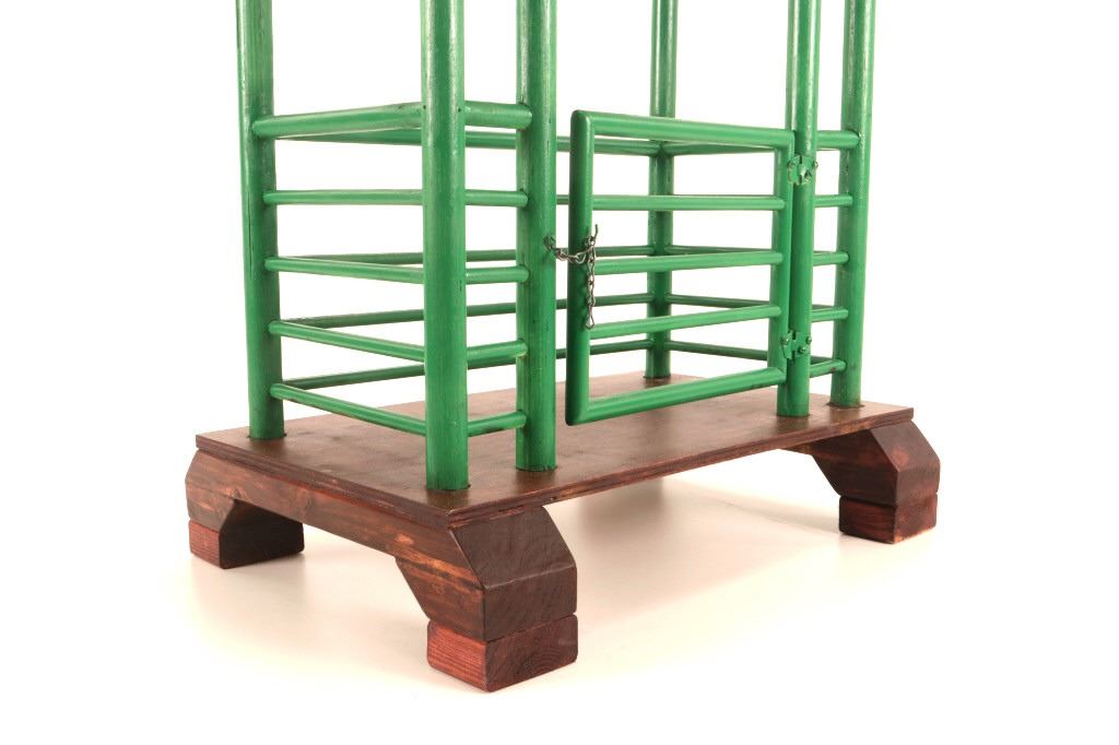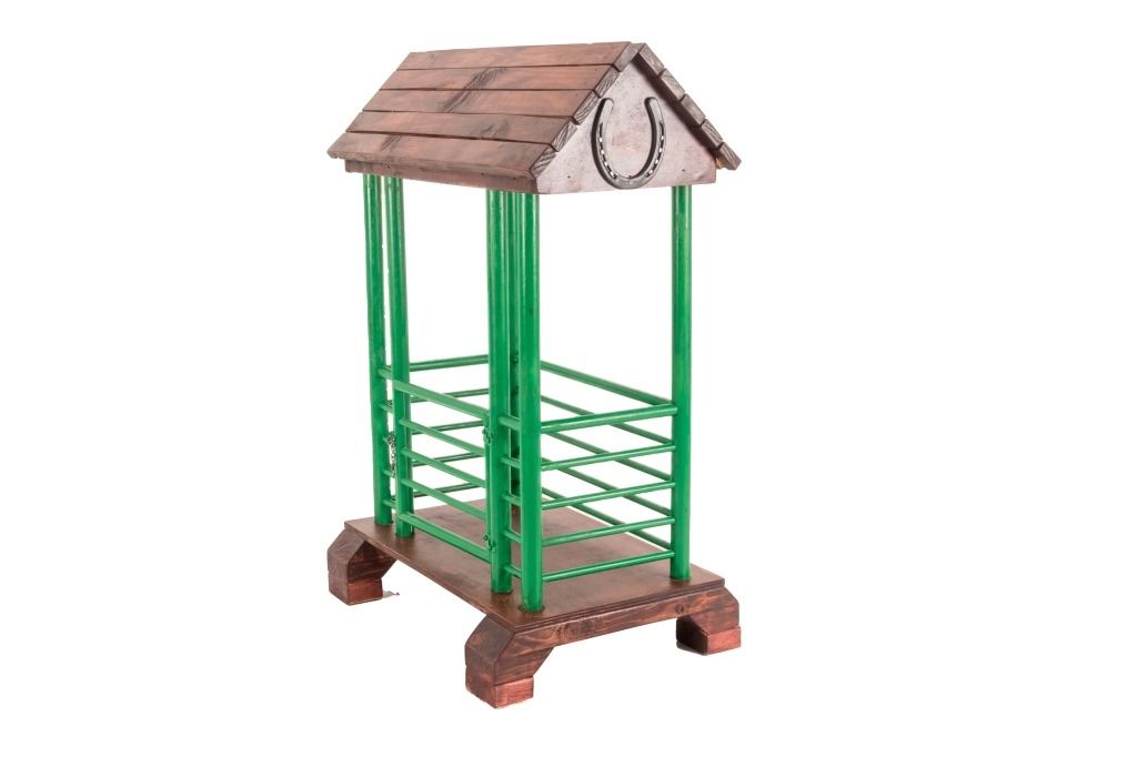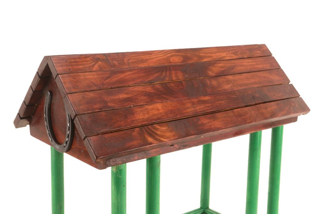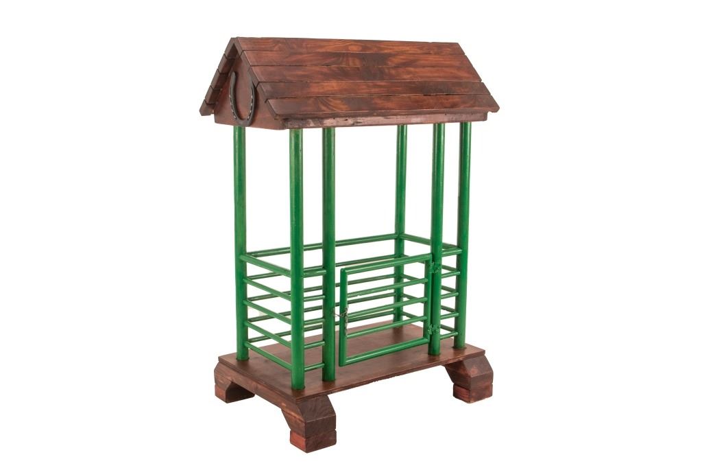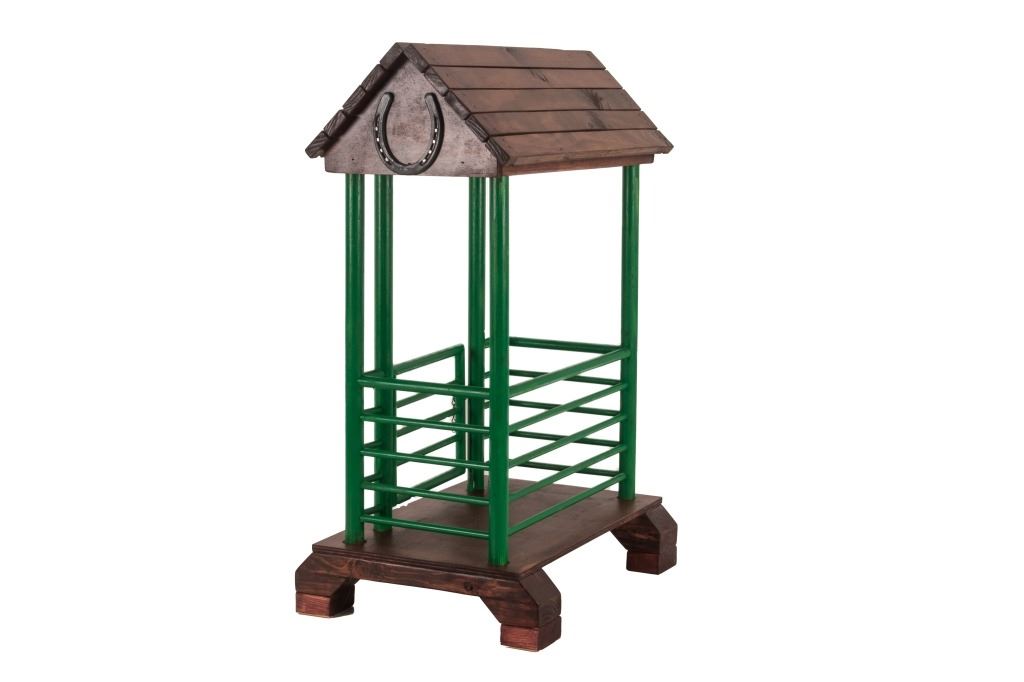The lot features a custom, handmade, carved wooden saddle stand from George Lambert. The saddle stand shows a hand carved Priefert style frame with carved wooden, green painted bucking chute. The stand also features an inlaid horse shoe posted for luck on both sides of the stand in the center. The stand is finished with a custom stained roof top resembling a homestead barn setting with Priefert chute decoration. The piece was hand crafted after a friendly barn setting with wonderful attention to detail; the stand has a custom design and the highest quality. The bucking corral round up stand was paired with the Custom Lambert Saddle valued at over $5,000. The stand measures overall 27" x 14" x 38".