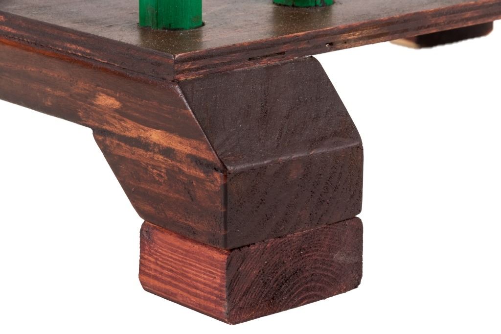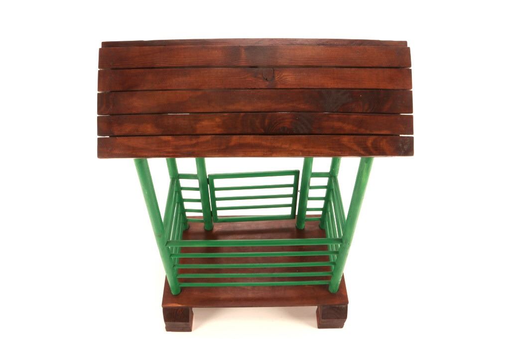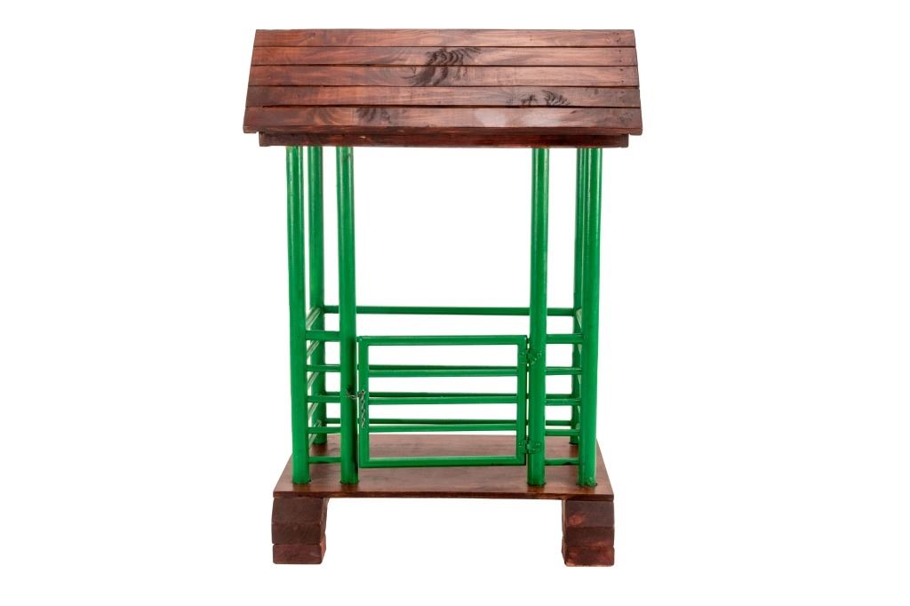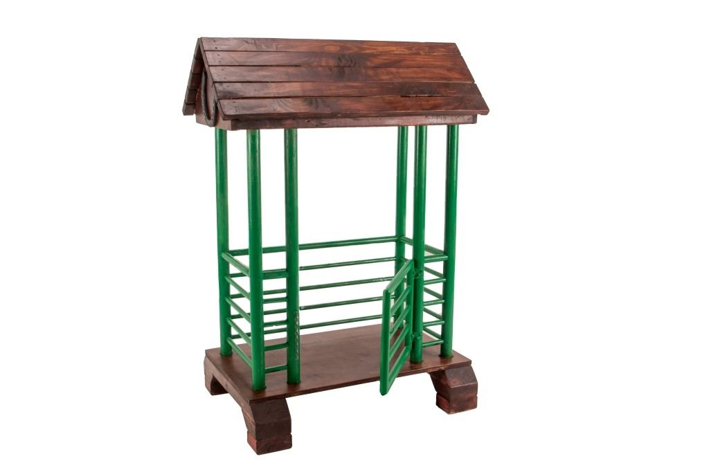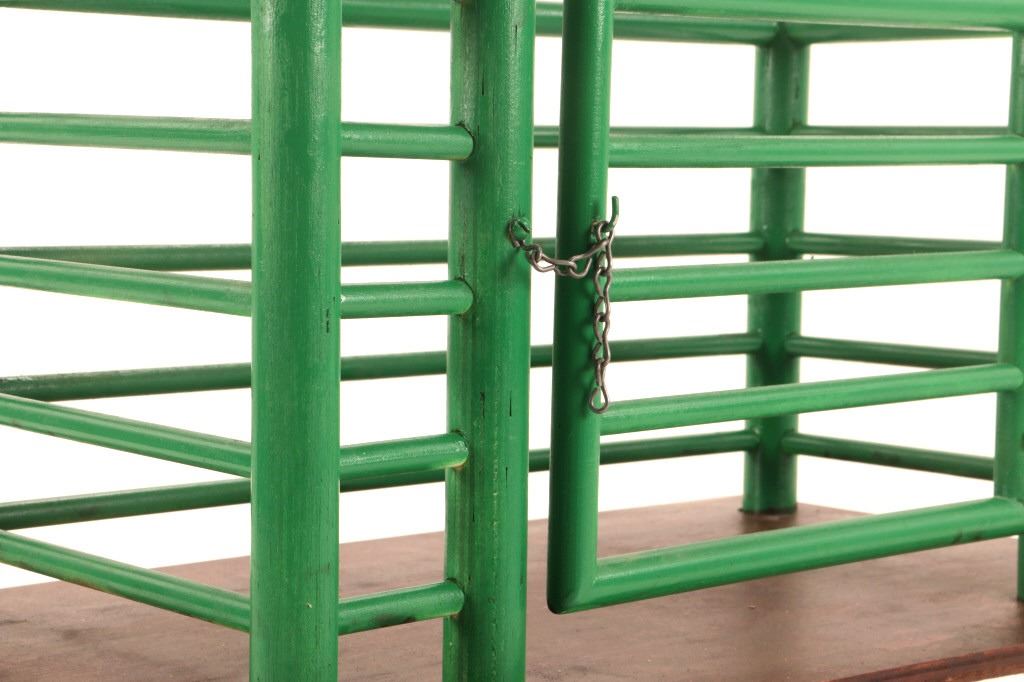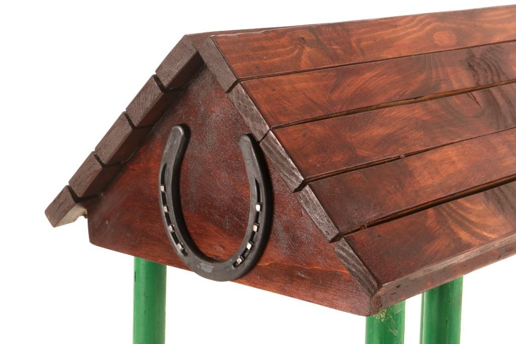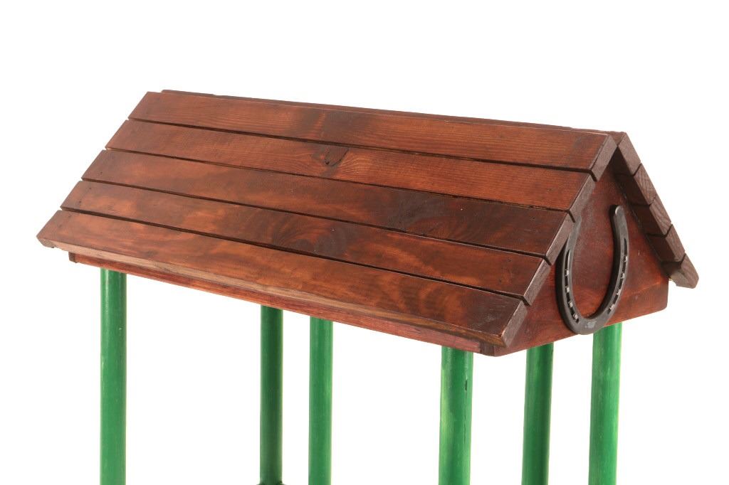 The lot features a custom, handmade, carved wooden saddle stand from George Lambert. The saddle stand shows a hand carved Priefert style frame with carved wooden, green painted bucking chute. The stand also features an inlaid horse shoe posted for luck on both sides of the stand in the center. The stand is finished with a custom stained roof top resembling a homestead barn setting with Priefert chute decoration. The piece was hand crafted after a friendly barn setting with wonderful attention to detail; the stand has a custom design and the highest quality. The bucking corral round up stand was paired with the Custom Lambert Saddle valued at over $5,000. The stand measures overall 27" x 14" x 38".
