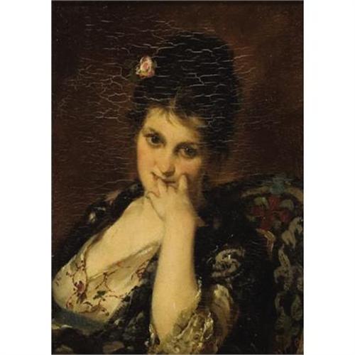 <B>LAMBERT LINDER (German, 1841-1889)</B></I><BR><I>Contemplation Eine Junge Munchnerin</B></I>, 1871<BR>Oil on board<BR>8-1/4 x 6 inches (21.0 x 15.2 cm)<BR>Signed lower right:<I> L. Linder/71</B></I><BR> Supplier's stamp verso:<I> Maltisch & Farben-Fabrik/Richard Wurm/Muchen</B></I><B>Condition Report:</B> Craqueulure throughout, framed.<BR><BR><b>Shipping:</b> Framed - without Glass, Medium (<a target="_blank" href="http://www.heritageauctions.com/common/shipping.php">view shipping information</a>)