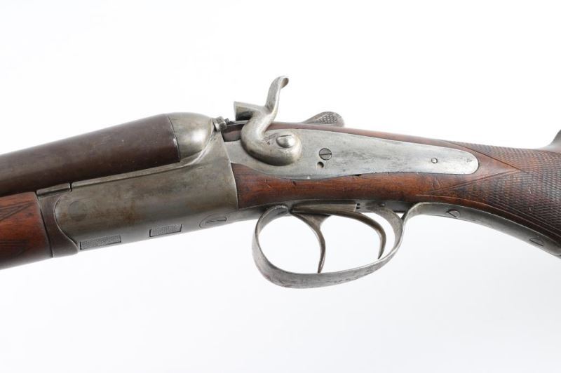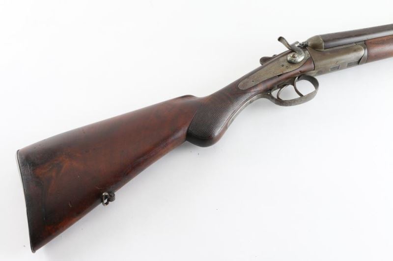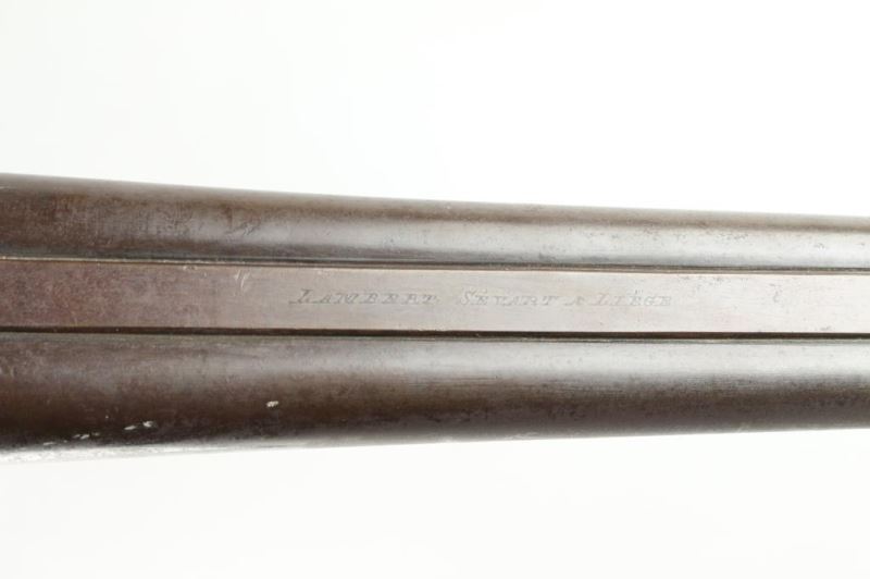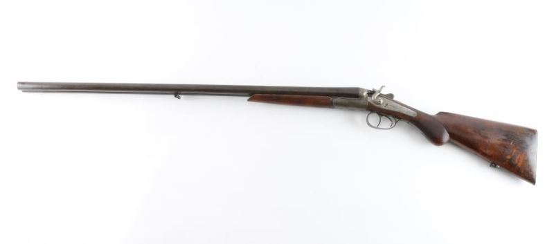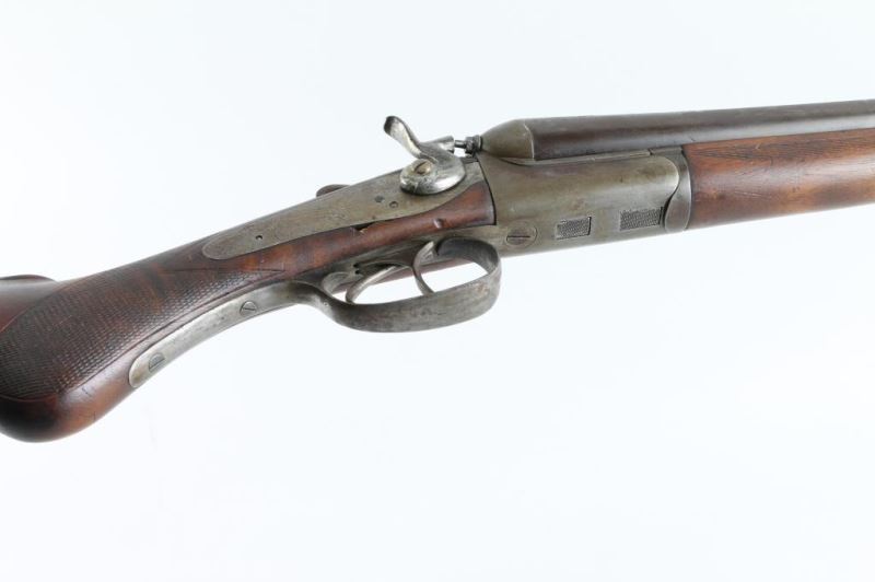 Belgian proofed double barrel side by side back lock shotgun features blued finish, case hardened action, 30" barrels, CYL chokes, brass bead, sling swivels, extractor, exposed hammers, double triggers, top lever opening, smooth walnut splinter forend, checkered walnut shoulder stock with round knob grip, smooth metal buttplate. Bores are good or better. Barrels show majority coverage of a brown color finish, with edge losses, some rought textured patina. Action is silvery gray color with some scattered brown patina. Wood is generally good with some small cracks showing around tang. Locks operate with some stickiness, hammers are a bit loose, left lock may not be in firing condition. Barrel & water table have matching assembly marks. Water table shows what appears a more recent stamping of letters, maybe a name, over-stamped & not readable. Condition is NRA Good *** C&R Firearm ***