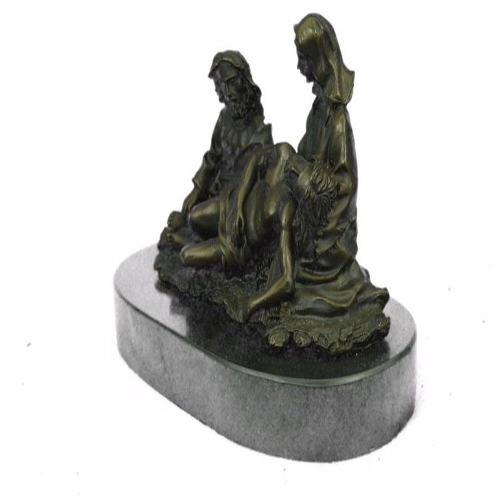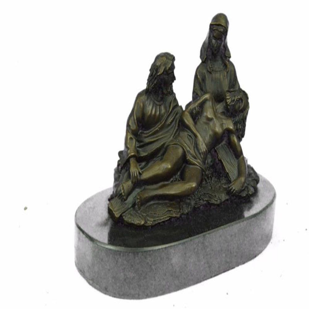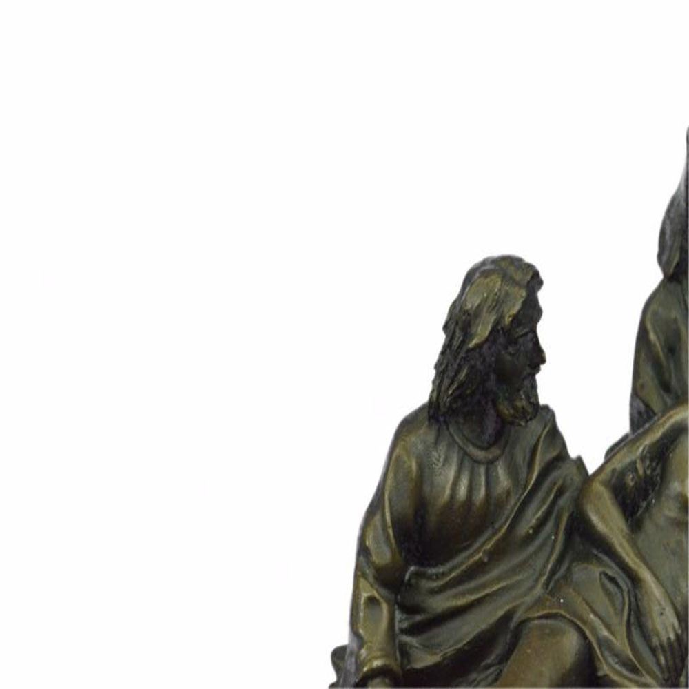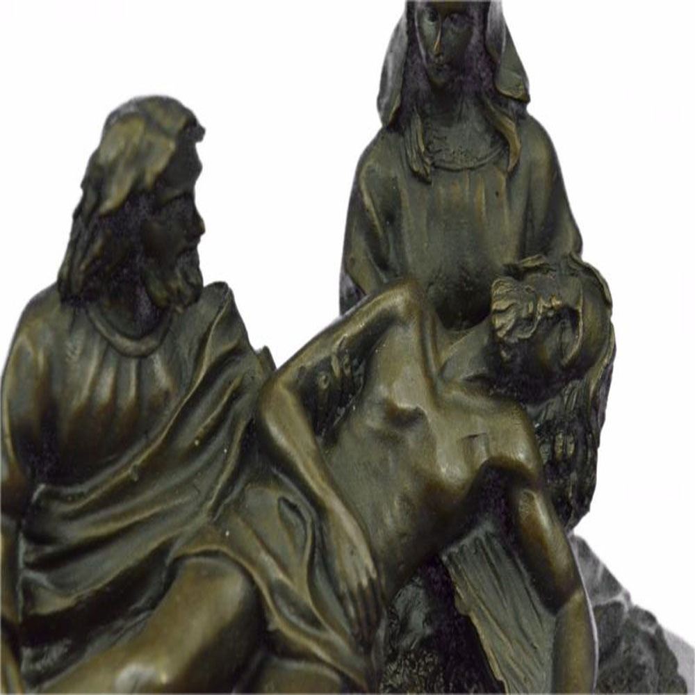 The Lamentation Christ in prone position, his sinister arm being cradled by the Virgin Mary who is at left, Kneeling front of Christ, Mary Magdalene cradles Christ feet, This sculpture stands on a marble base and the ancient lost wax method was used to craft this piece. Bronze Dimensions with Marble Base: Height 6 X Width 8 inches. Weight: 7 LBS.