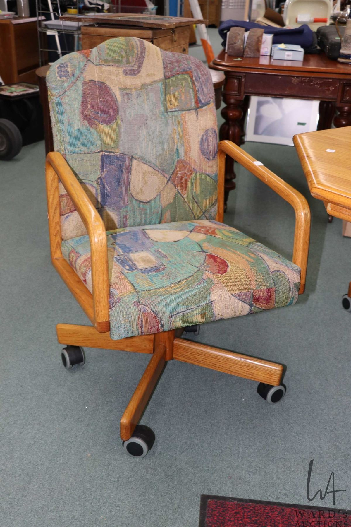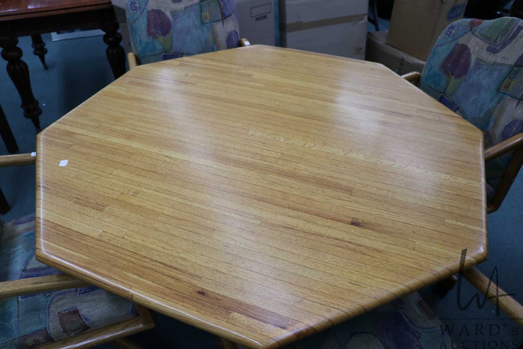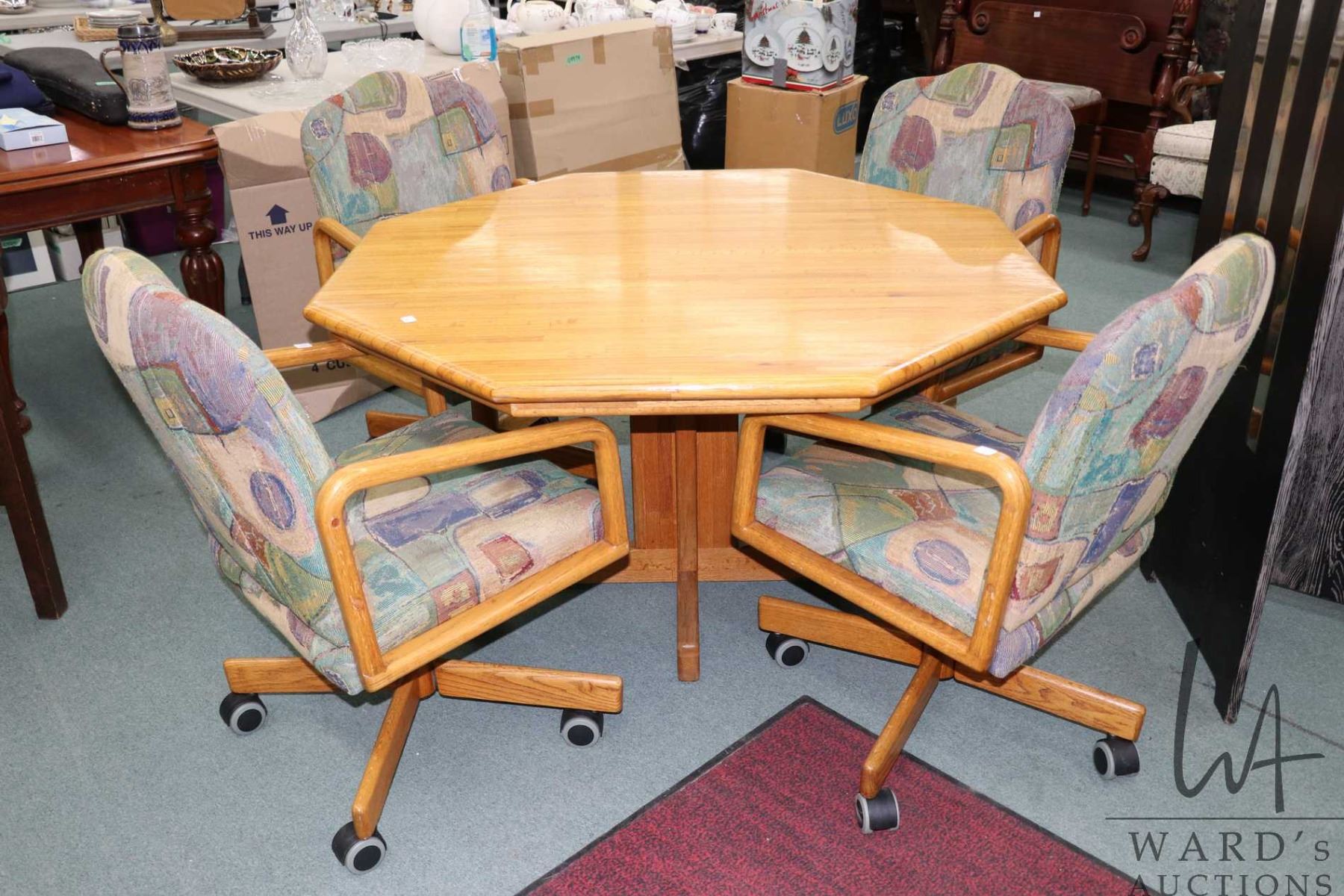 Laminated oak octagonal dining table with single pedestal 48" and plus four swivel chairs on castors