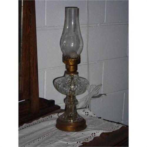 This is a glass oil lamp. It was repaired and electric cord was added. It has a metal pedestal.