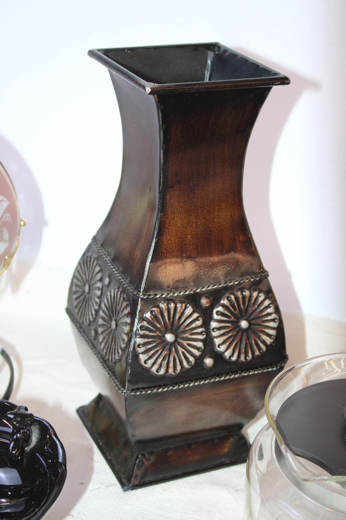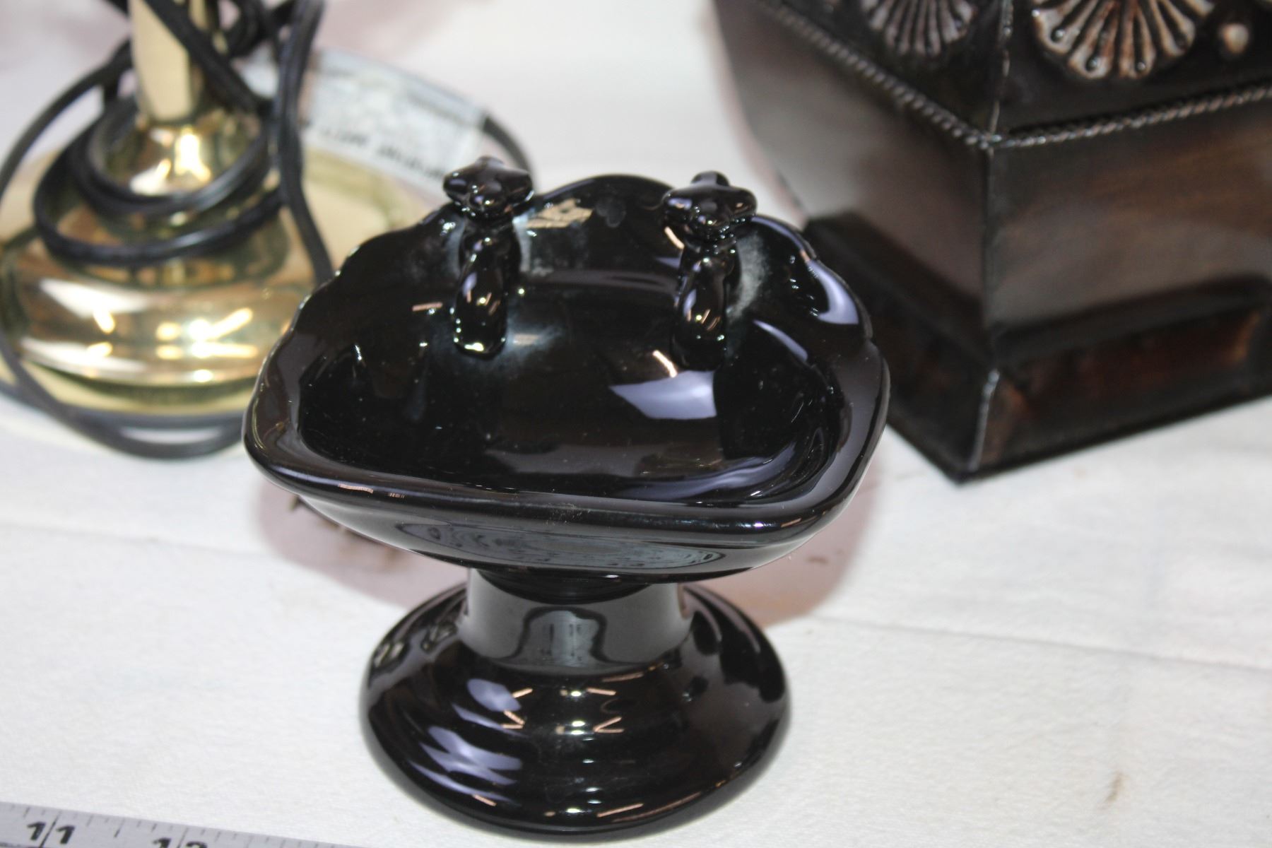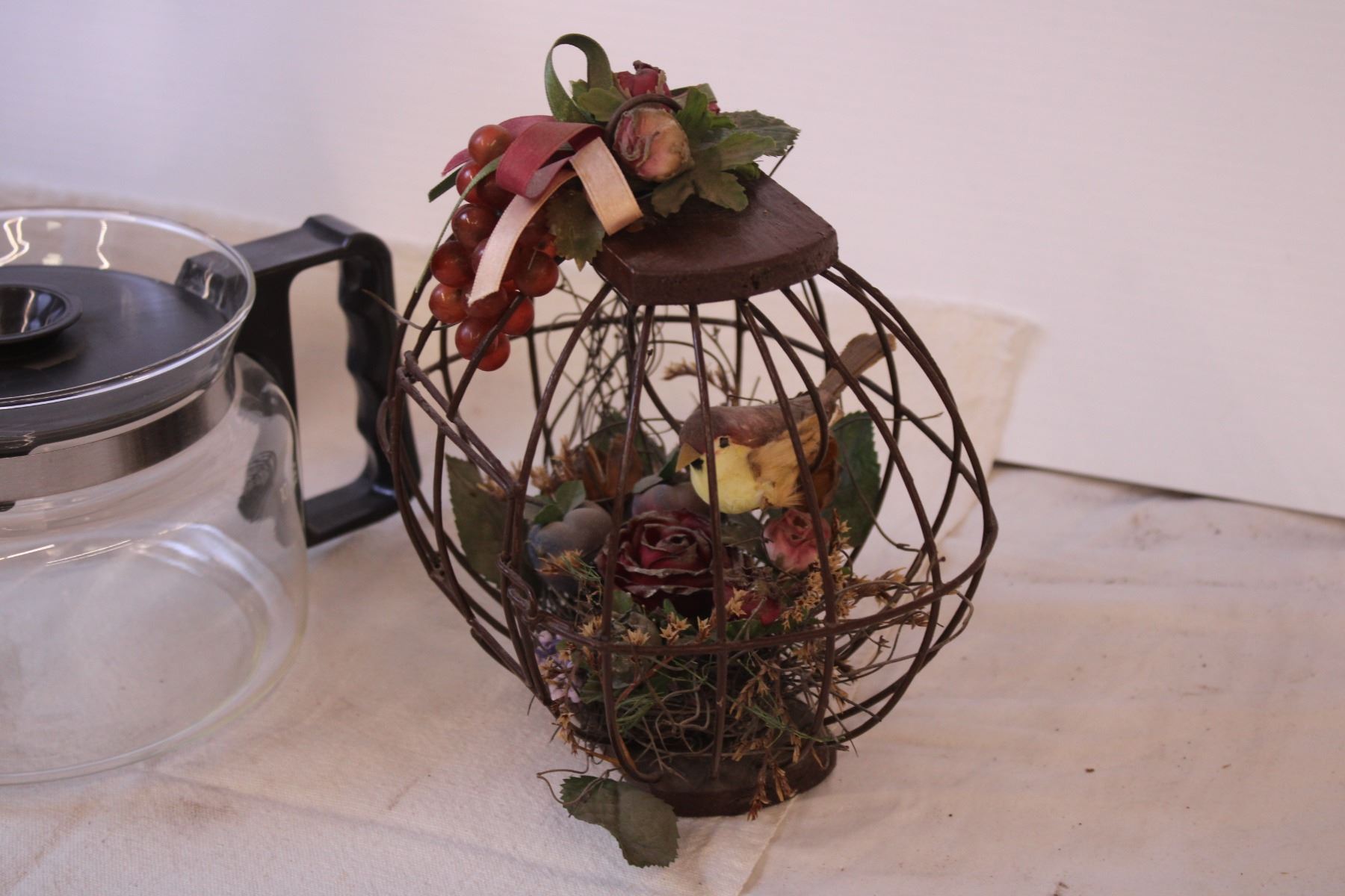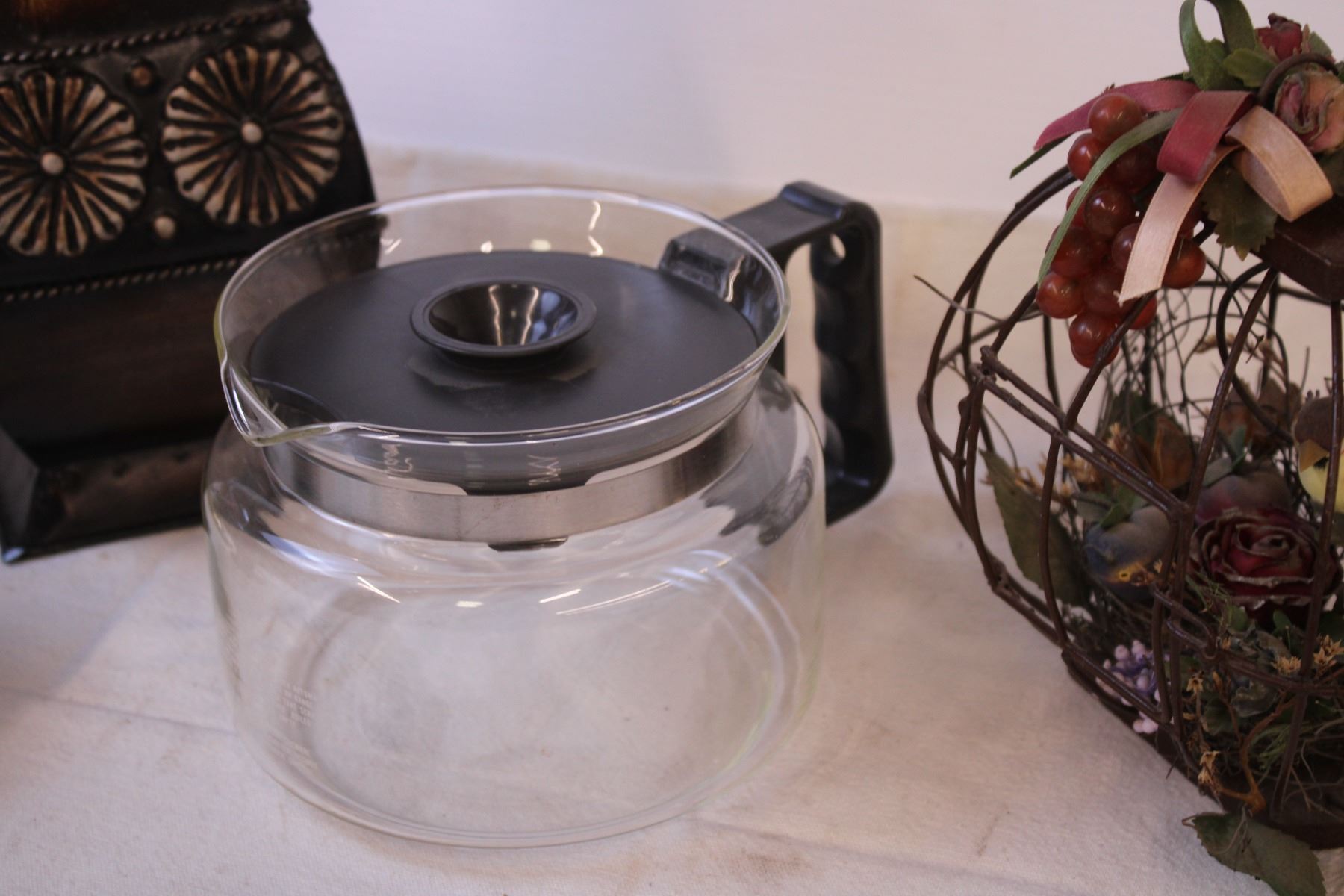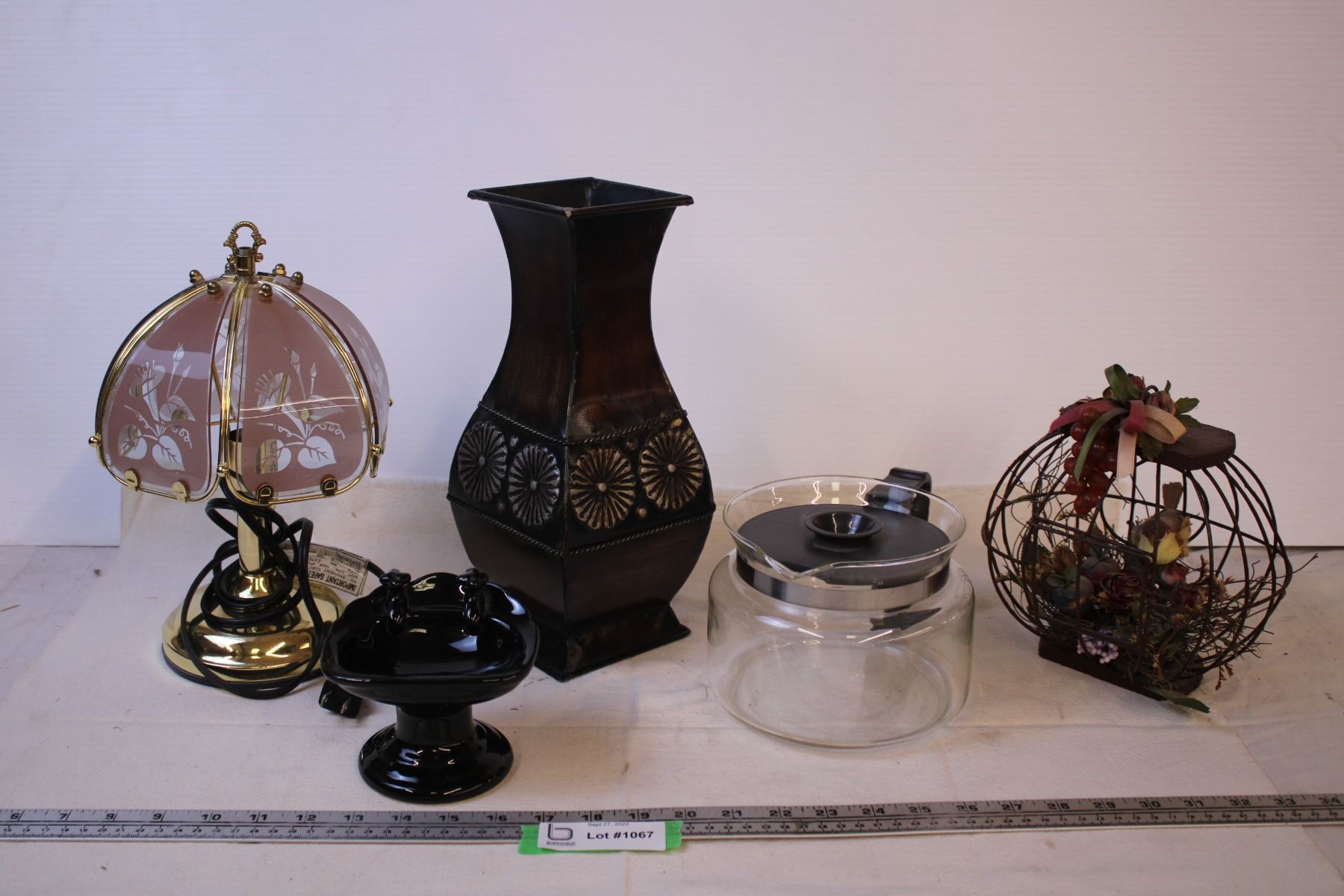Lamp, (3) Decor Items, and Coffee Pot