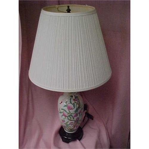 Lamp - Oriental style, pink design. Has a wooden base and white lampshade. 29?h, 16?w. In good condition. Maker and year unknown